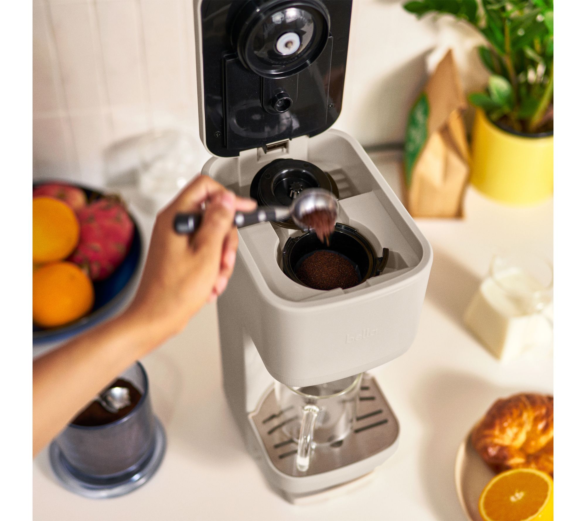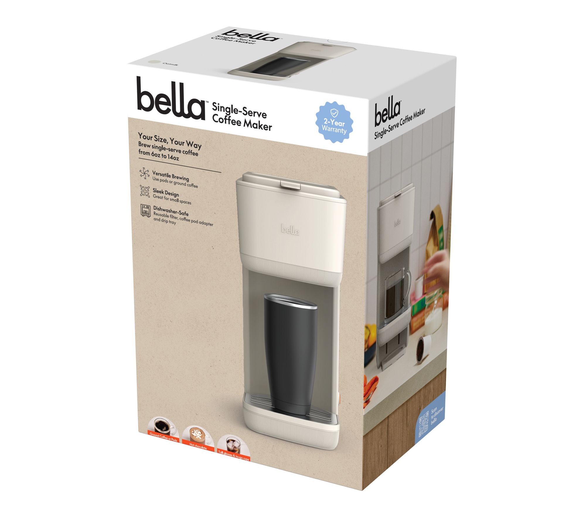 Start your morning with the aroma of fresh-brewed coffee personalized just for you -- whether you reach for grounds or your favorite pods, this single-serve coffee maker with water tank fits seamlessly into your routine. Its slim design and modern finish complement busy counters, while adjustable features accommodate both a quick cup or a travel mug (not included) for coffee on the go. From Bella.