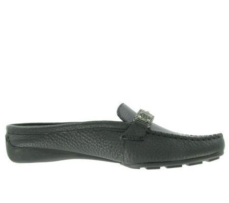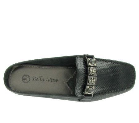 Thanks to soft leather construction and plush cushioned insoles, these mules let you take every step in stride. A decorative ornament accents the handstitched vamp, crafting a sharp look for work or weekend. From Bella Vita.