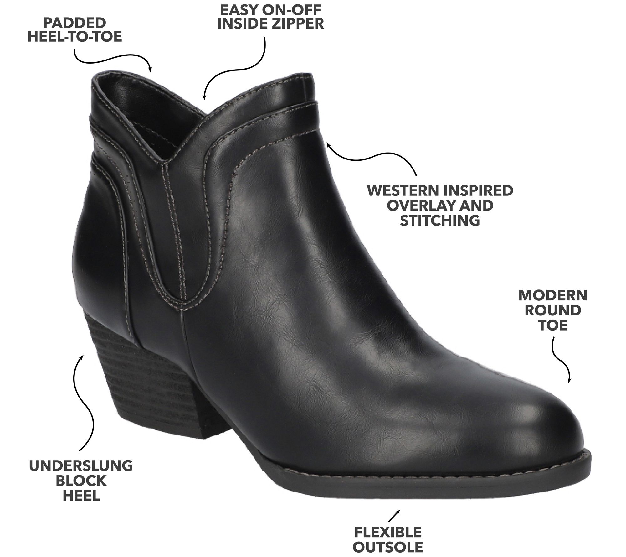 Side-zip closure, rounded toe