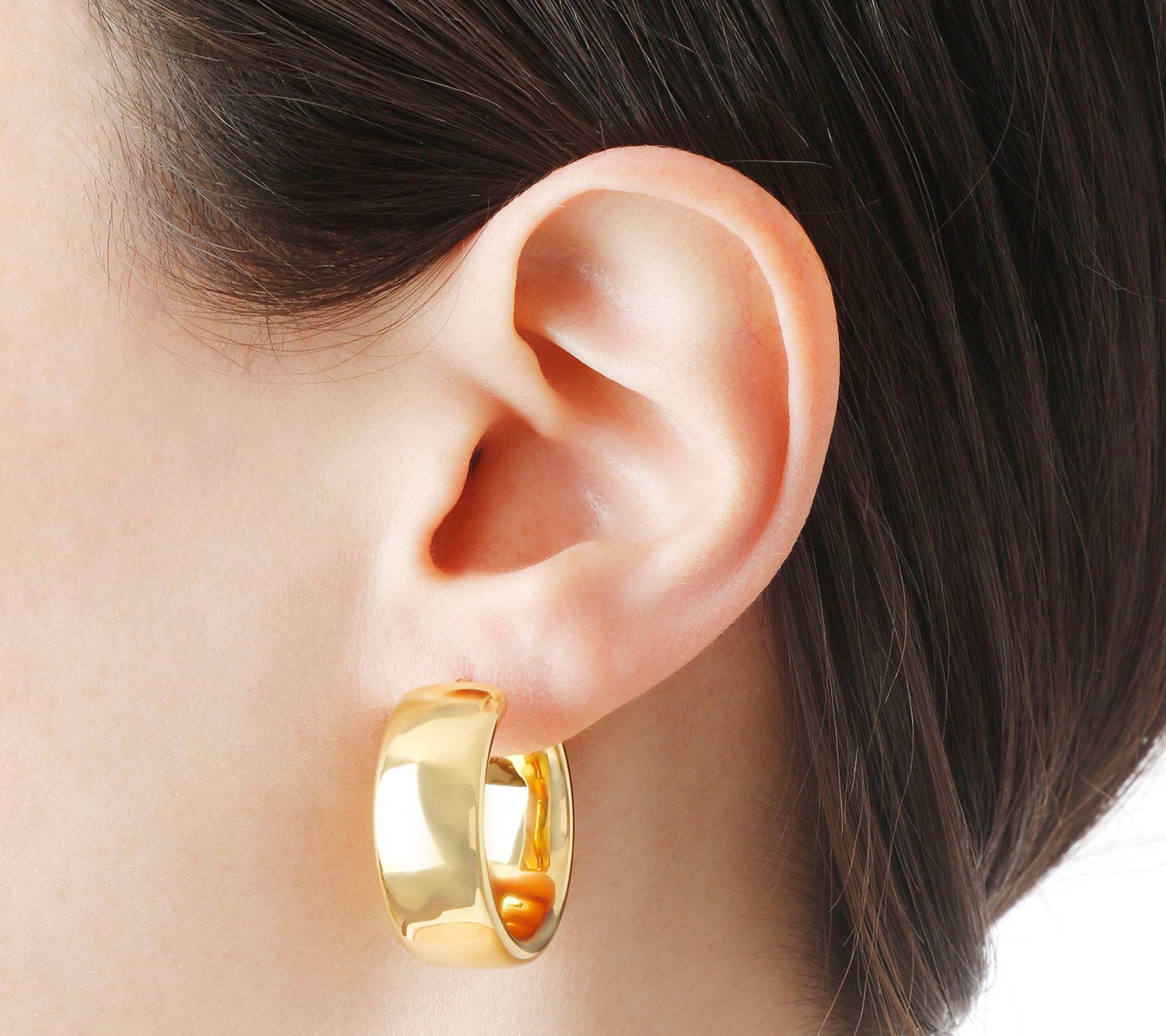 Boldly designed to make a statement but lightweight enough for all-day comfort, these hoop earrings are crafted with an inner core of resin and topped with electroformed 14K gold. From BellaOro.