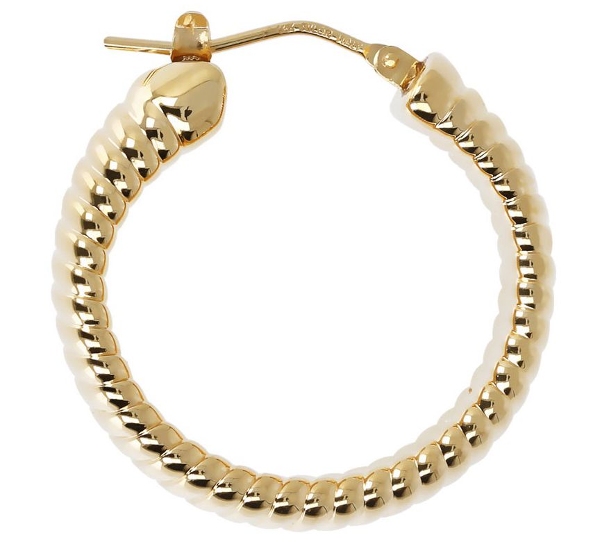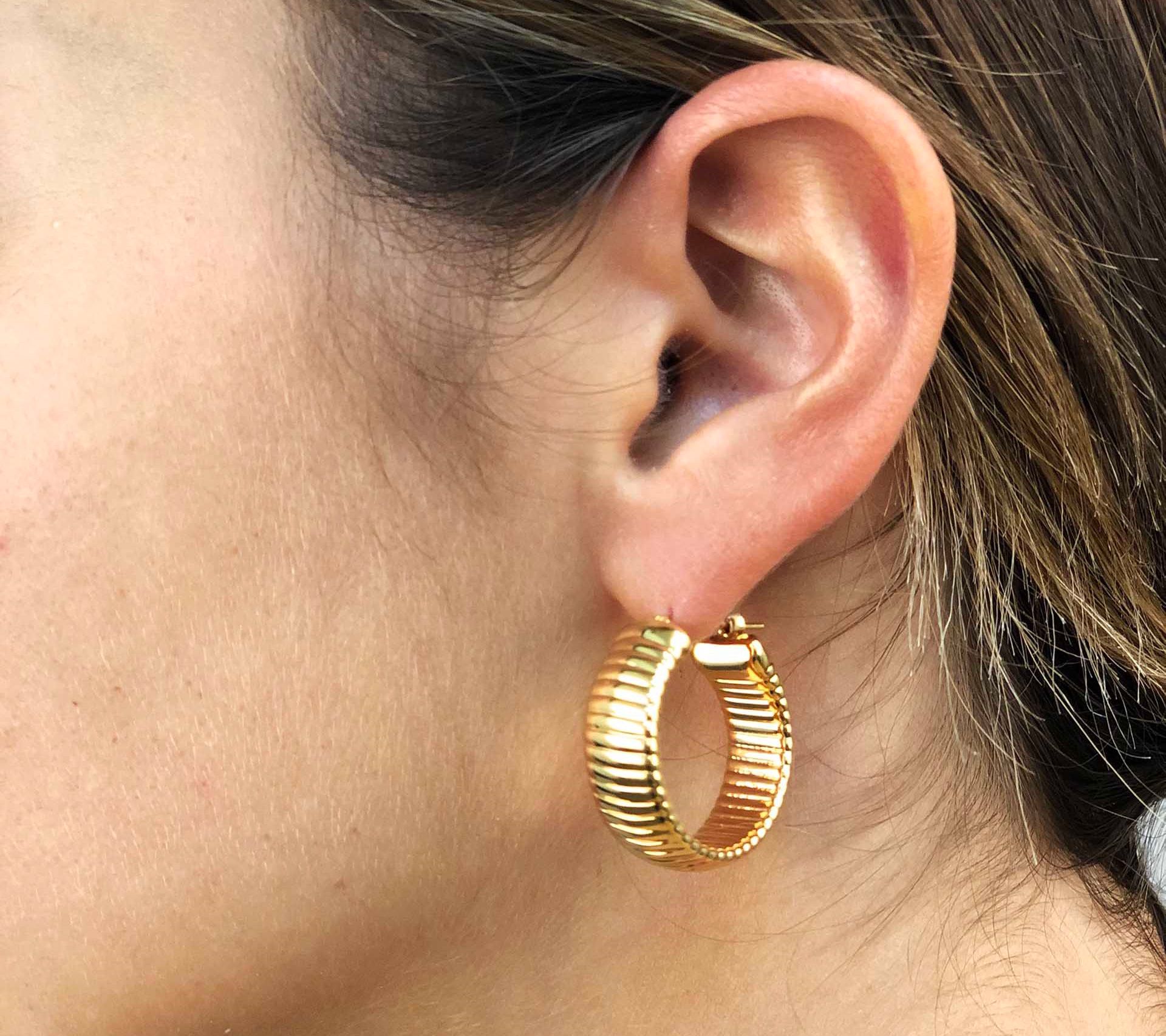 The texture of these polished hoops catches the light from every direction. From BellaOro.
