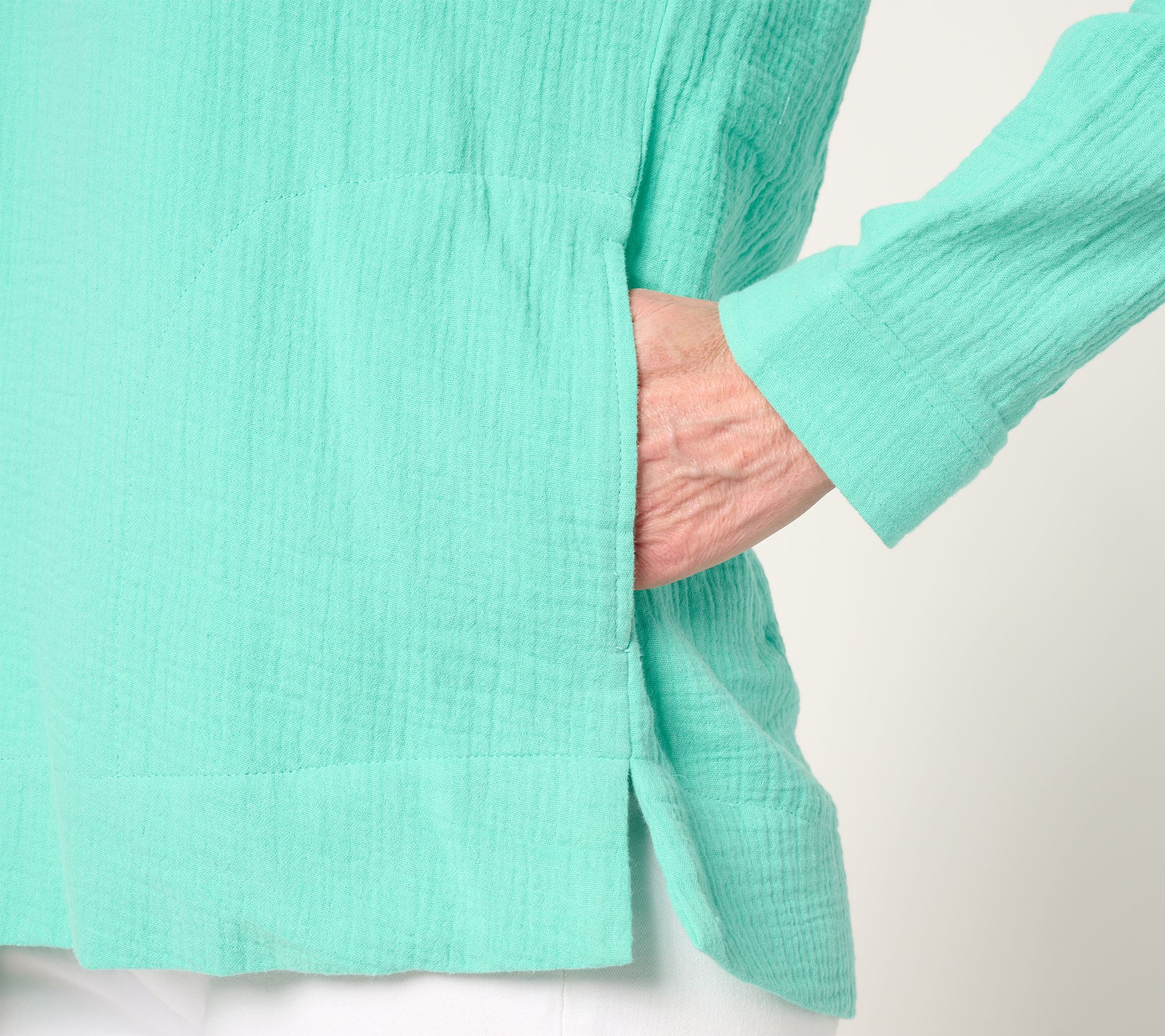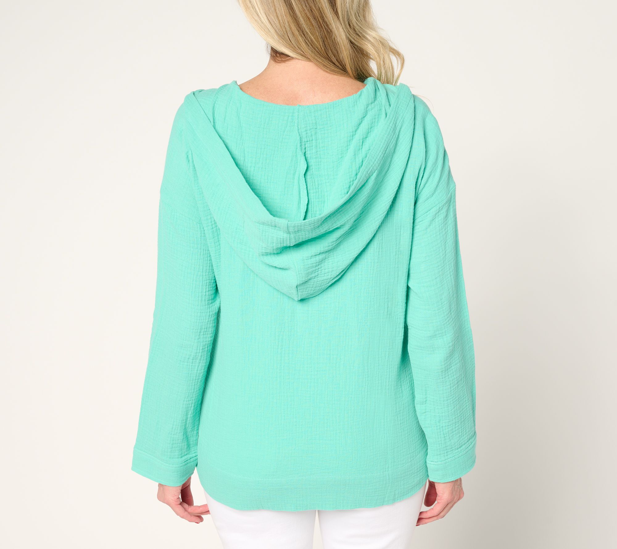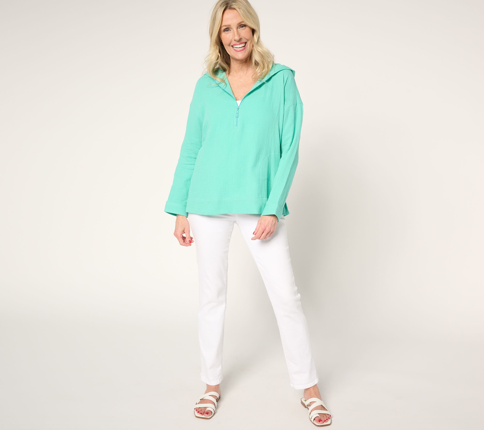 If your idea of clubbing involves a beach or a pool, this half-zip hoodie in Kim's yummy cotton gauze is your kind of layer. Note the no-stress fit and accommodating side slits that make moving between your chaise and the sand (or beach bar) a breeze. From Belle Beach by Kim Gravel.