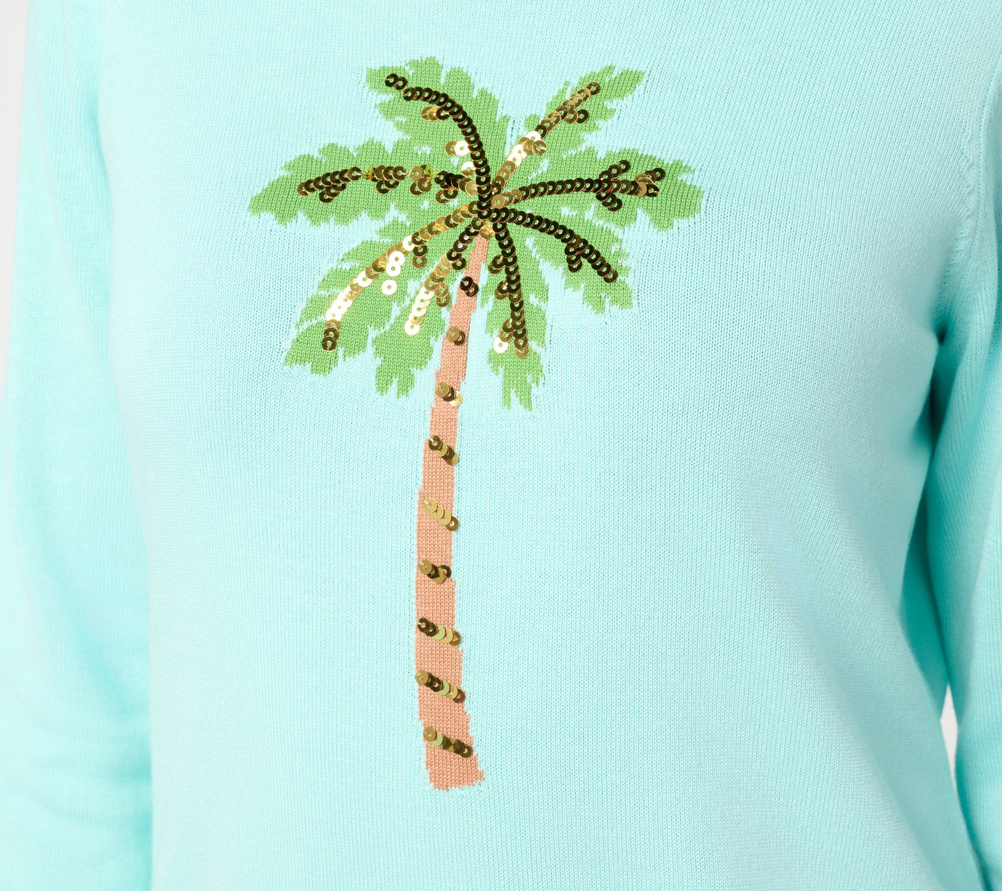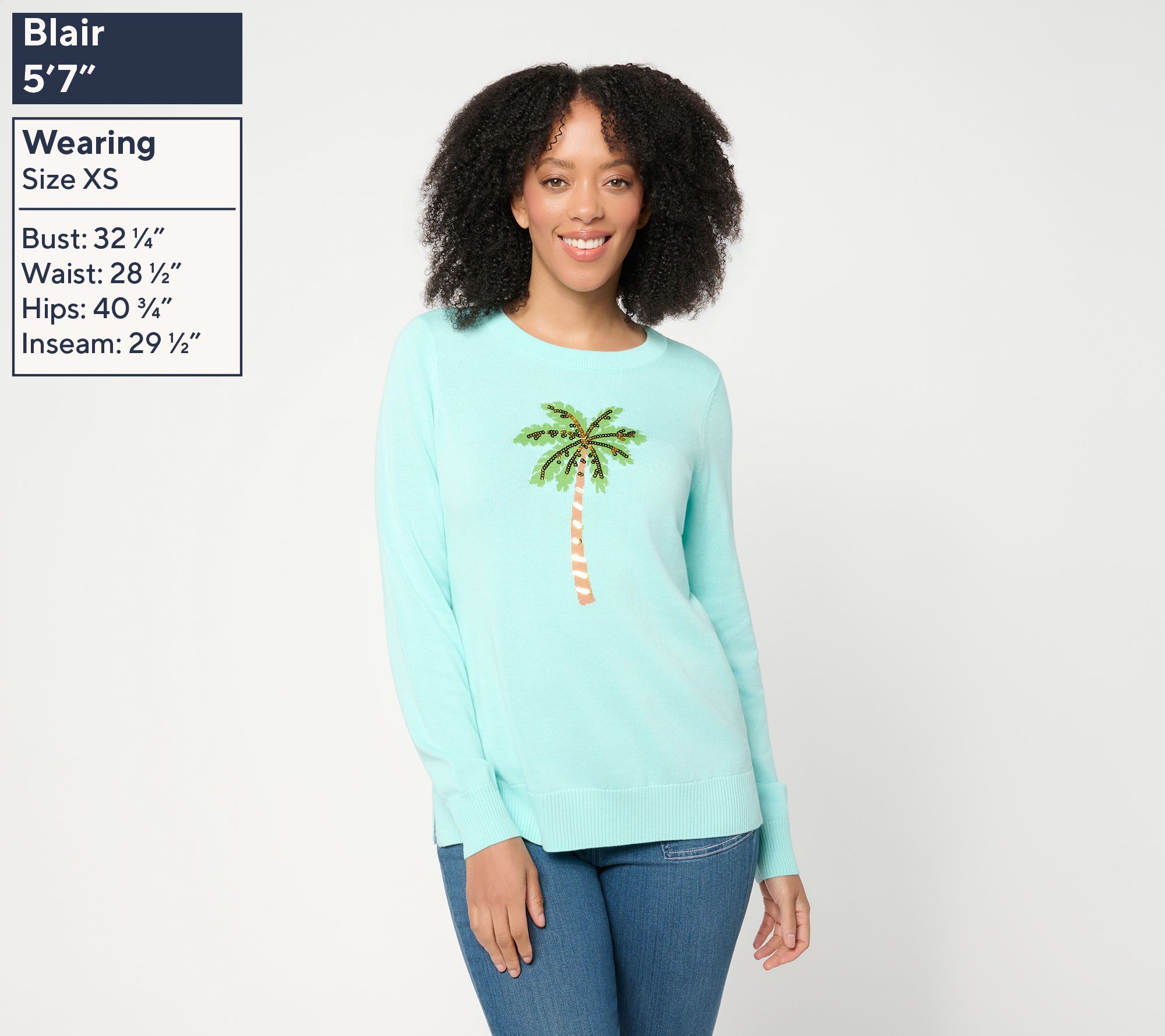 Features: long sleeves, crew neckline, beach motif with sequin trim, straight hem, side slits