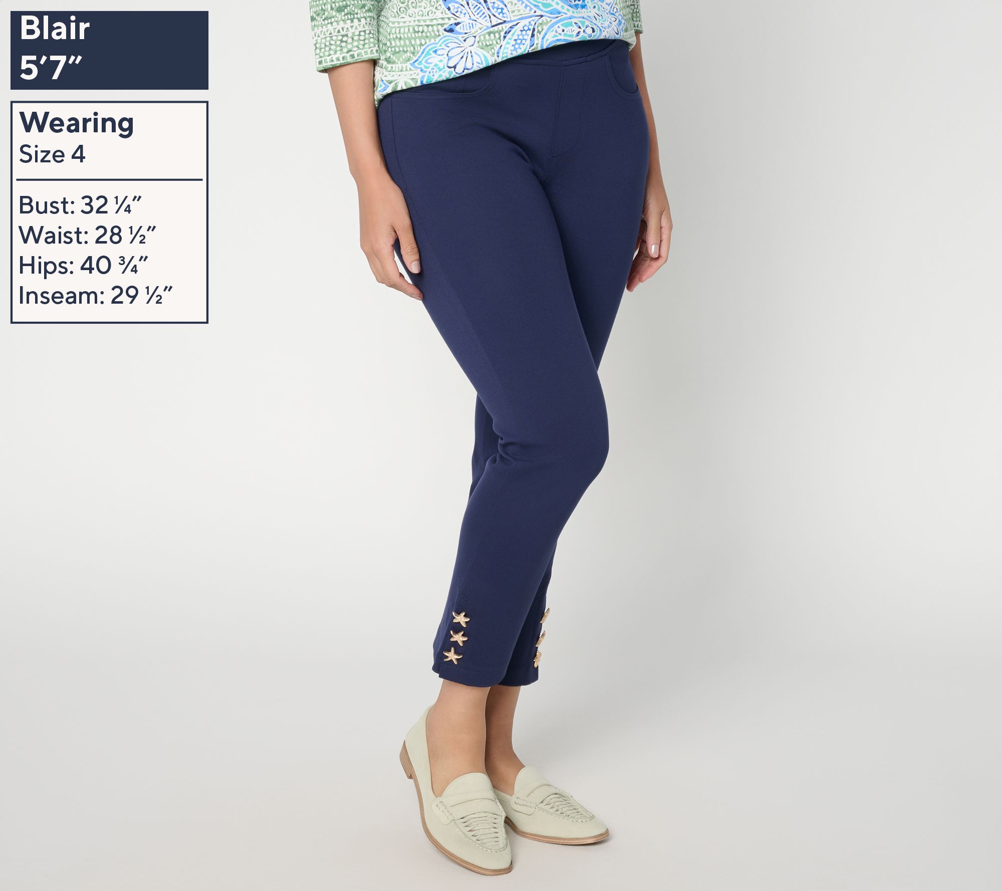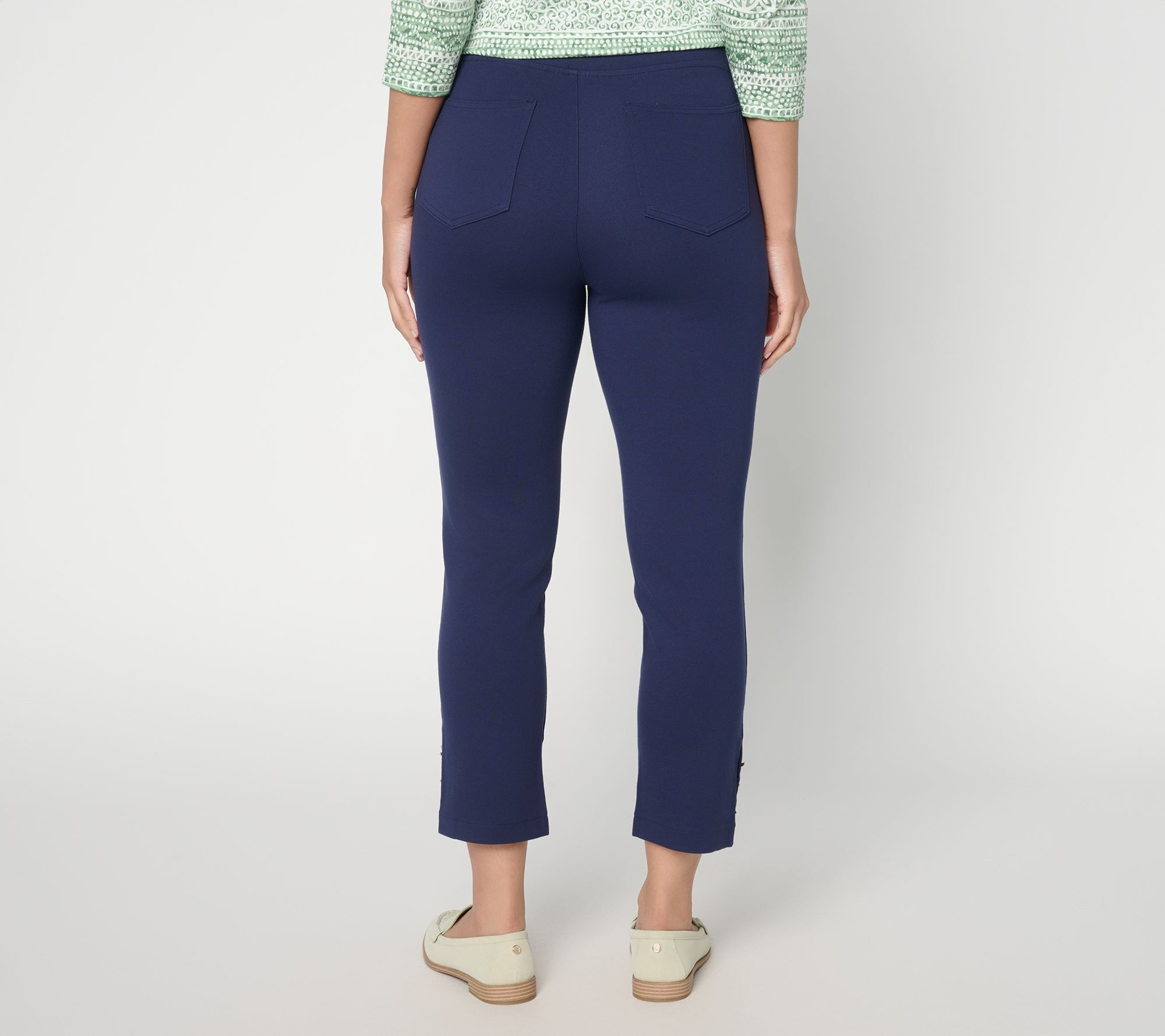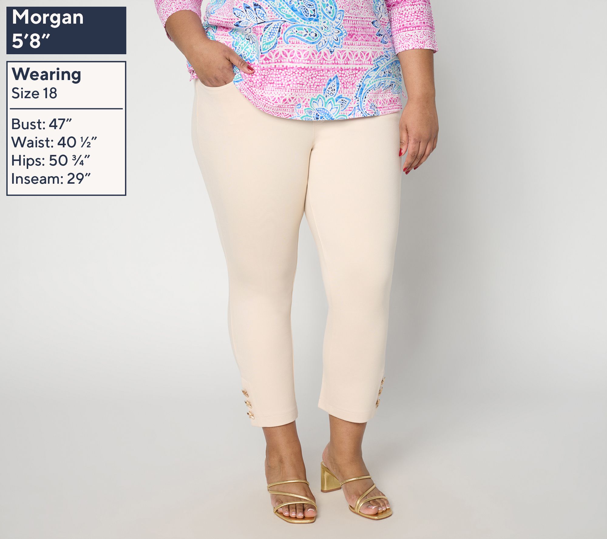 A day by the shore or an afternoon around town is more stylish than ever with these cropped pants. Starfish buttons at the leg openings bring a breezy twist to any look. Pair the pull-on design with sandals or sneakers for a look that goes from boardwalk strolls to sunny brunches with ease. From Belle Beach by Kim Gravel.