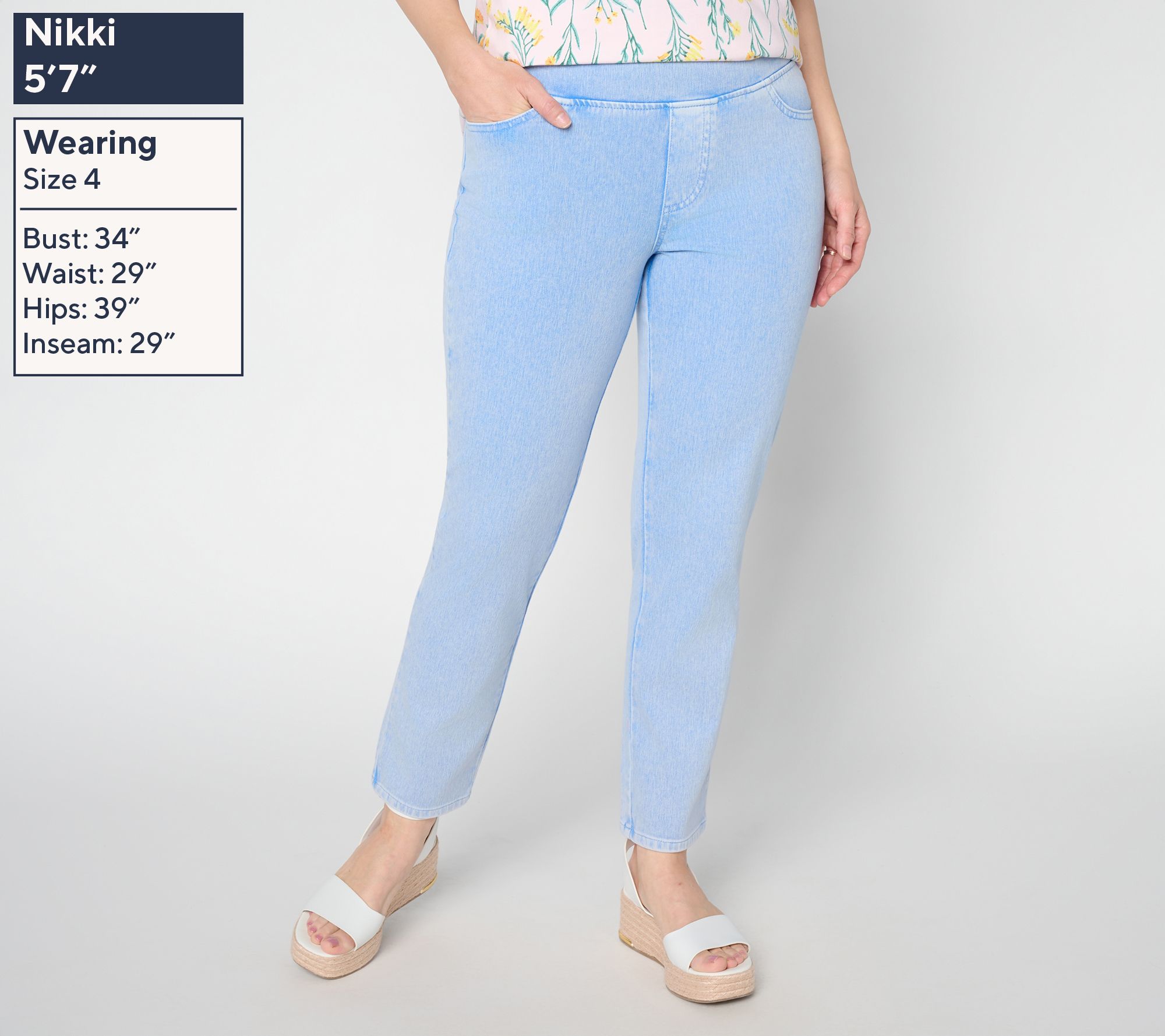 Features: pull-on style, five pockets, ankle length