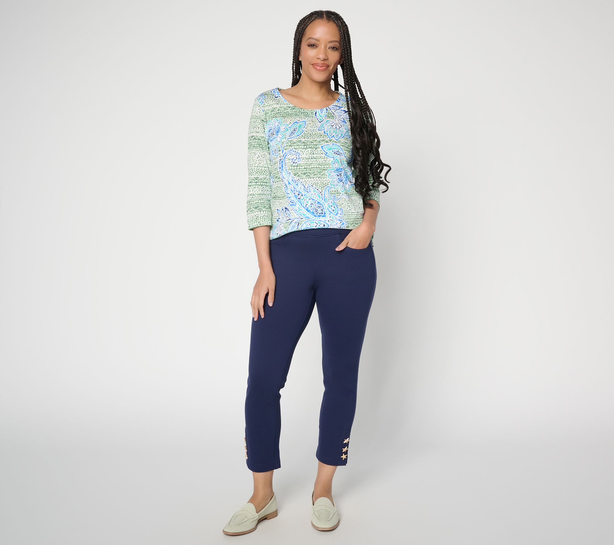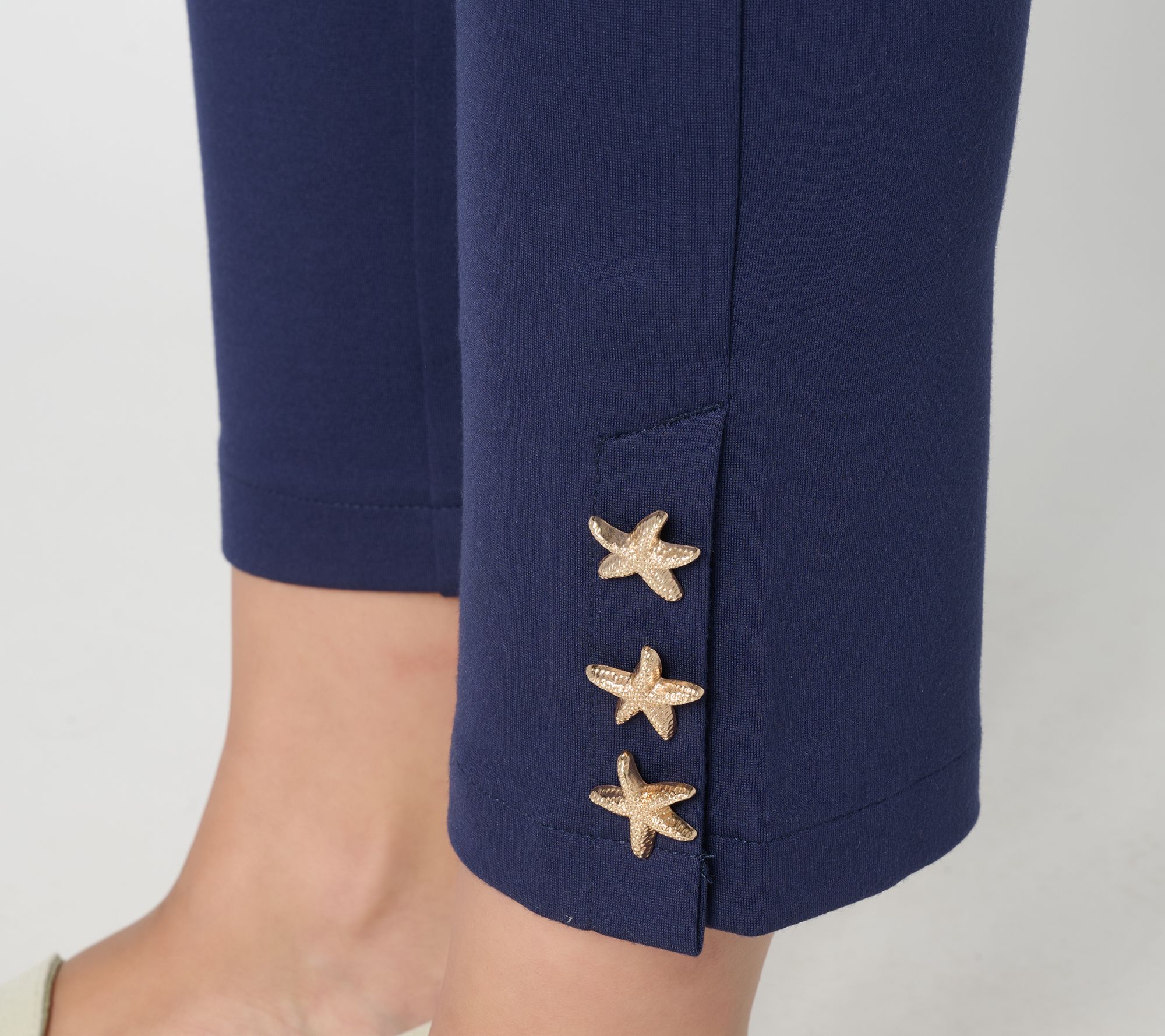 A day by the shore or an afternoon around town is more stylish than ever with these cropped pants. Starfish buttons at the leg openings bring a breezy twist to any look. Pair the pull-on design with sandals or sneakers for a look that goes from boardwalk strolls to sunny brunches with ease. From Belle Beach by Kim Gravel.