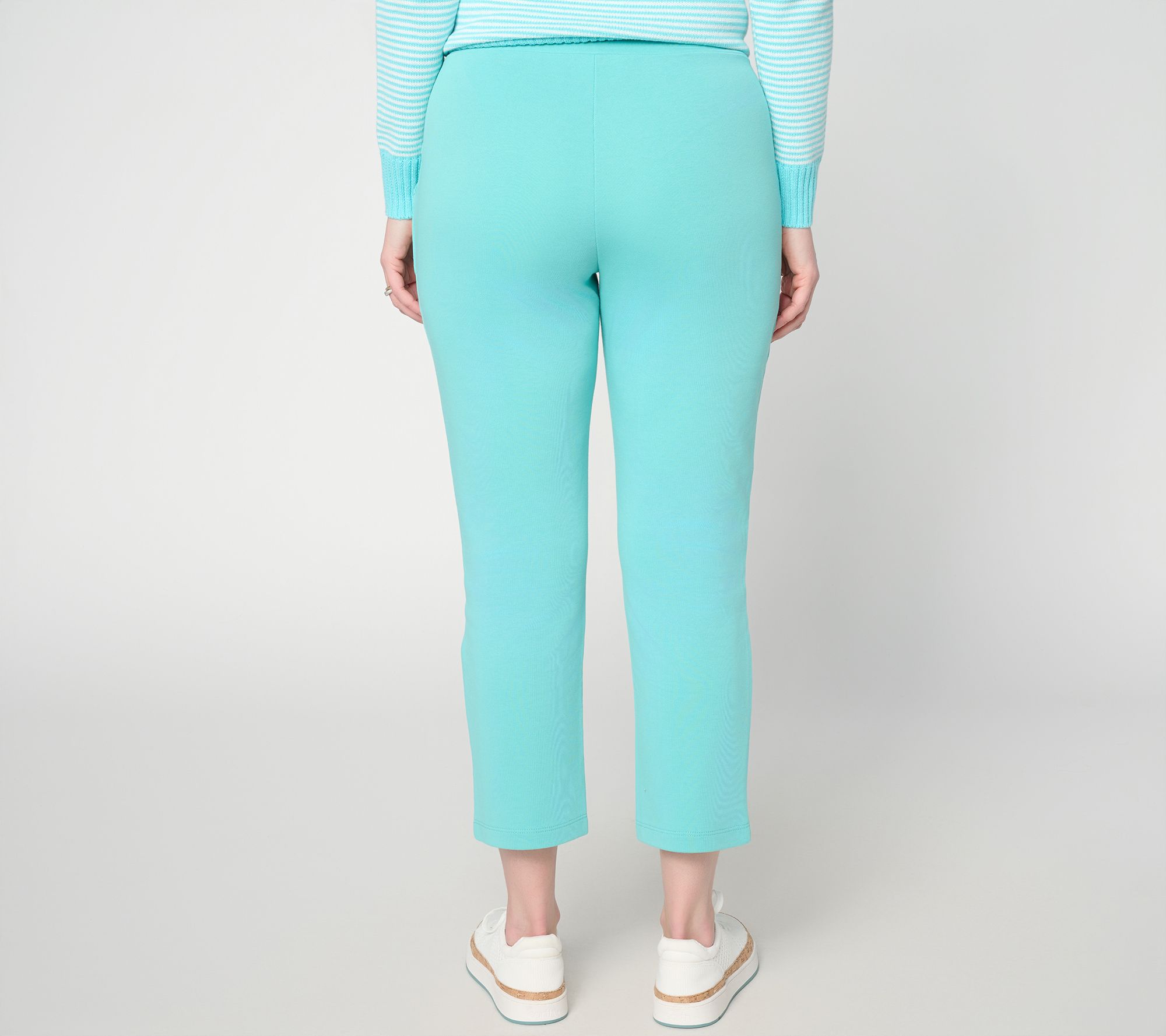 Fabrication: knit Features: cropped, pull-on style, drawstring closure, pockets Rise: at the waist Fit: semi-fitted; follows the lines of the body with added wearing ease Leg Shape: straight leg; falls straight from knee to leg opening Inseam: missy/plus inseam 25" Content: 60% cotton/40% polyester Care: machine wash, tumble dry Imported