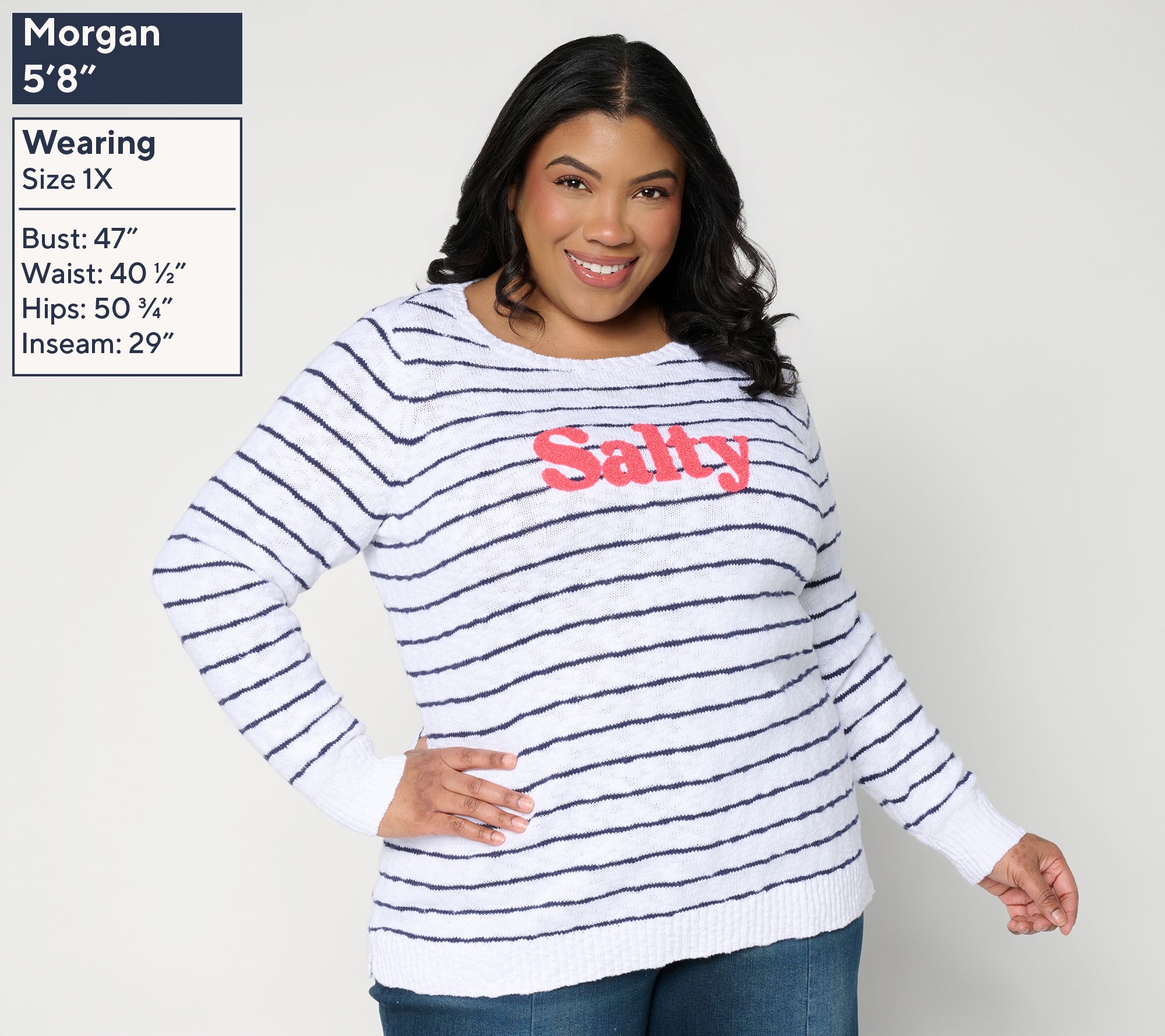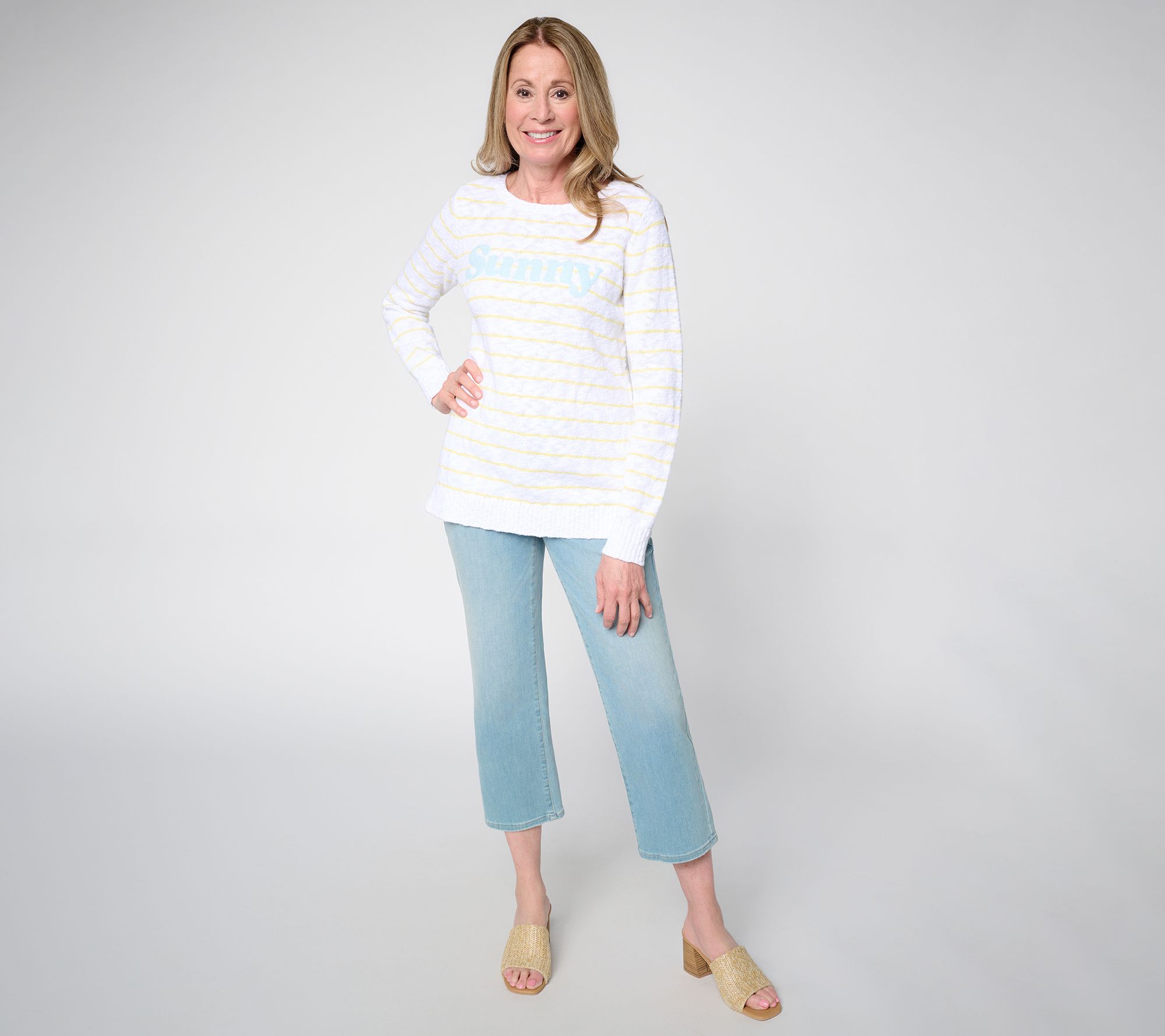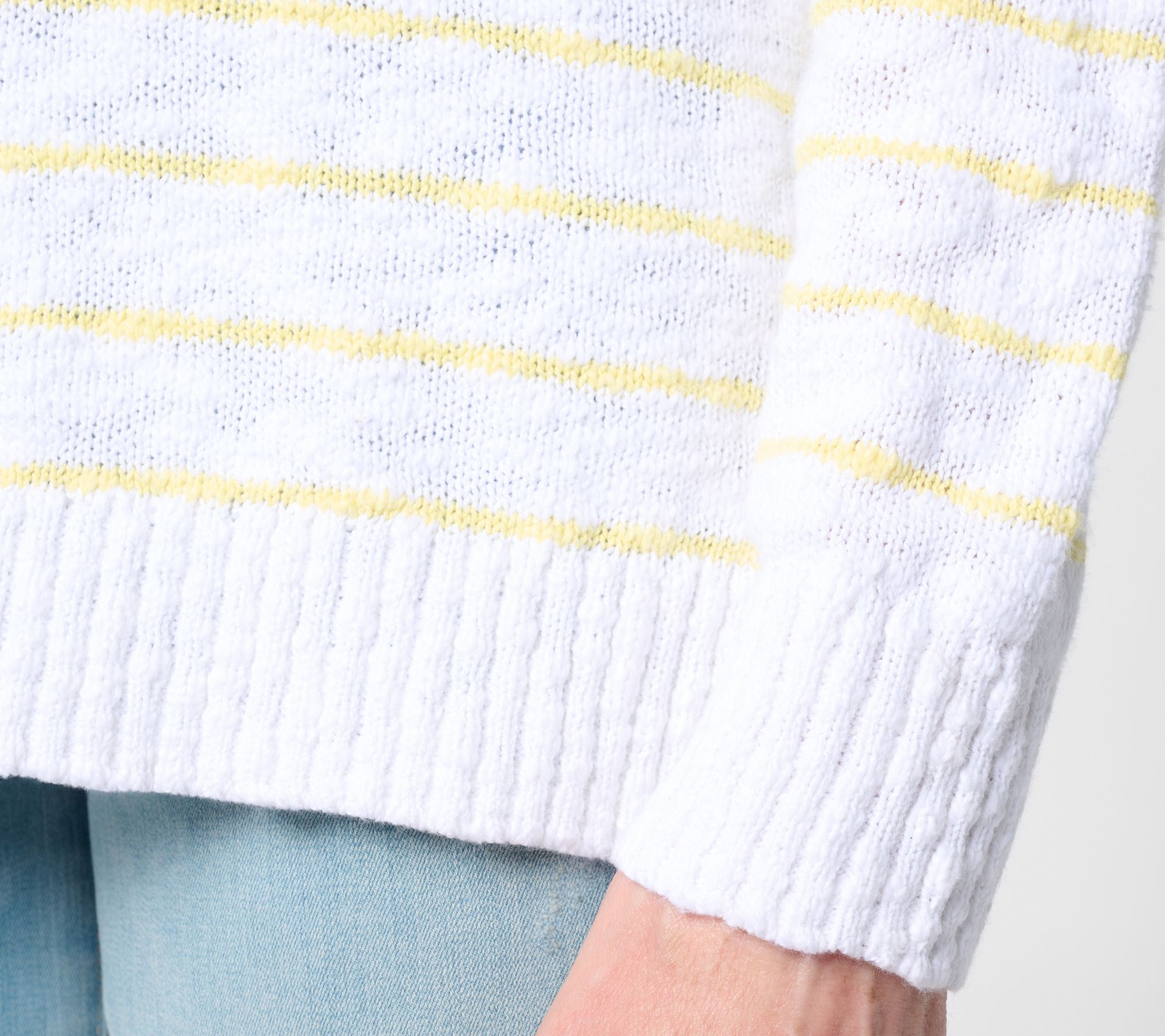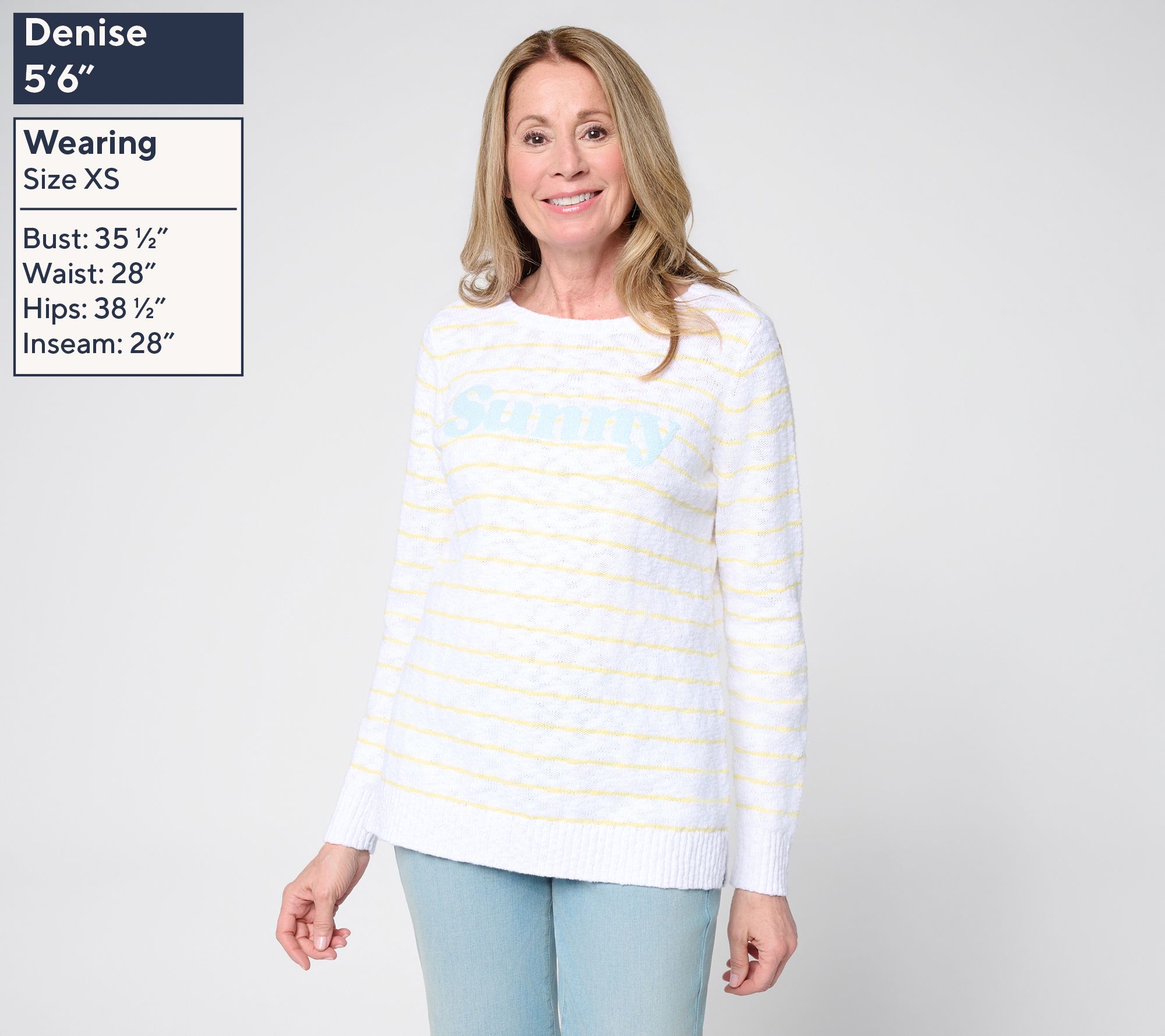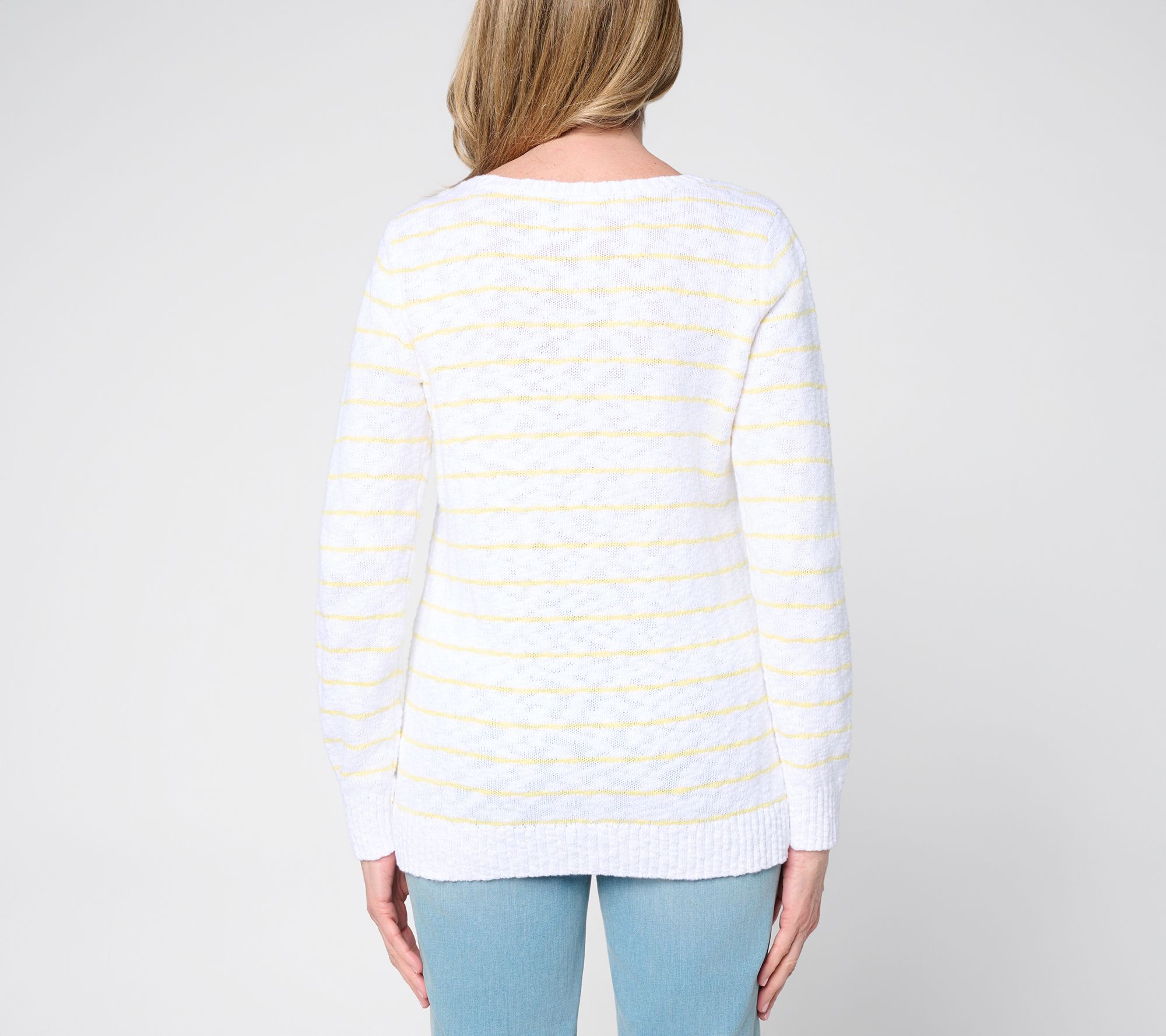 From early-morning strolls along the shore to brunch with friends, this cotton sweater brings breezy comfort to any day. Ribbed cuffs and side-slit hem add relaxed polish, while the striped design and semi-fitted silhouette make layering effortless and fun. From Belle Beach by Kim Gravel.