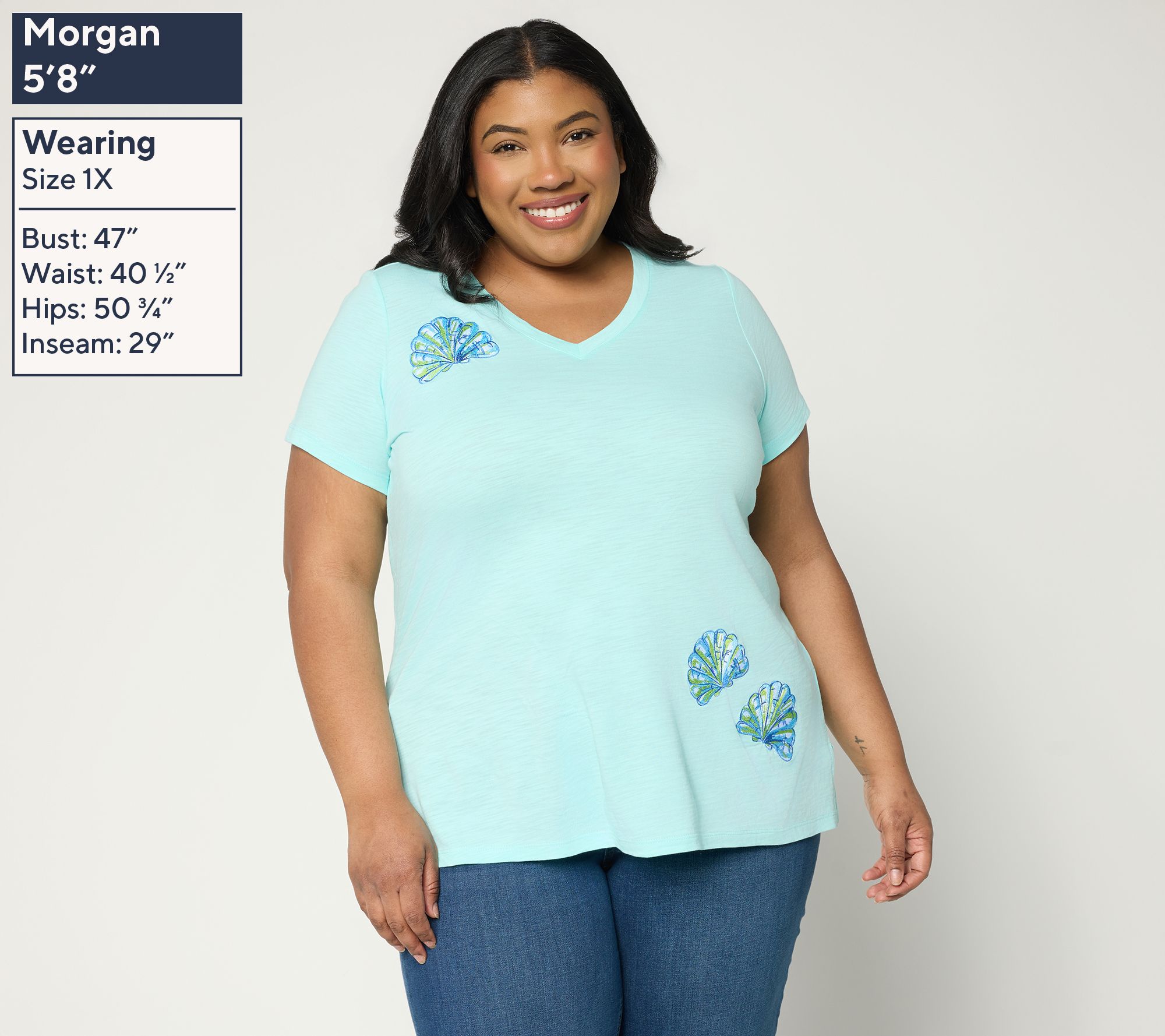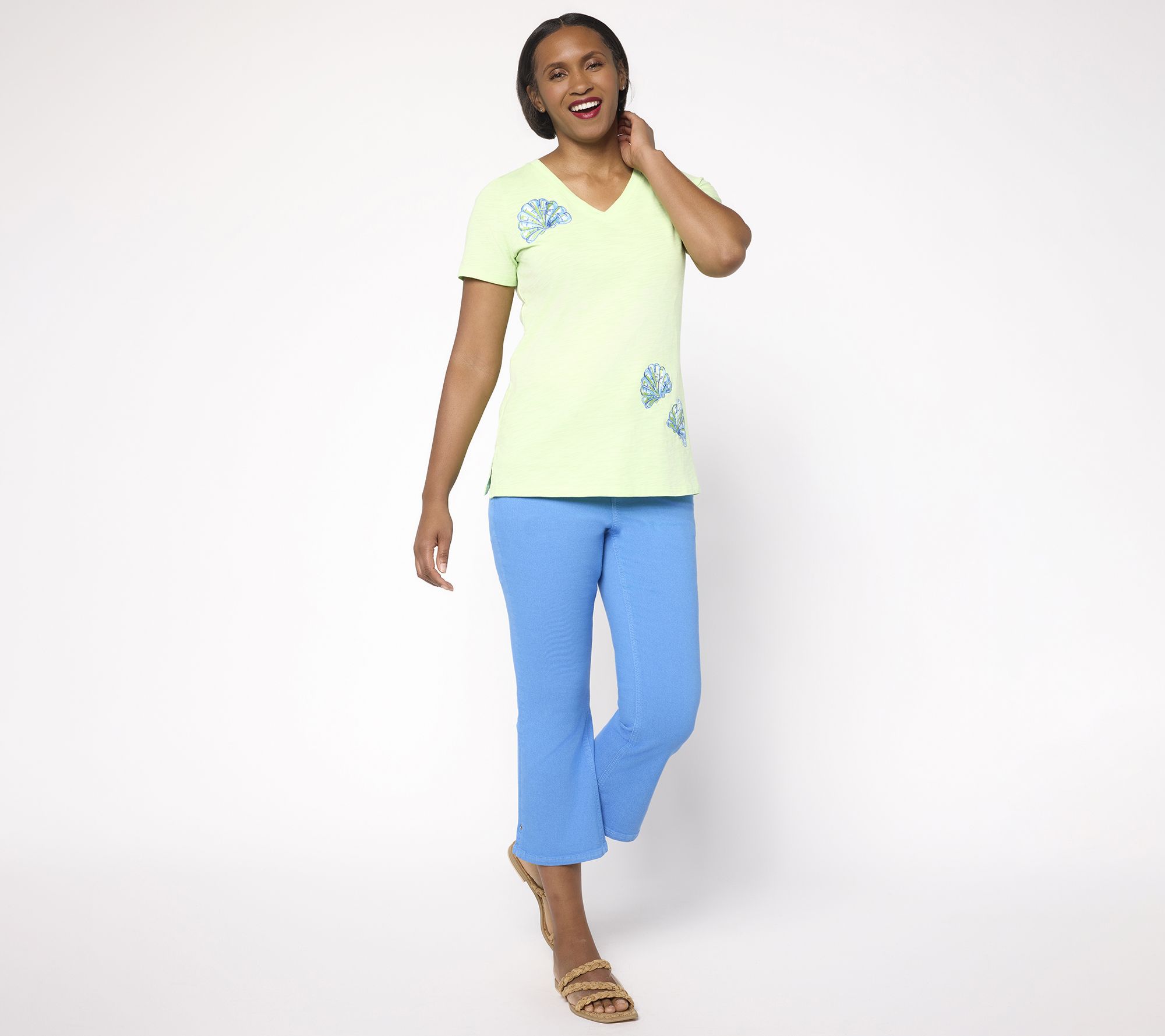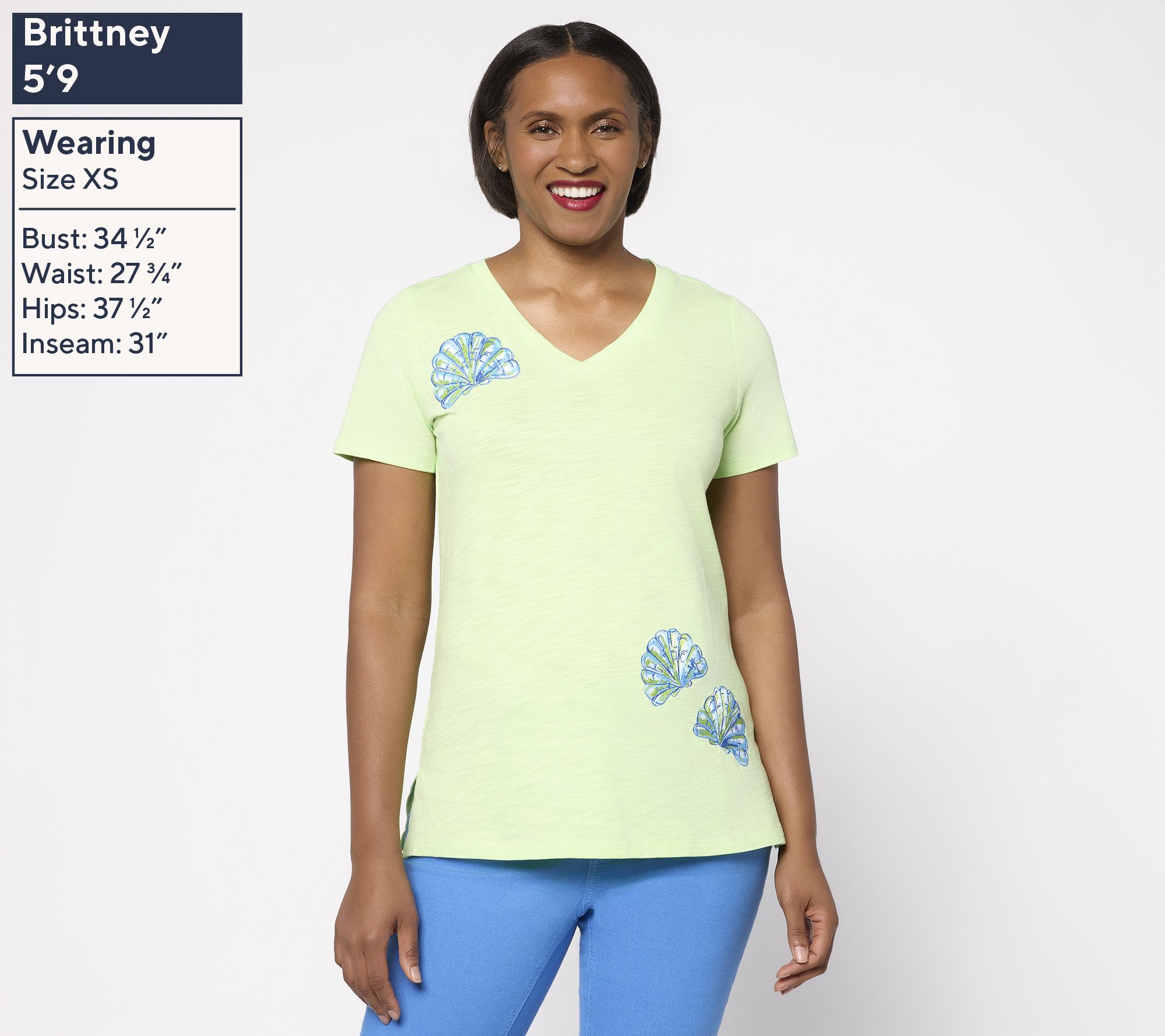 Sun-drenched days meet effortless style with this embroidered knit top, designed for strolls by the shore or relaxed gatherings with friends. Touches of seashell embroidery and breezy short sleeves capture easy-going charm, while a soft V-neckline invites you to layer with your favorite jewelry. From Belle Beach by Kim Gravel.