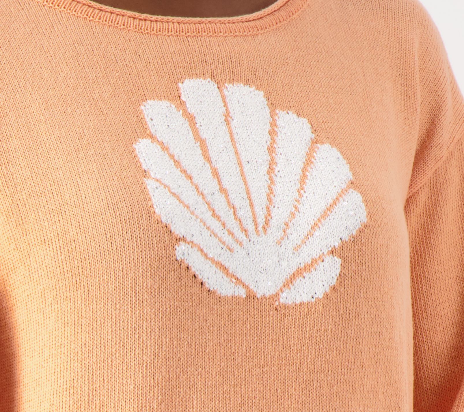 Features: round neckline; long sleeves; dropped shoulder; shell motif; rolled edge at neckline, sleeve, and bottom