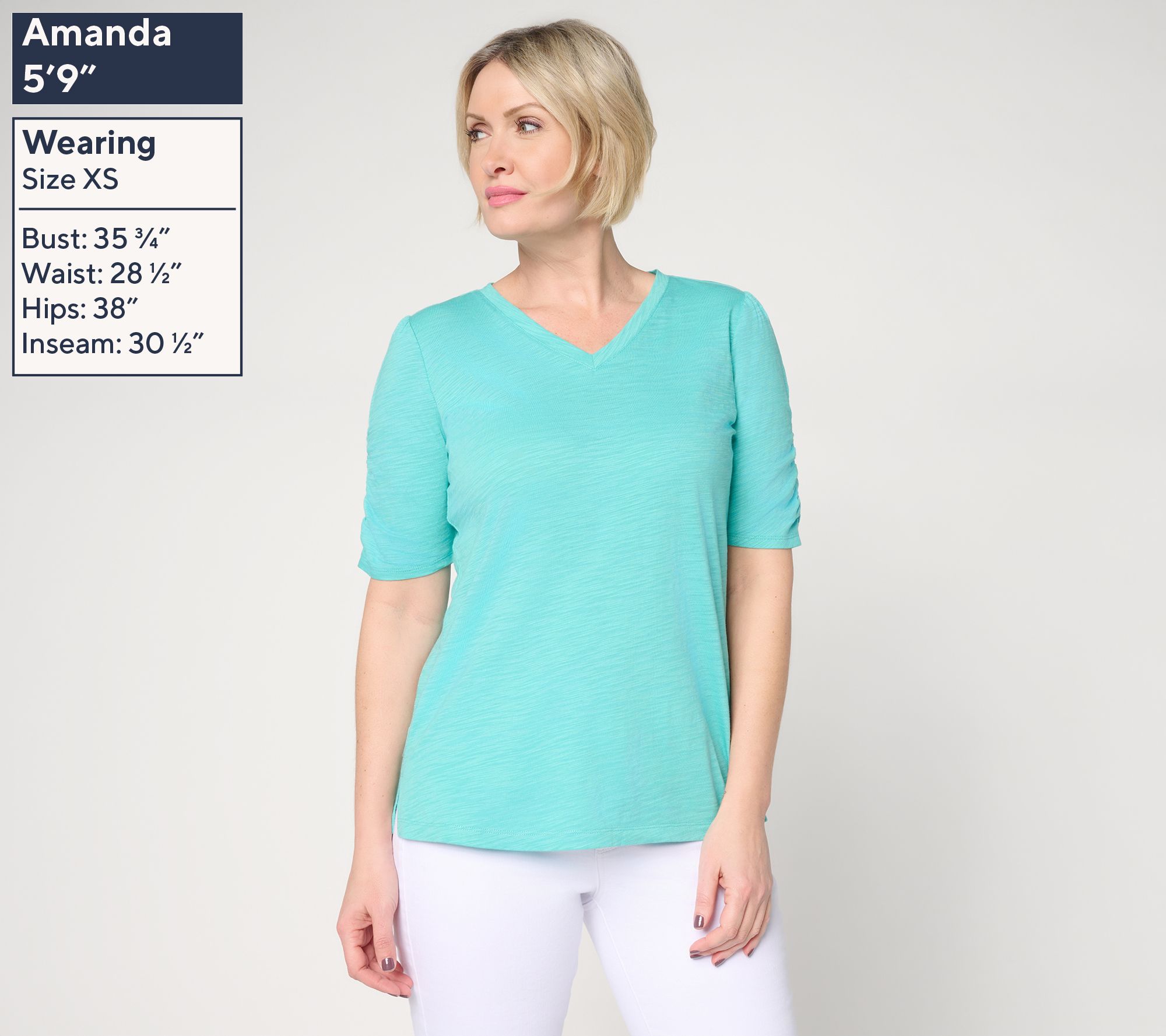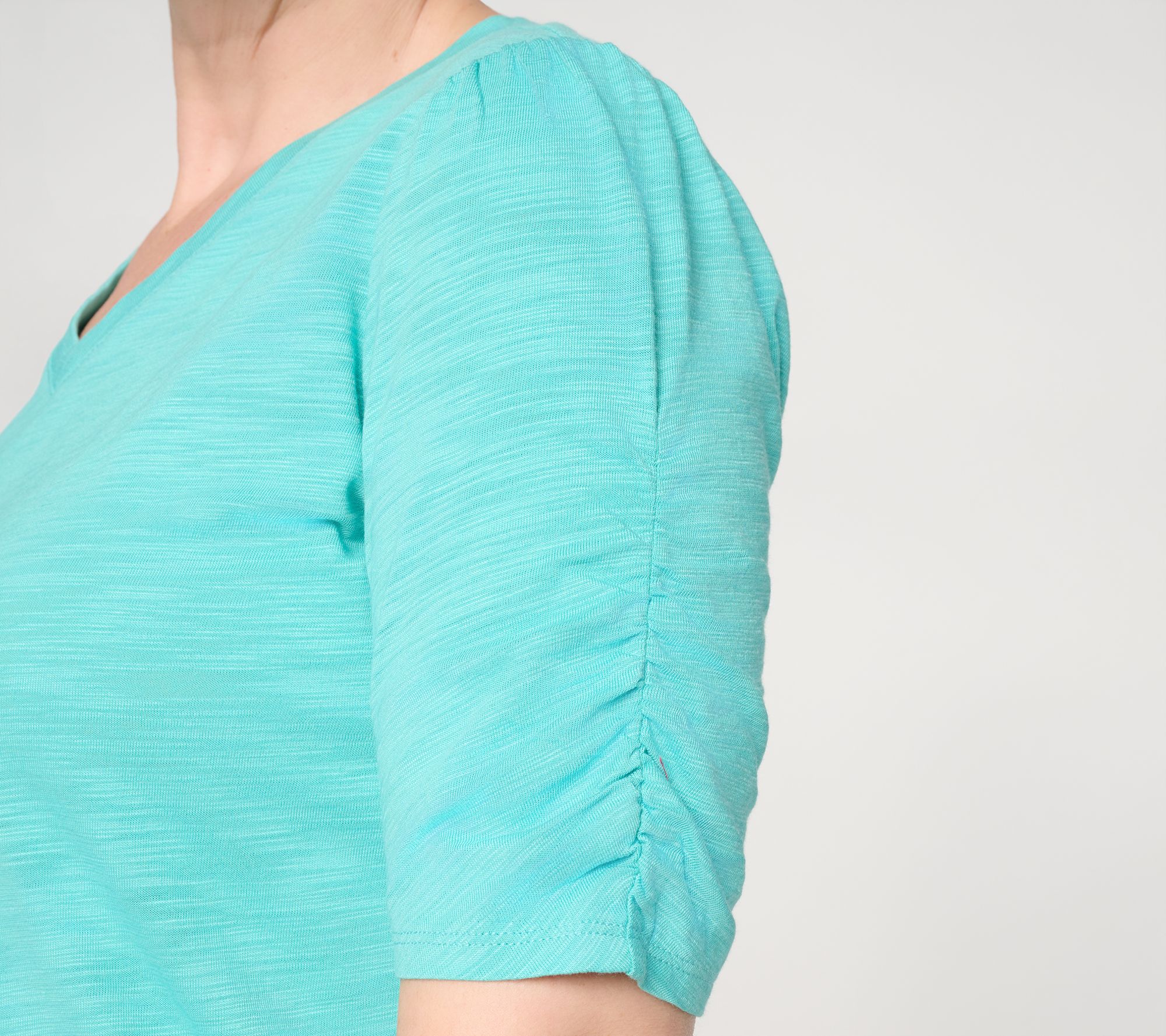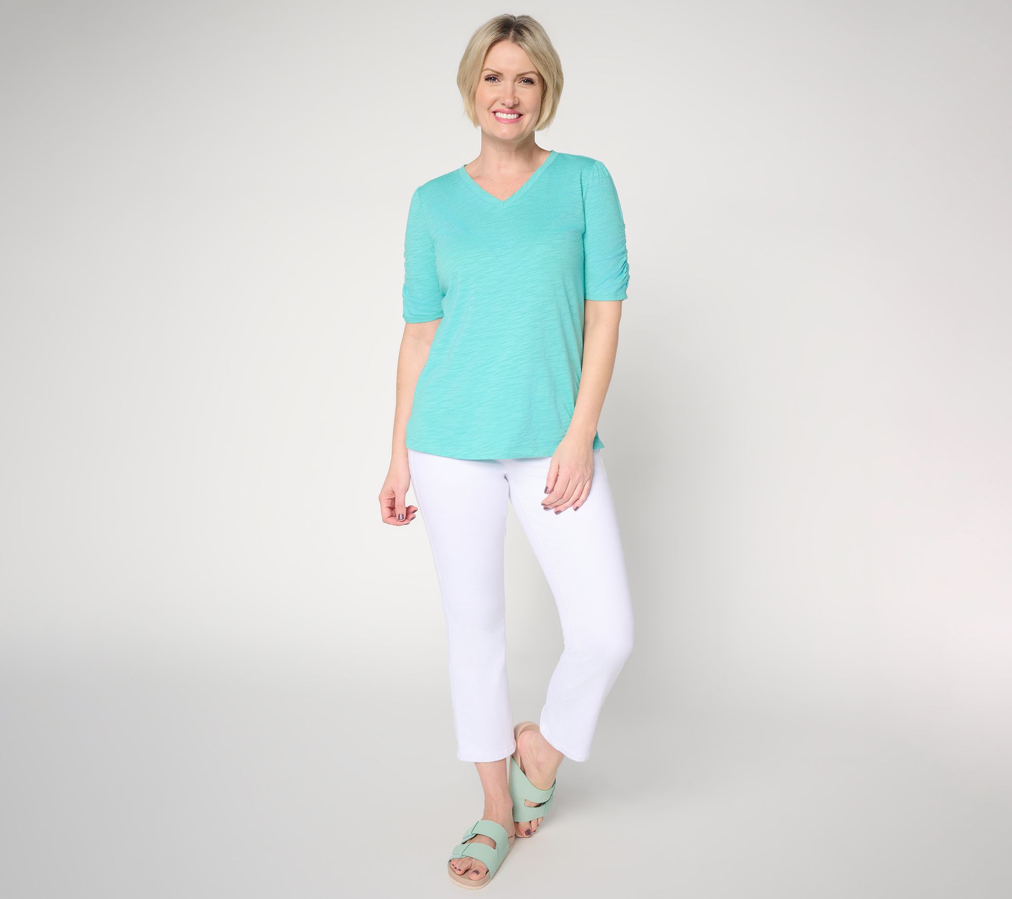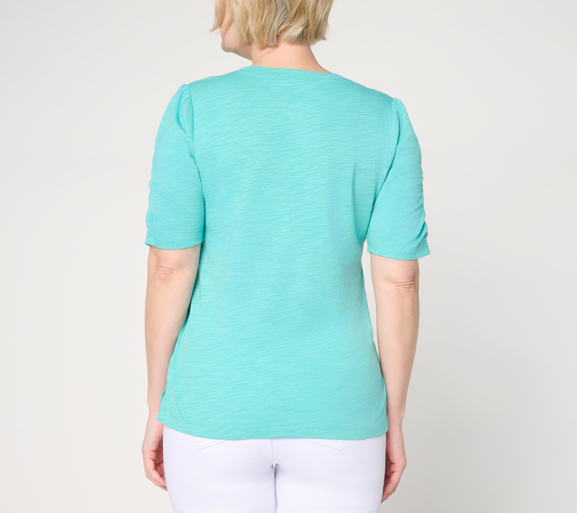 Weekend errands or coffee dates with neighbors feel elevated in this slub knit top, where ruched elbow sleeves and side slits add easygoing charm. The soft cotton-modal blend drapes gently while the graceful silhouette gives a polished layer for your go-to jeans or shorts. From Belle by Kim Gravel.
