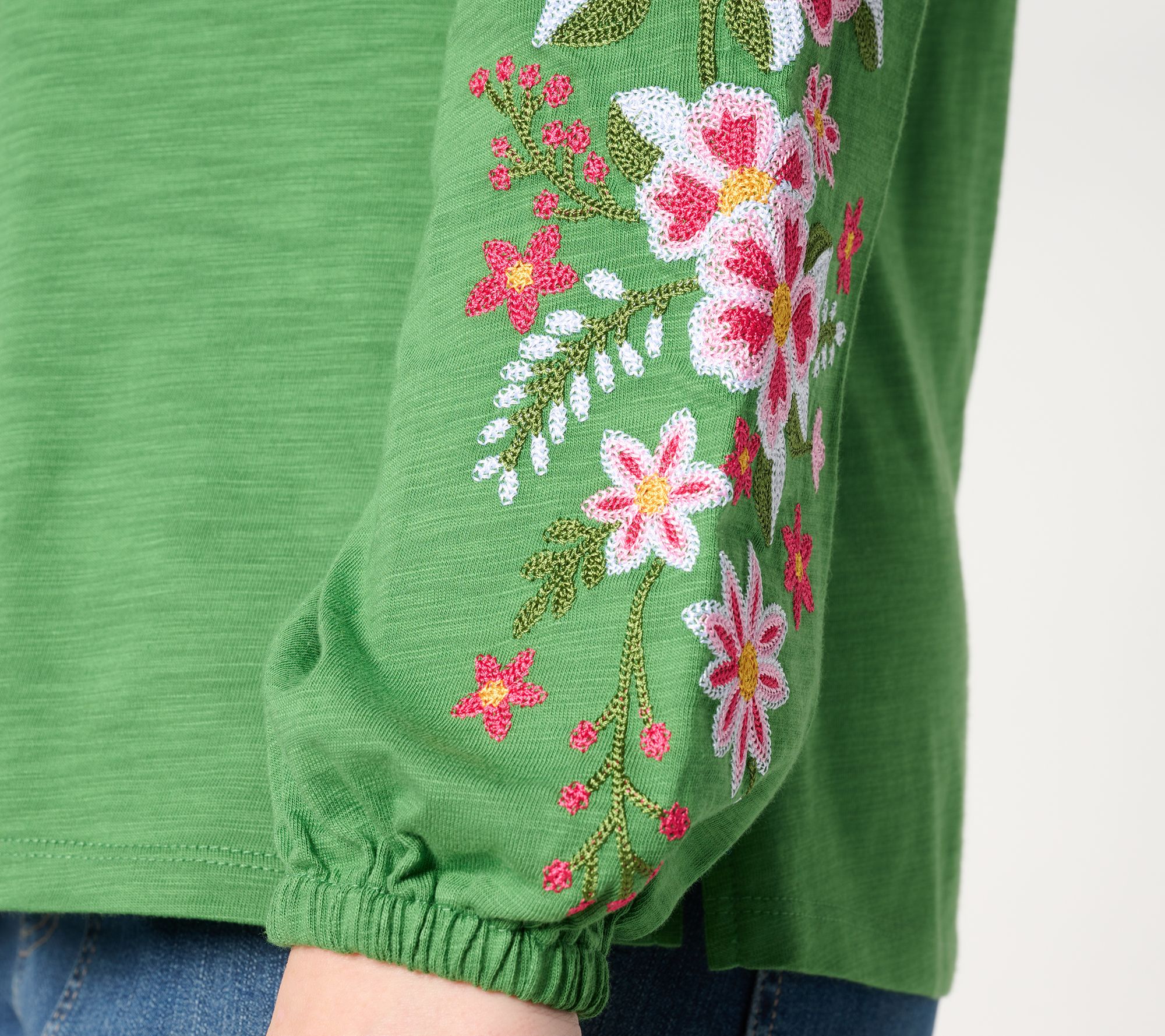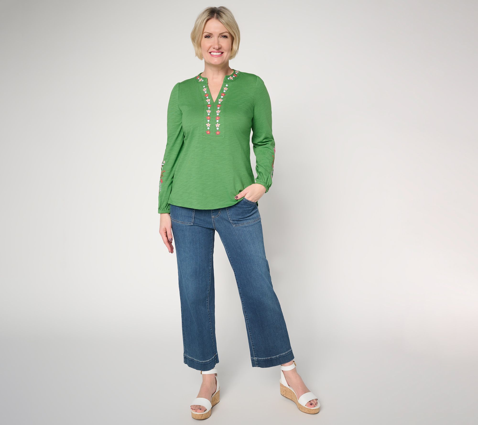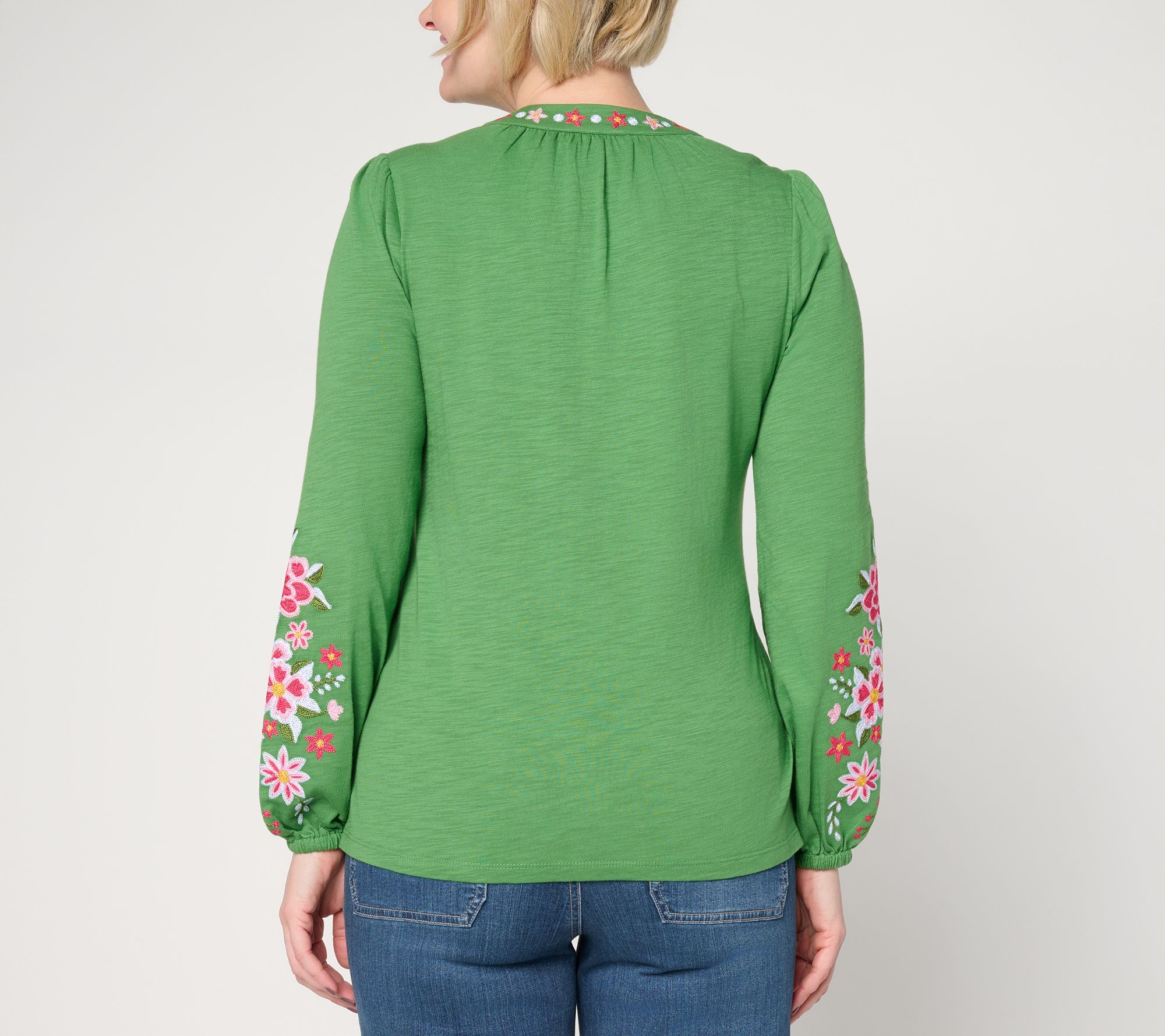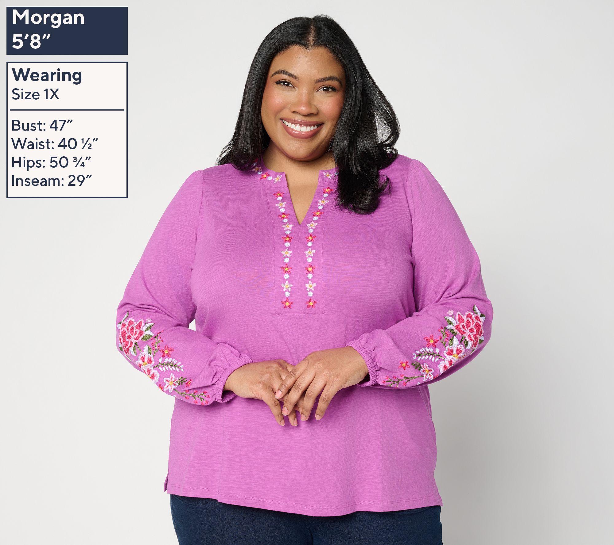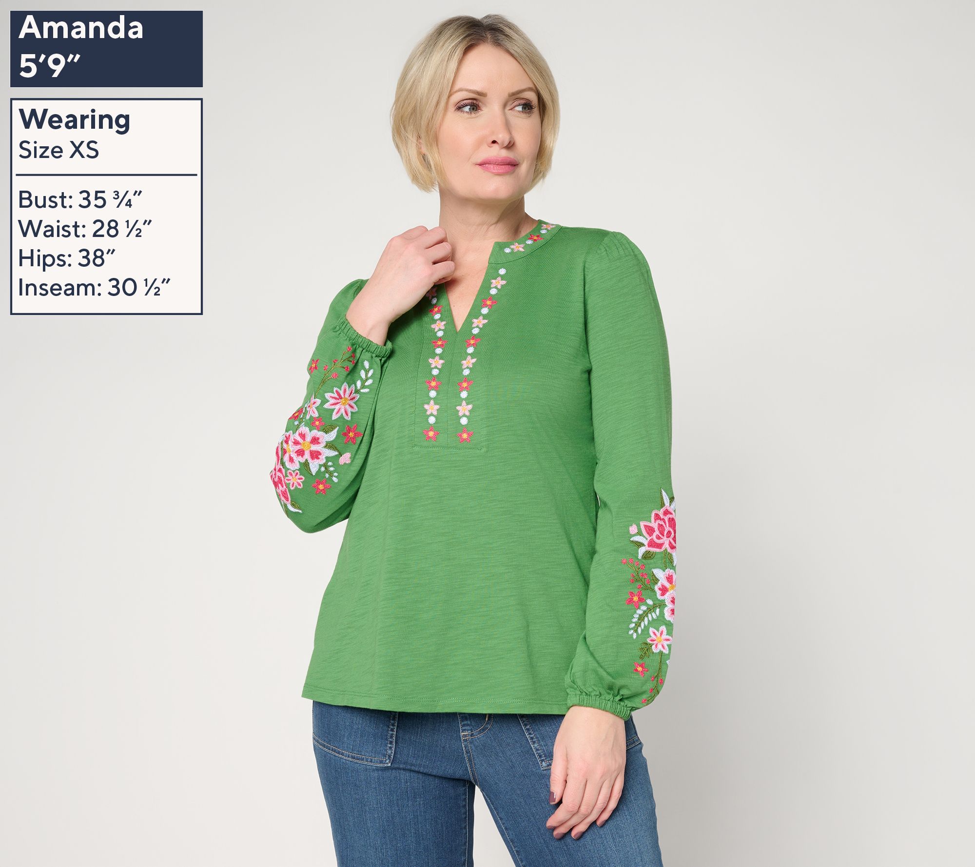 Whether you're meeting up for brunch or heading into the office, this embroidered knit top adds an artisan-inspired flourish to your day. Crafted with long sleeves, a split neckline, and breezy side slits, its elastic cuffs and straight hem blend comfort and style for wherever the moment takes you. From Belle by Kim Gravel.
