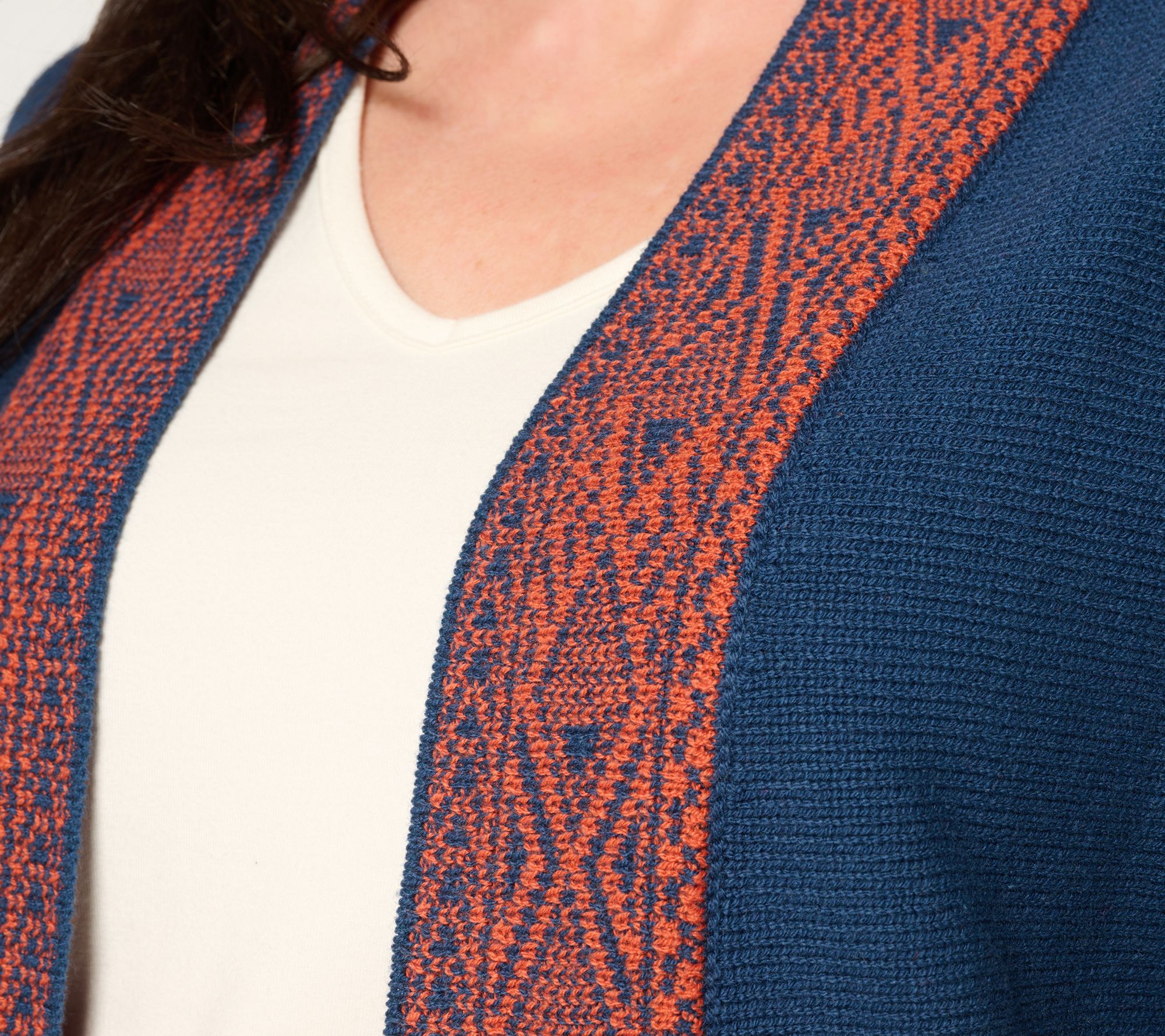 Features: 3/4-length sleeves; open front; decorative border trim at cuffs, center front opening, and hem; straight bottom hem