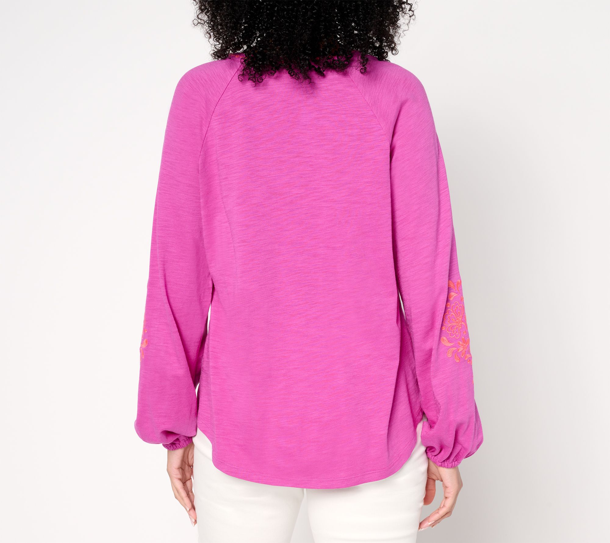 Embrace a boho-chic energy with this Lotus Sunrise embroidered top. With its tassel-accented split neckline, long raglan sleeves with elastic cuffs, and flattering curved hem, this peasant-style design brings an updated yet relaxed vibe to any everyday look. From Belle by Kim Gravel.