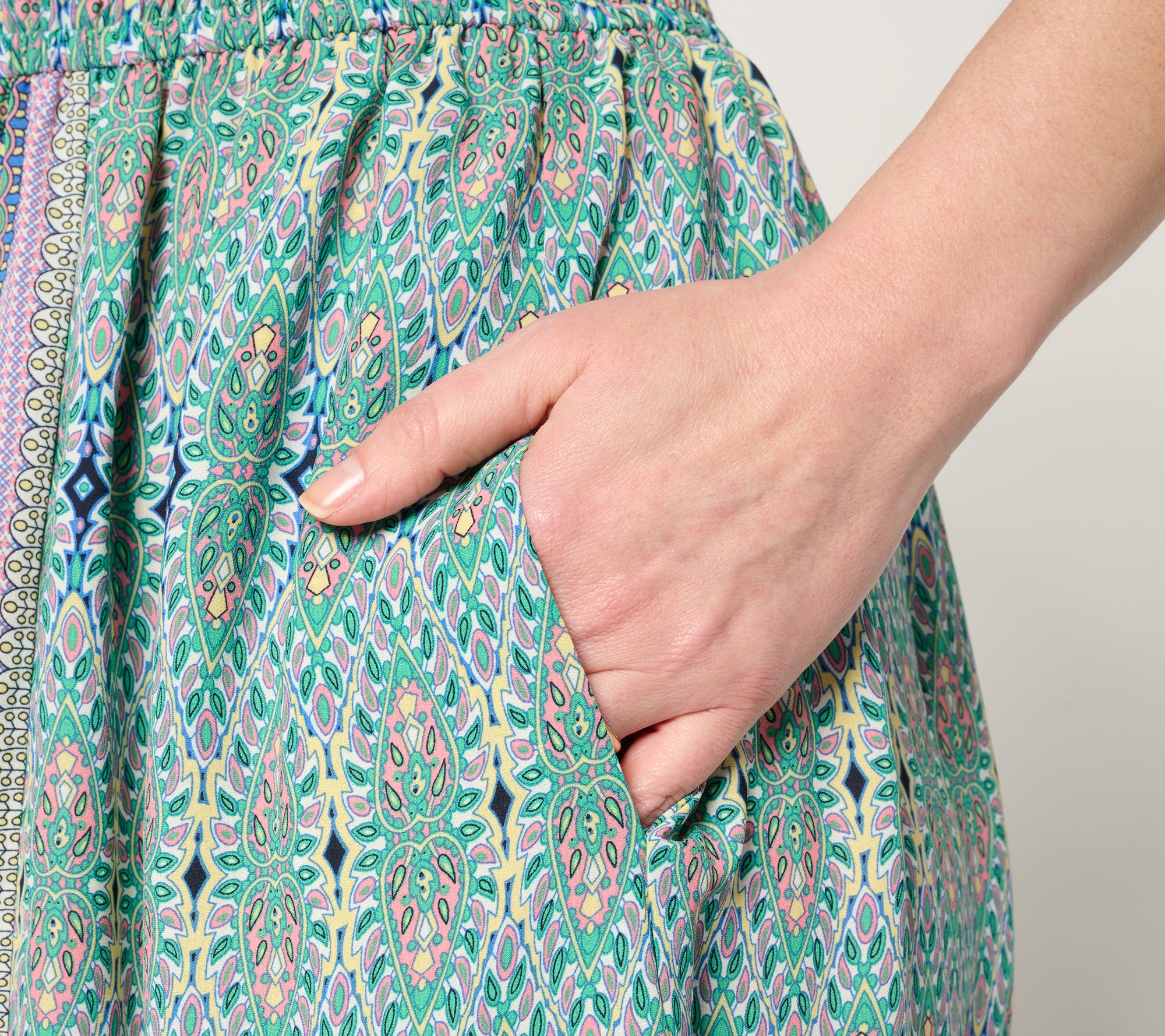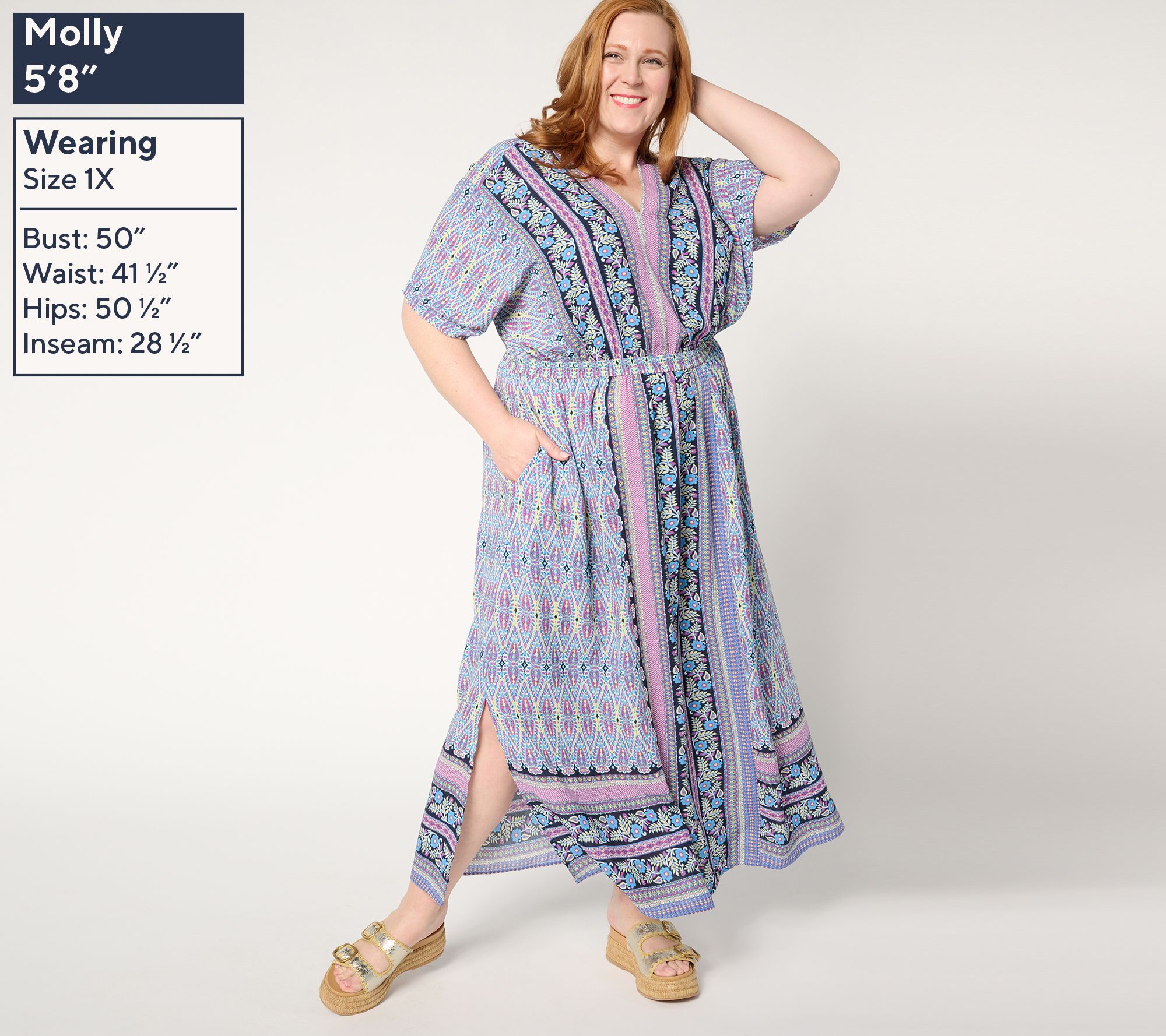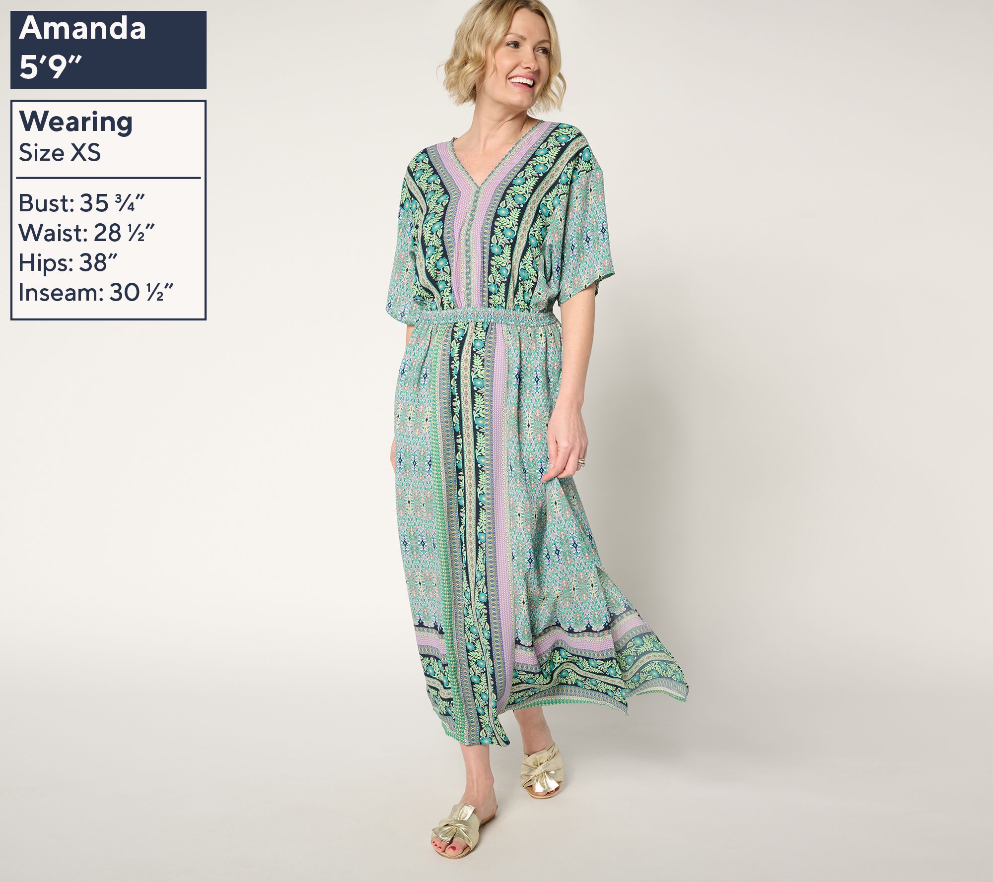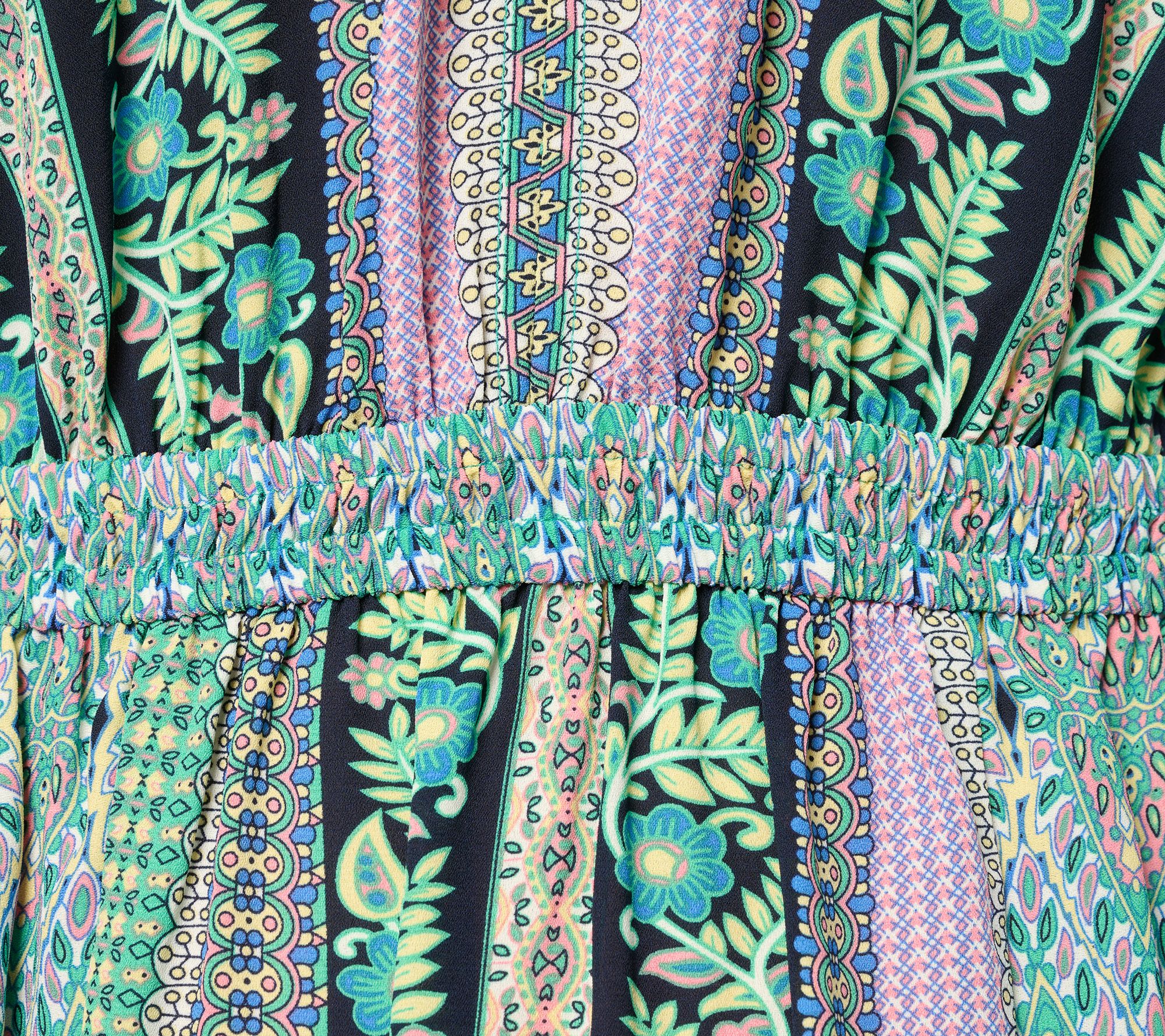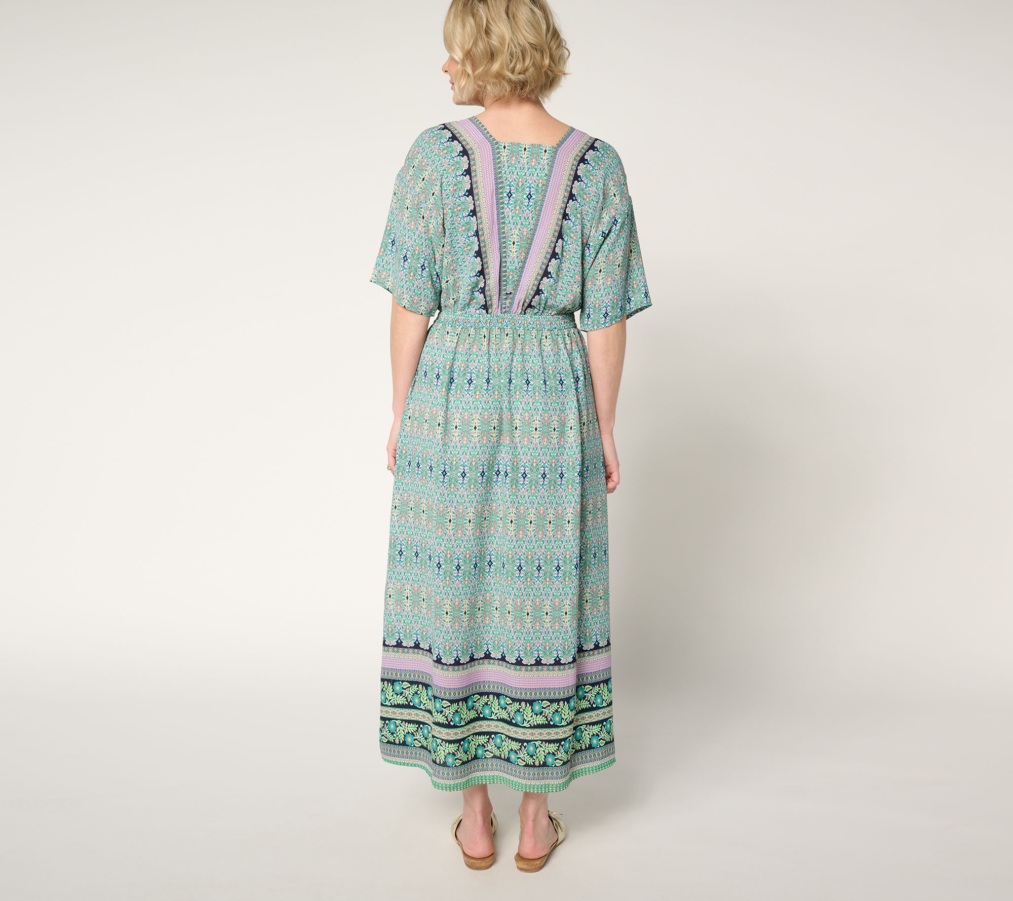 Embrace a boho-chic energy with this Lotus Sunrise maxi dress. With its eye-catching pattern, V-neckline, and elastic waist, this peasant-style design brings an updated yet relaxed vibe to any everyday look. From Belle by Kim Gravel.