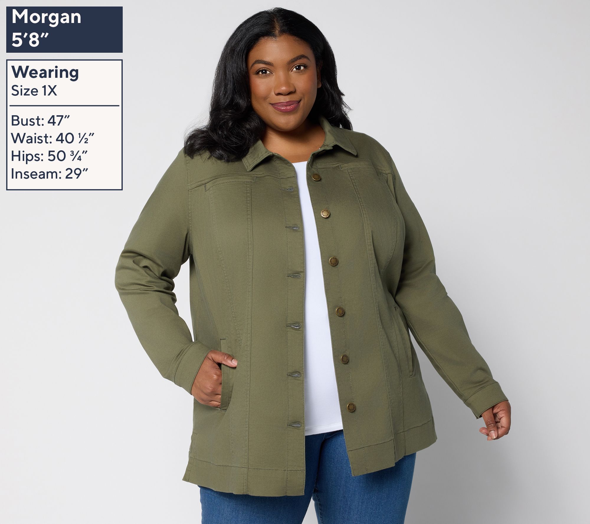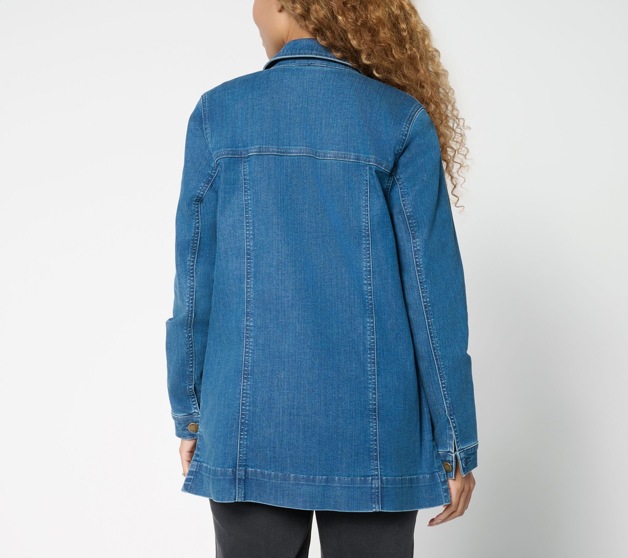 From weekday errands to weekend adventures, this stretch denim jacket offers a polished look with everyday comfort. The classic shirt collar, front and back yoke, and band pockets lend timeless appeal, while side slits at the straight hem provide extra ease as you move through your day. From Belle Boho by Kim Gravel.