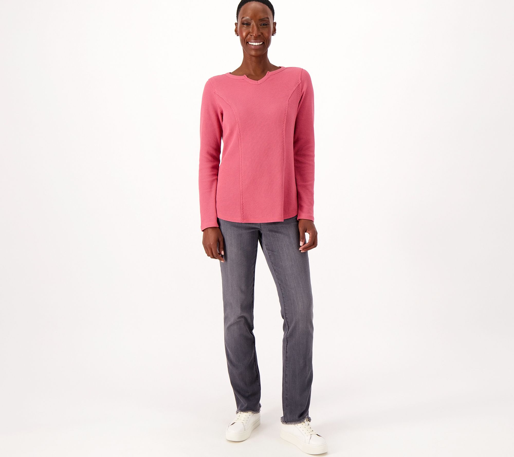 This always-cute and always-comfy waffle top pairs well with everything from lounge pants on a night in, to jeans and a leather jacket for a night on the town. From Belle by Kim Gravel.