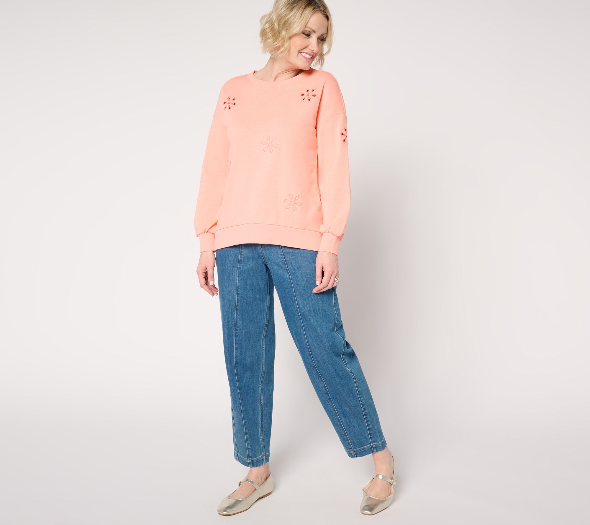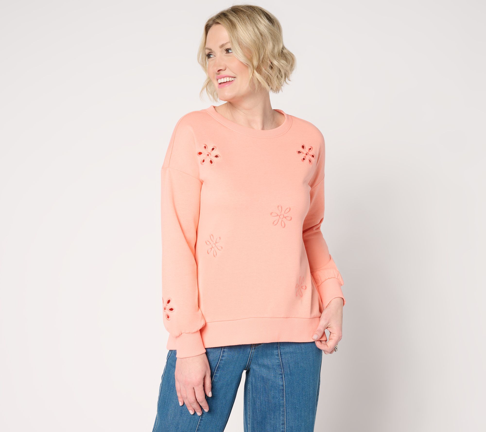 Freshly picked for you, Kim Gravel's daisy-dotted sweater blooms with eyelet flower power. Breezy cutouts embellish this springtime take on a traditional sweatshirt, transforming this otherwise basic top with botanical beauty. From Belle by Kim Gravel.