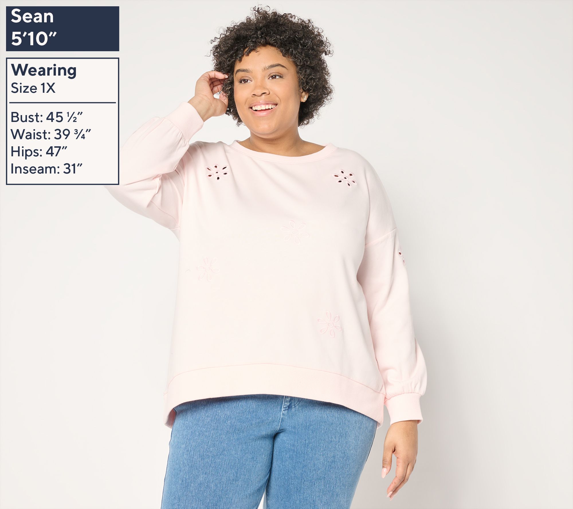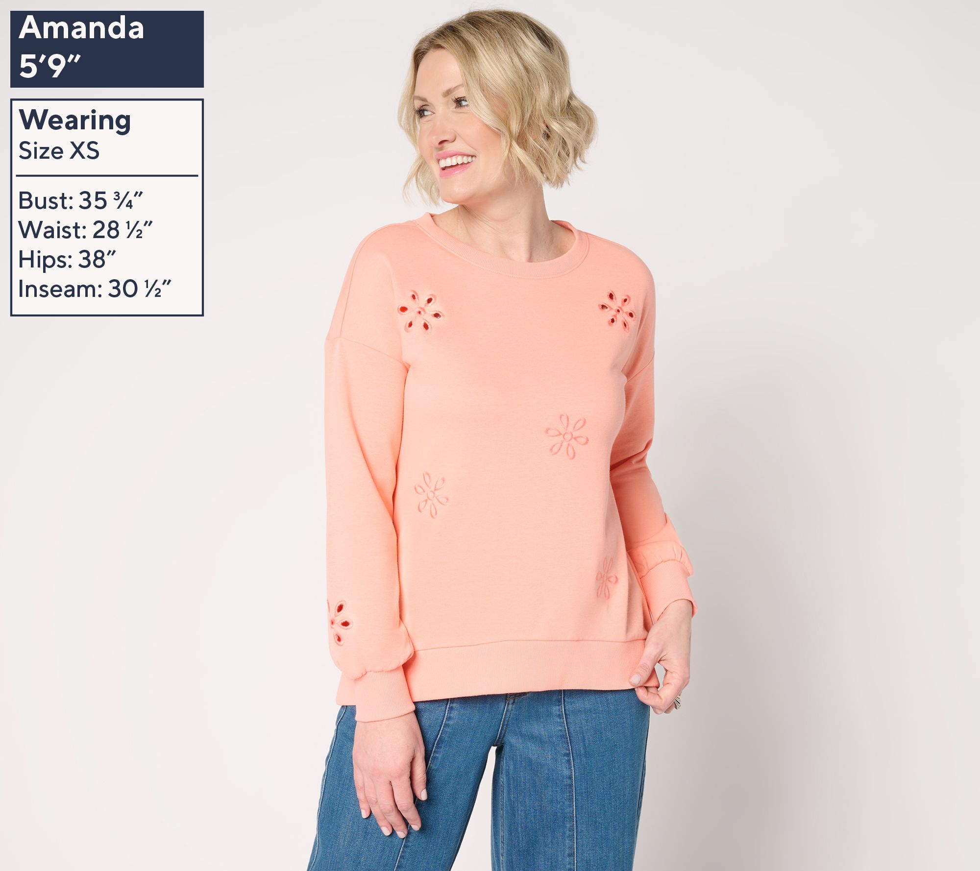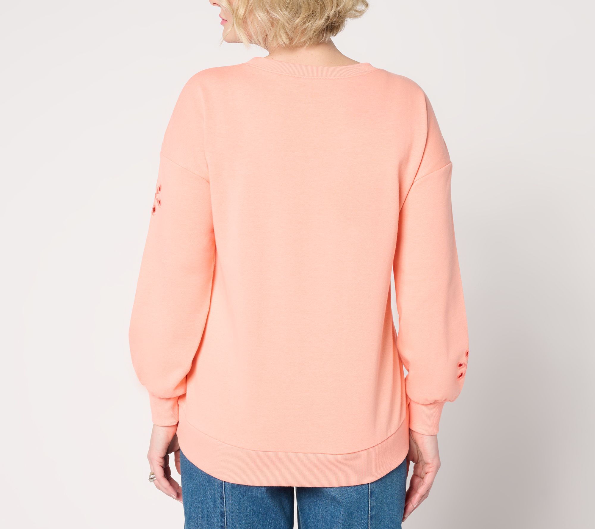 Features: crew neckline, long sleeves, eyelet detail, ribbed sleeve cuffs and bottom hem