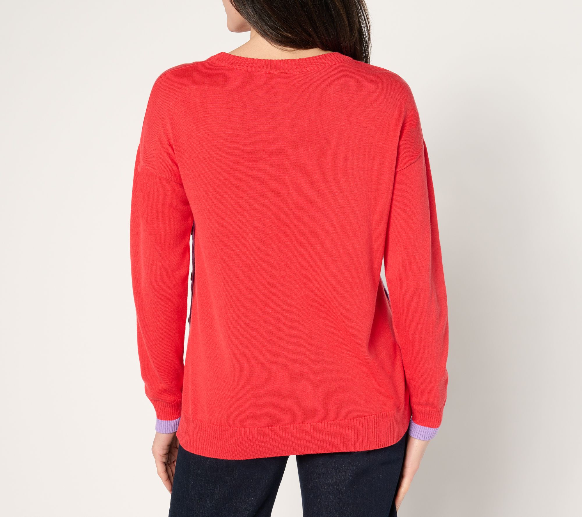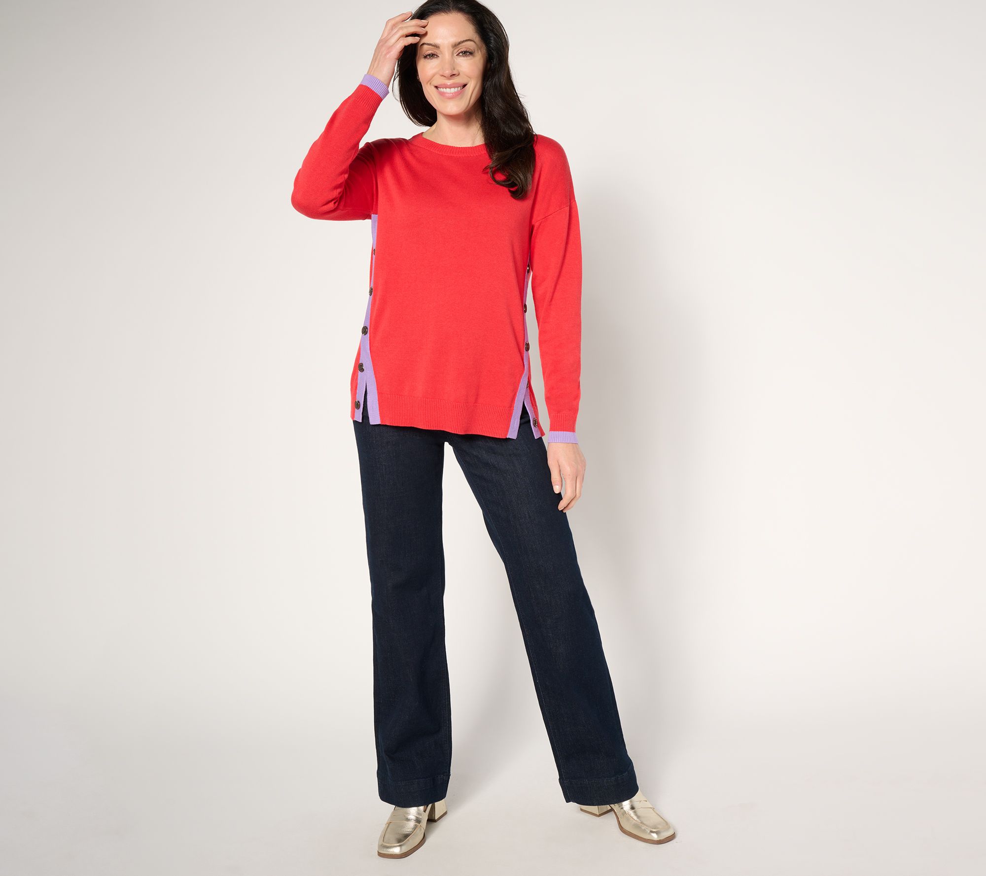 Your bright side is showing! Embrace positivity -- and flexible comfort -- in this cheerful side-button sweater, an equally pretty pick for appointments or your social life. From Belle by Kim Gravel.
