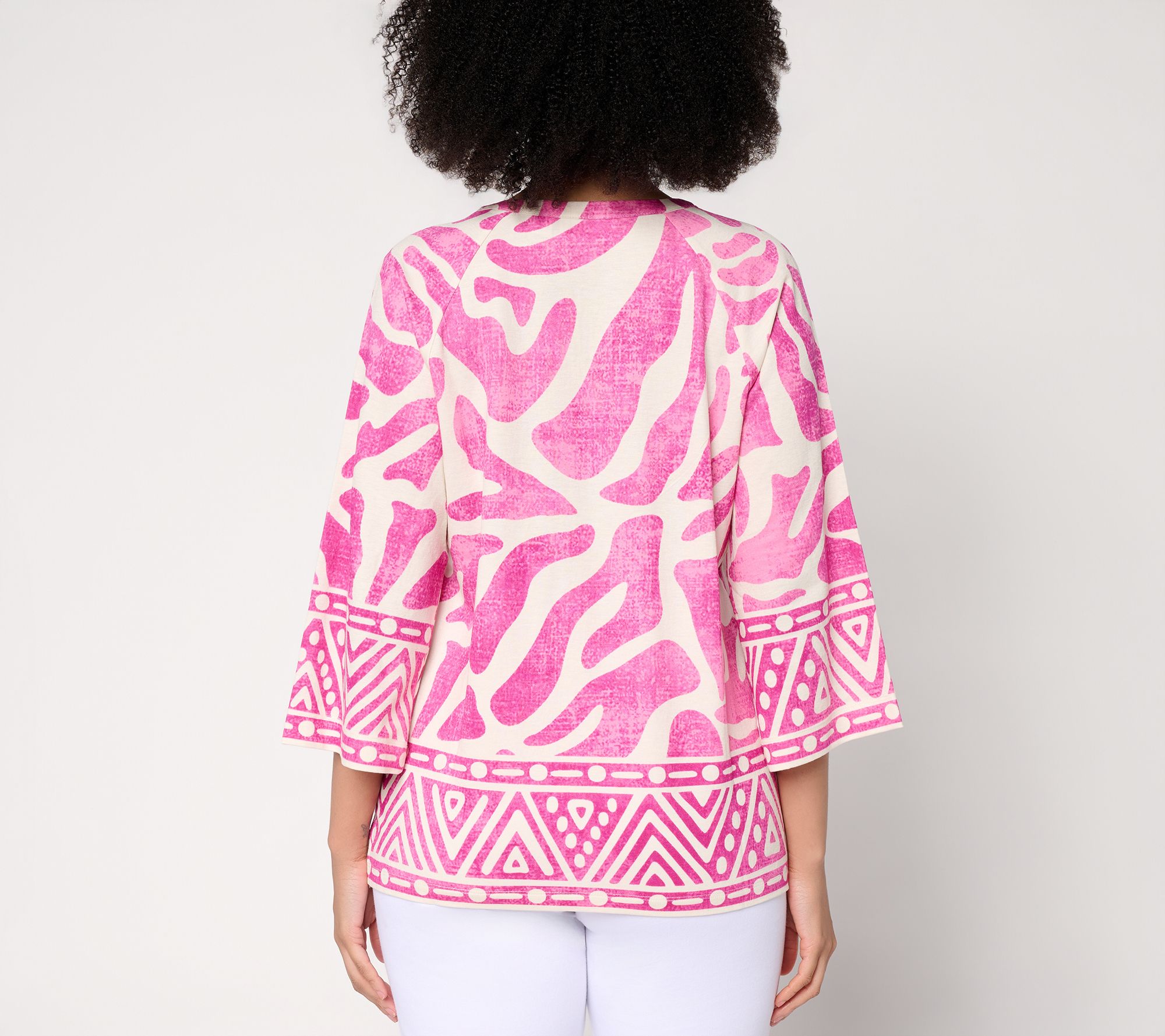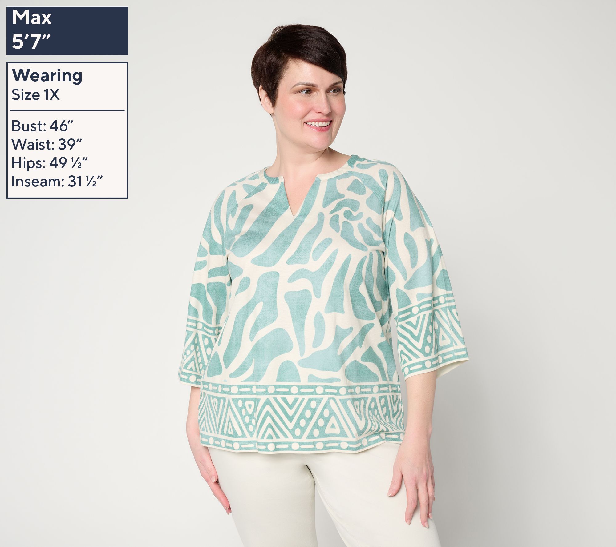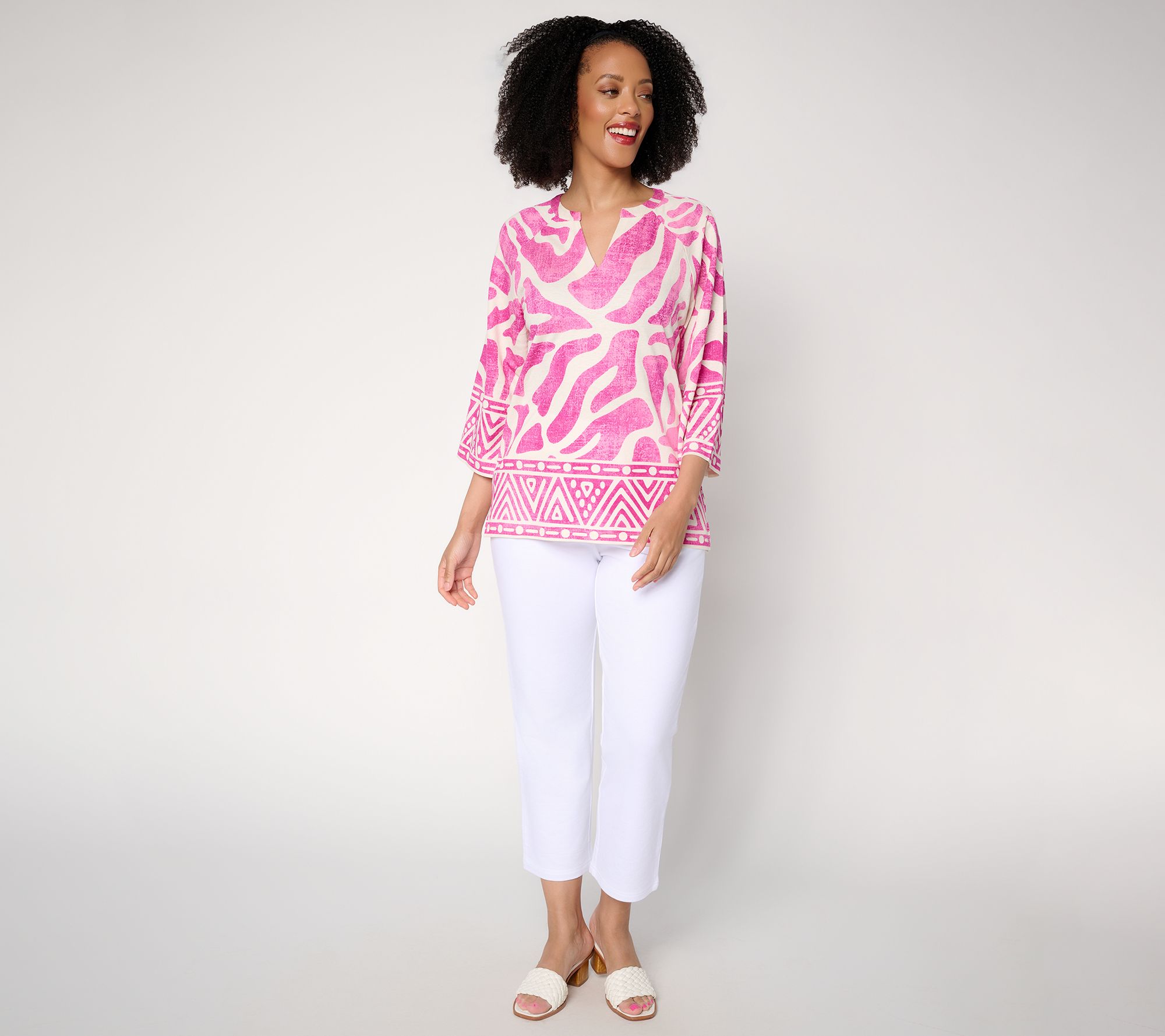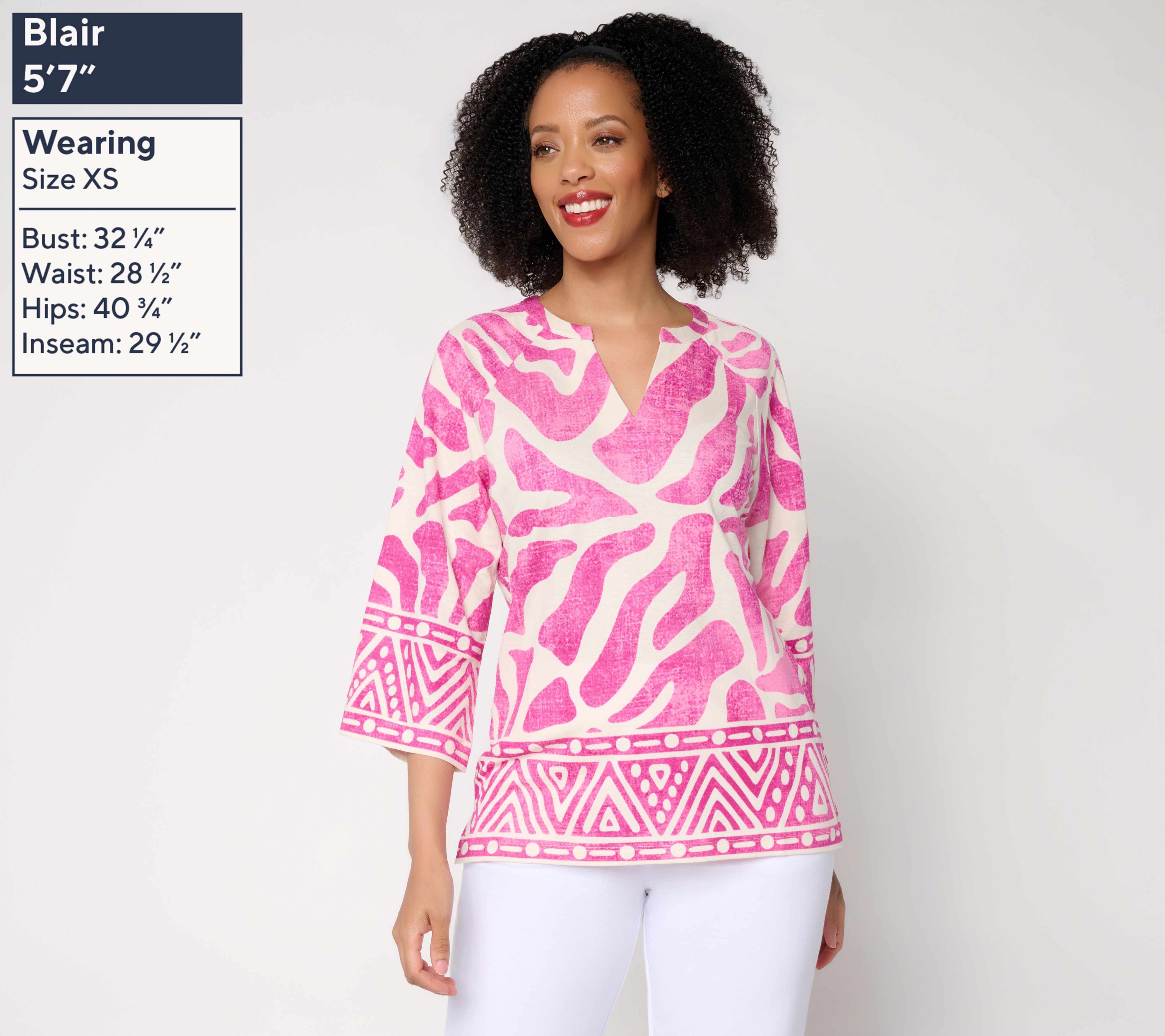 Features: split neck, 3/4-length raglan sleeves, straight hem, border print