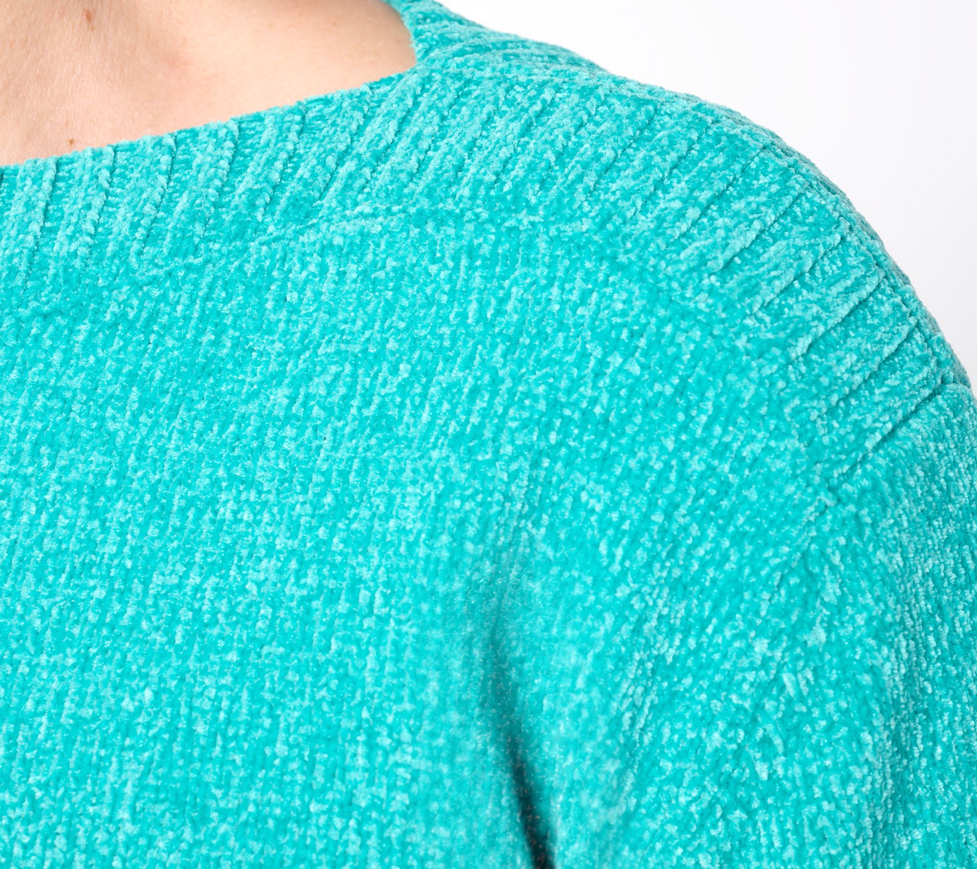 A basic that goes beyond. Q50 ambassador Kim Gravel knows we want cozy style that doesn't cut corners on cuteness. This cool-weather wardrobe essential offers a flattering boatneck up top (instead of the usual crew), along with super-soft chenille that easily gives all the warm and fuzzies. This is a wear-on-repeat winner worthy of grabbing a few colors! From Belle by Kim Gravel.
