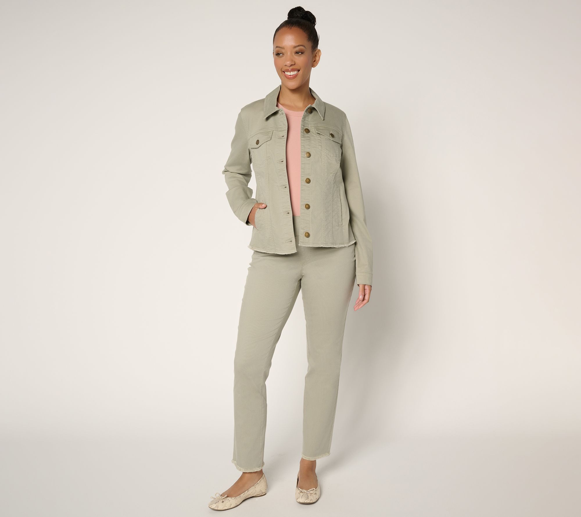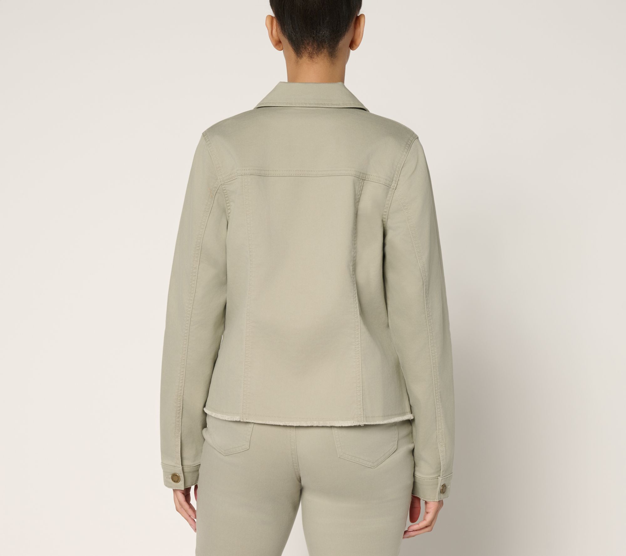Cruising to dinner or headed for an afternoon out, this frayed-hem jean jacket adds effortless cool to just about anything you wear. Layer it over tees and dresses for laid-back style, while semi-fitted tailoring keeps it feeling current and flattering. From Belle by Kim Gravel.