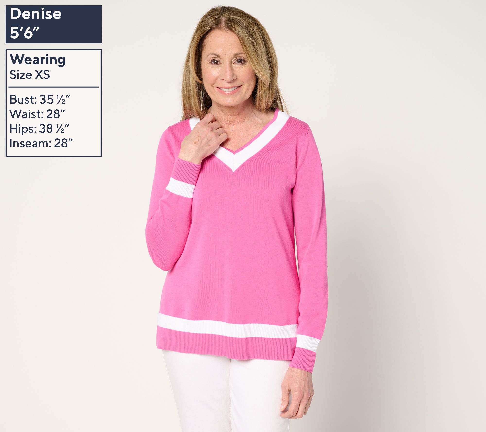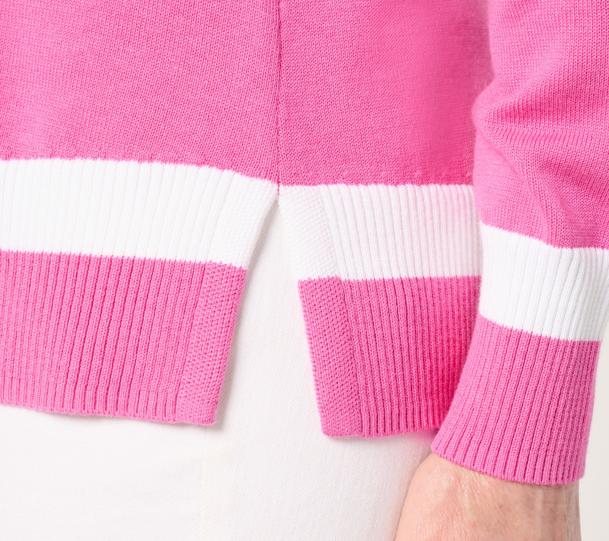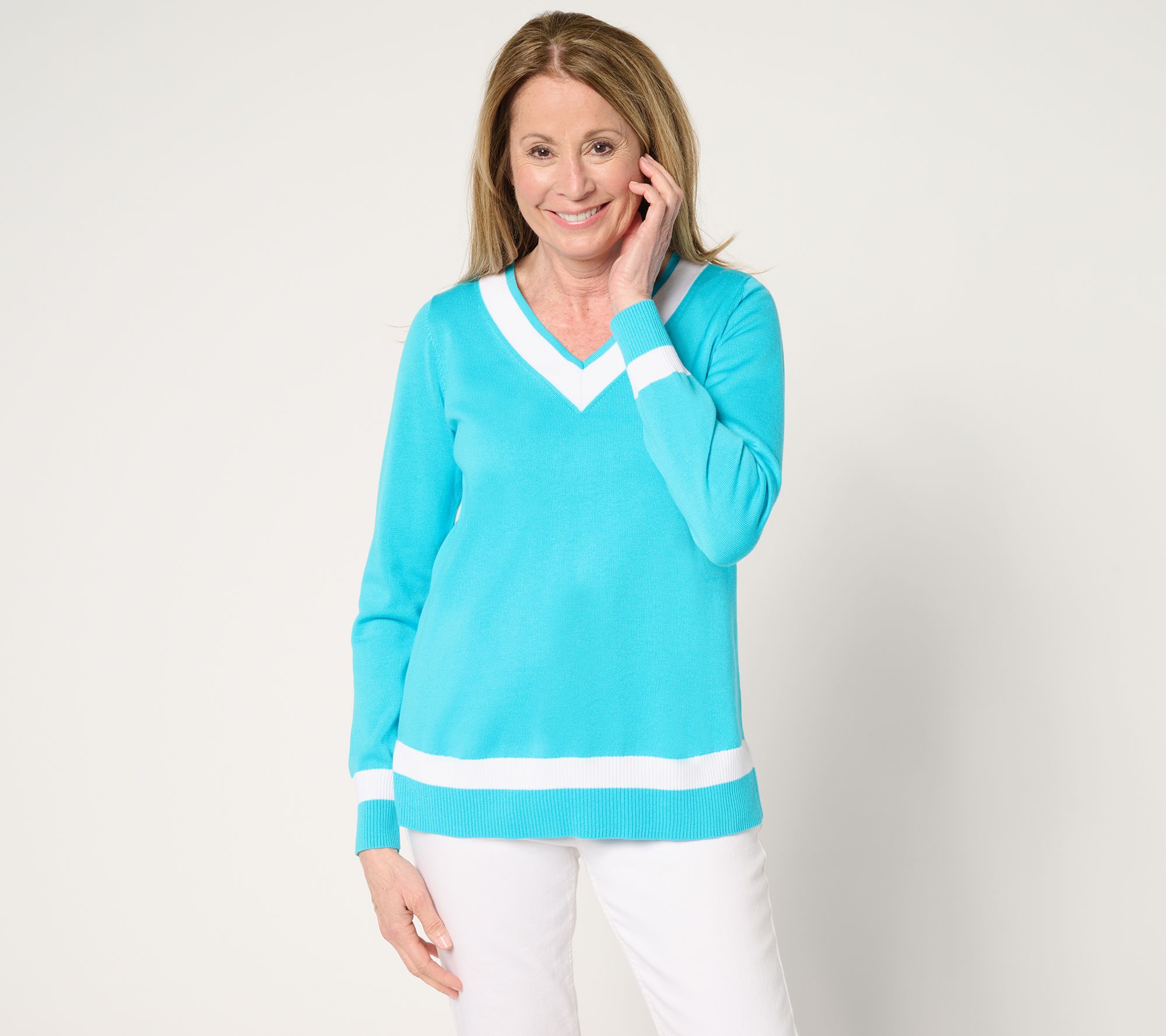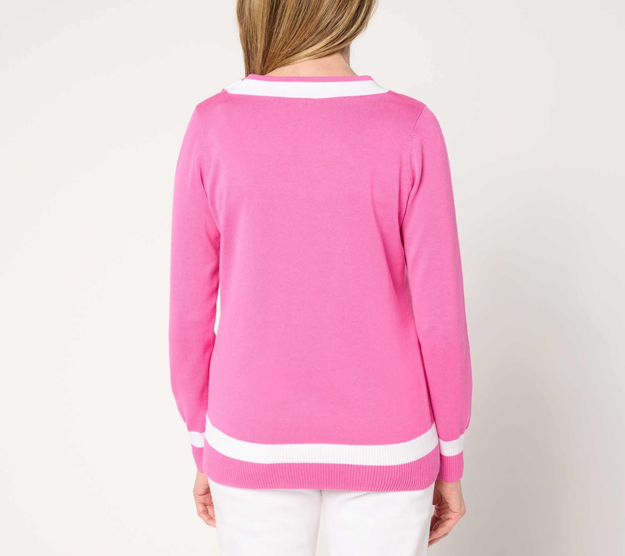 No membership required. Preppy vibes are always on display with Kim Gravel's totally chic (and totally flattering) tipped sweater. Country club-approved, its sporty elegance fits into any event on your active-day agenda. From Belle by Kim Gravel.