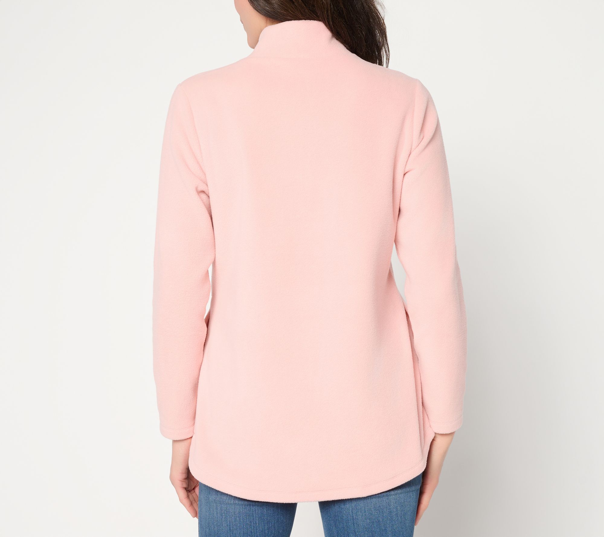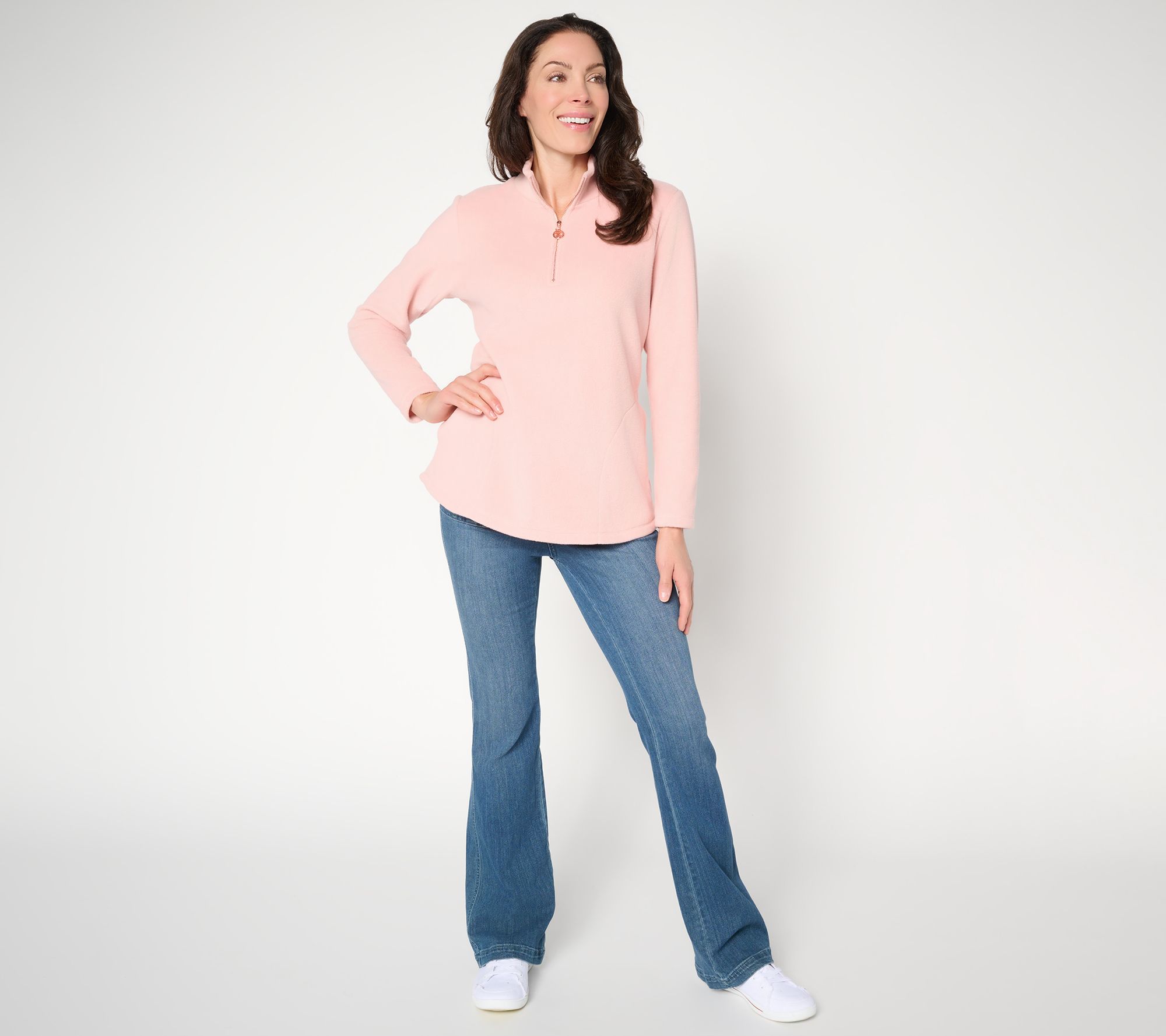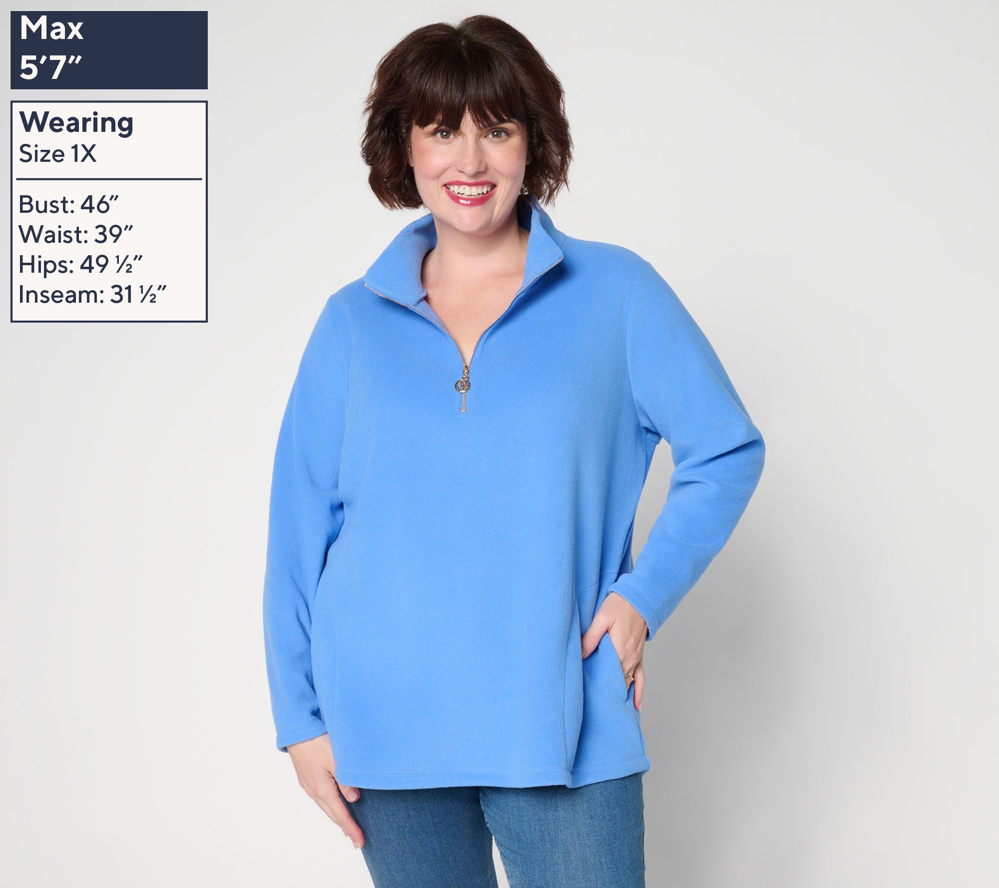 Fleece feels sophisticated (yes!) thanks to Kim Gravel's influence. She's crafted this half-zip with polished hardware, a shape-flattering shirttail hem, and generous side pockets that don't add bulk. Pop it on whenever you want to elevate your everyday -- hanging with your crew, traveling, or entertaining -- but still need to feel really, really cozy. From Belle by Kim Gravel.