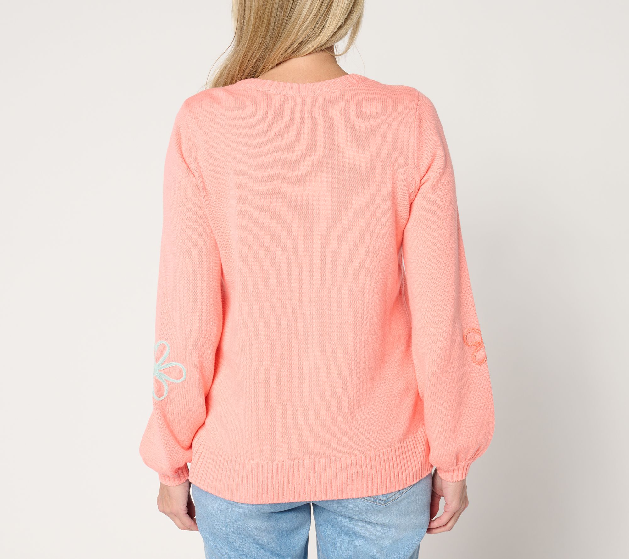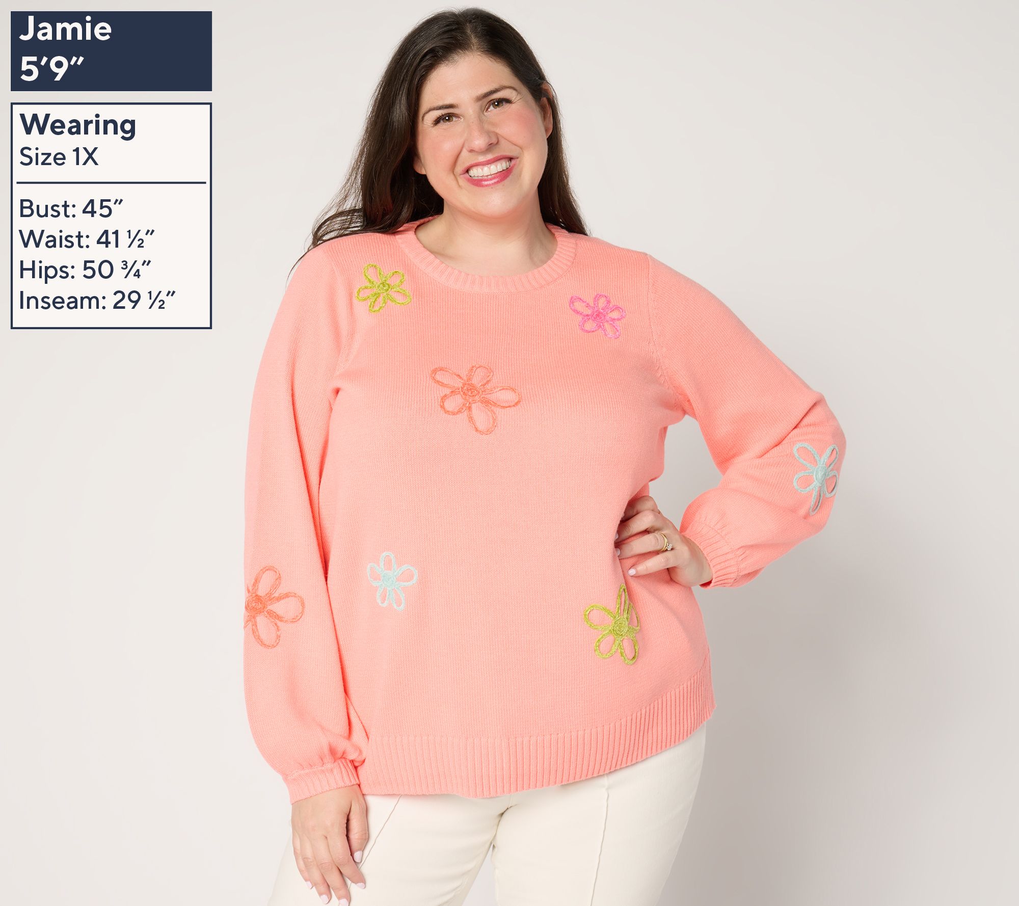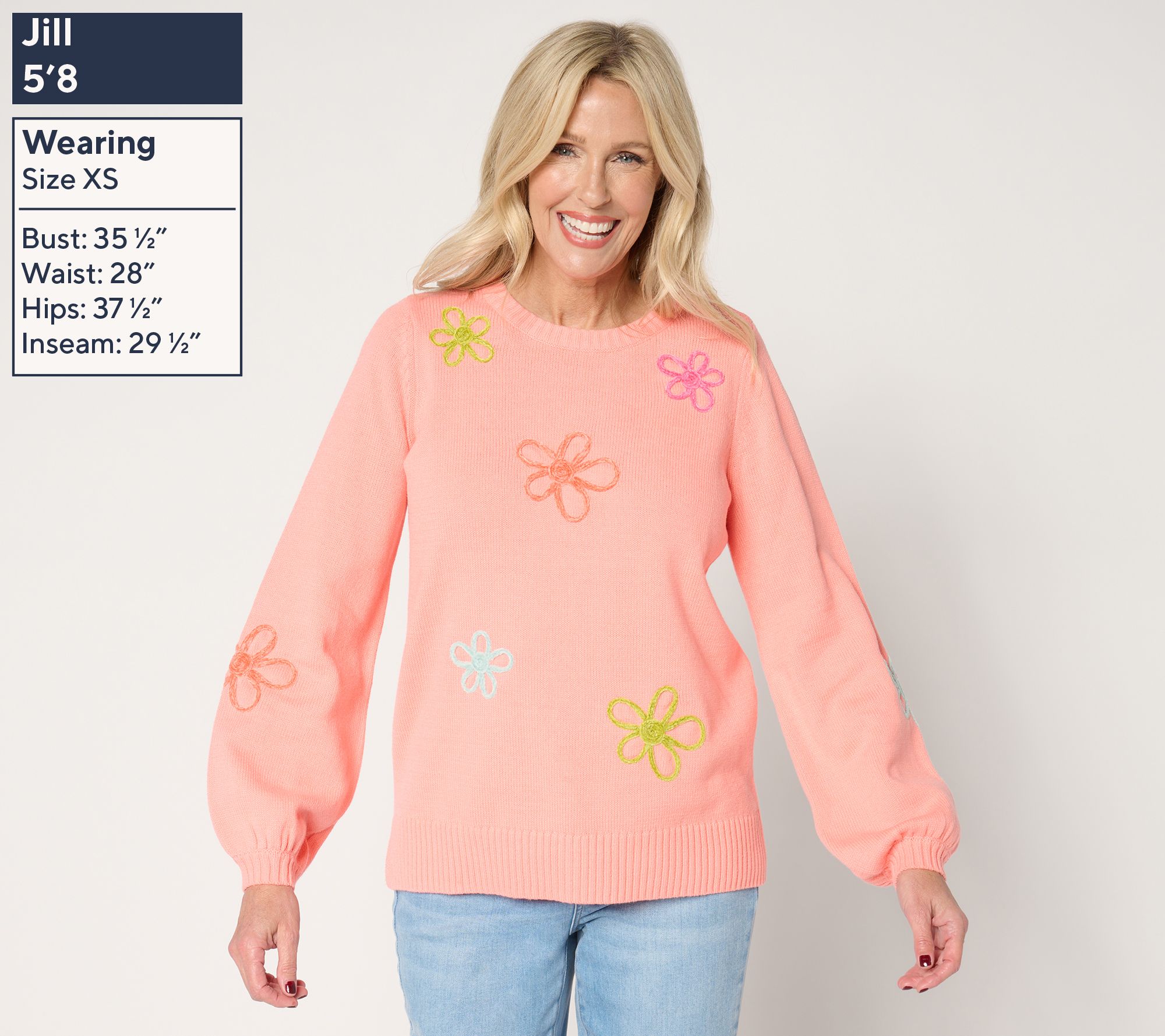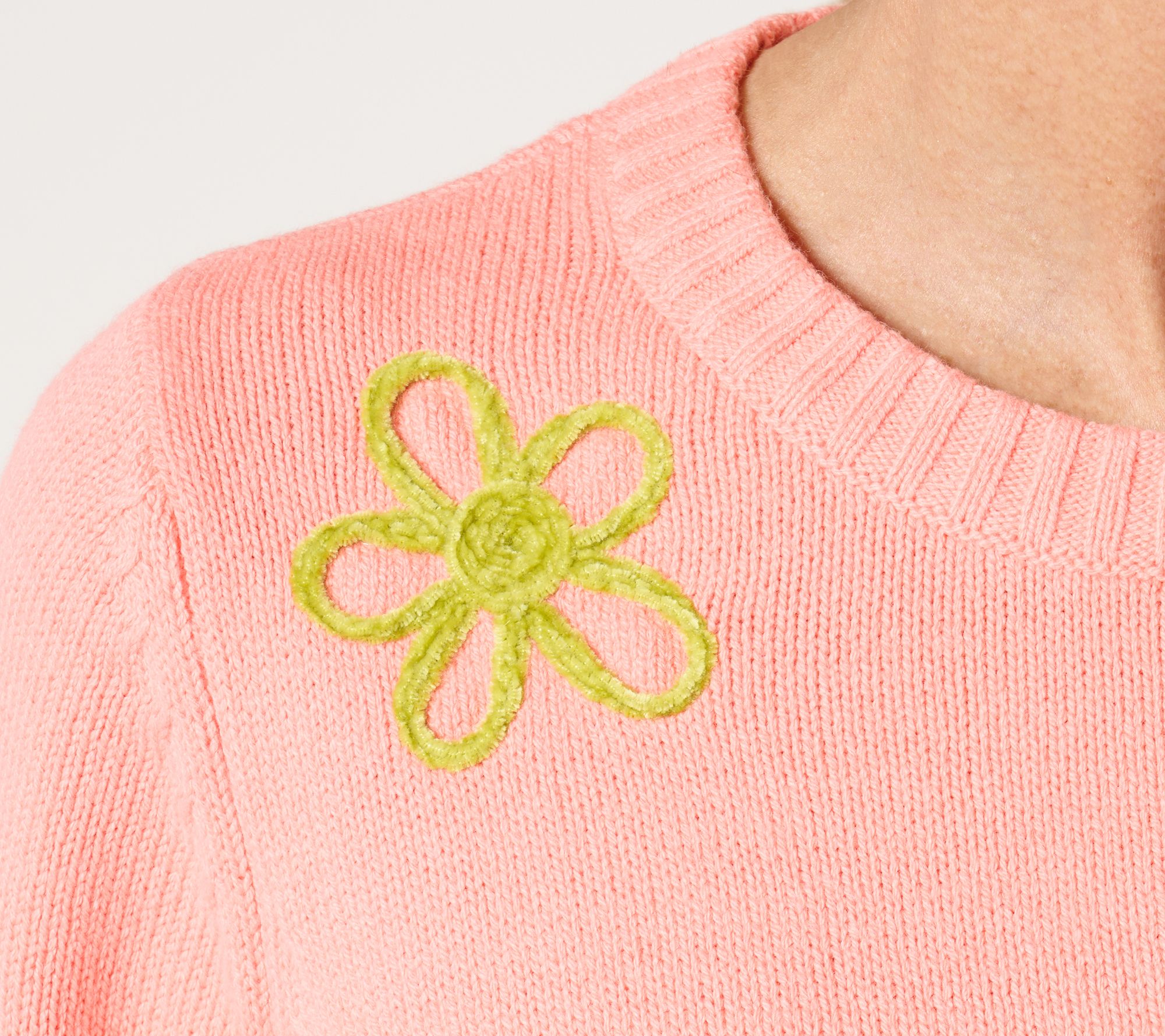 When it comes to sweaters, we love our stripes, solids, and polka dots. But to cultivate some cozy playfulness, we're reaching for this daisy design pullover in soft-as-a-petal chenille. From Belle by Kim Gravel.