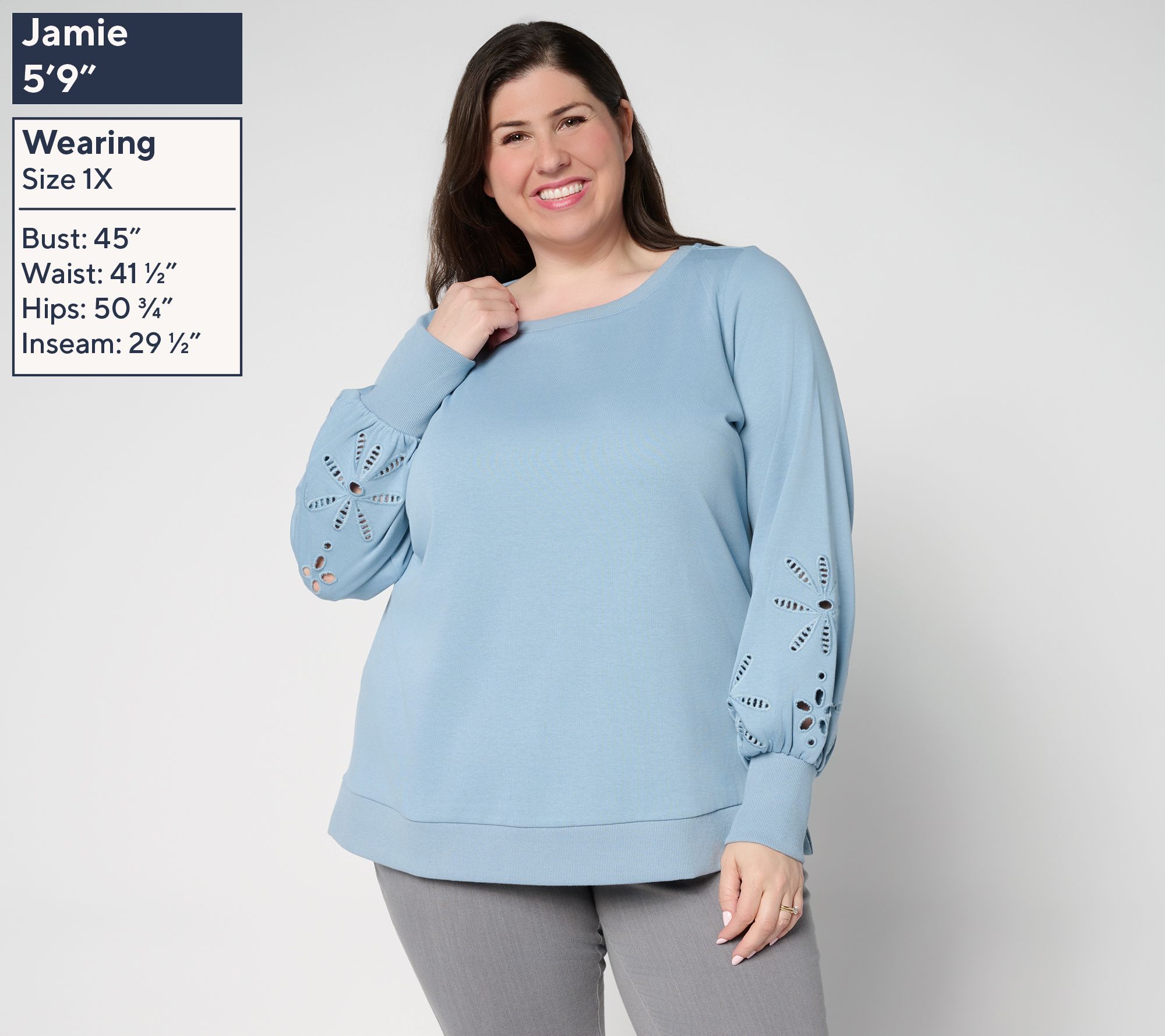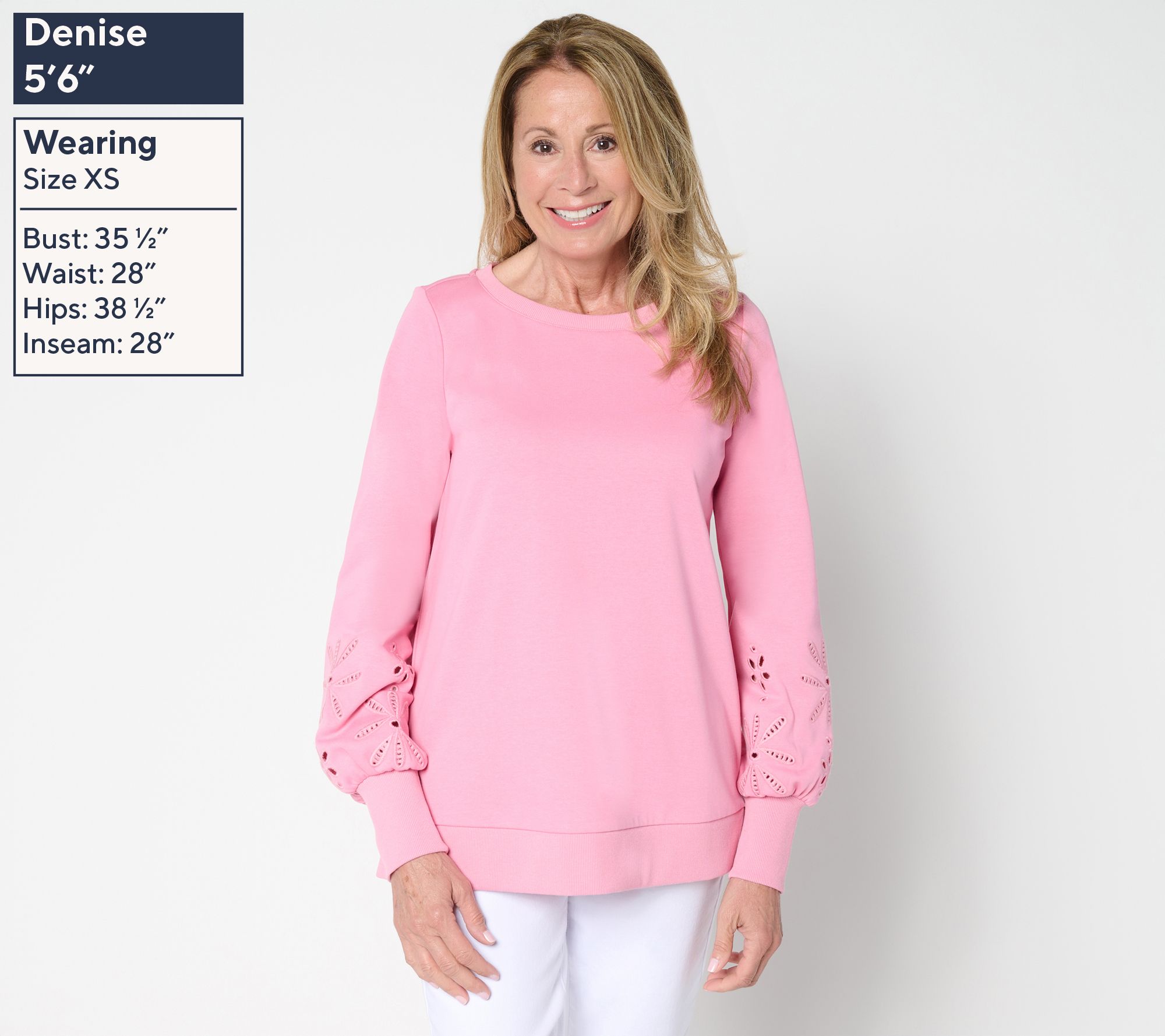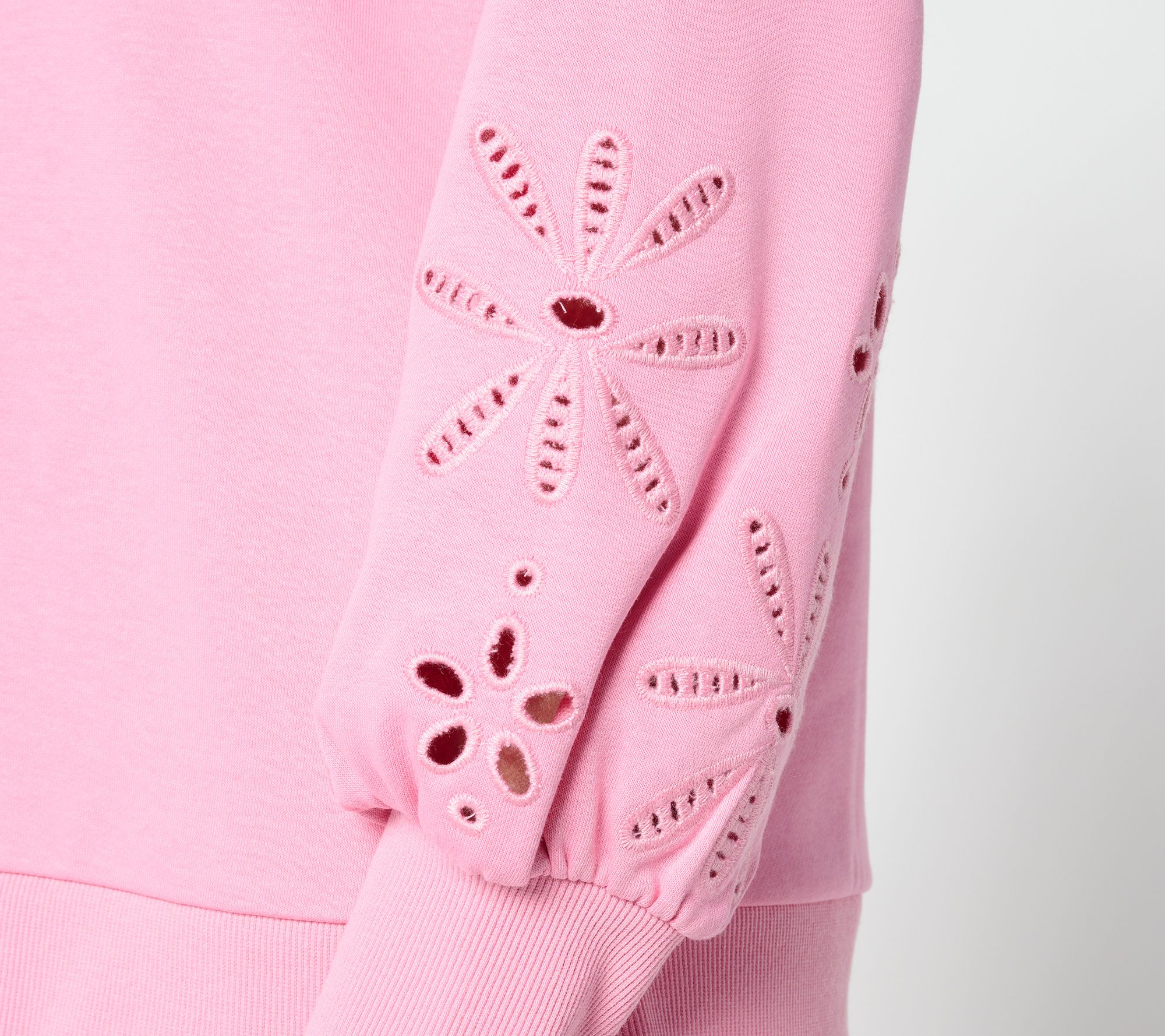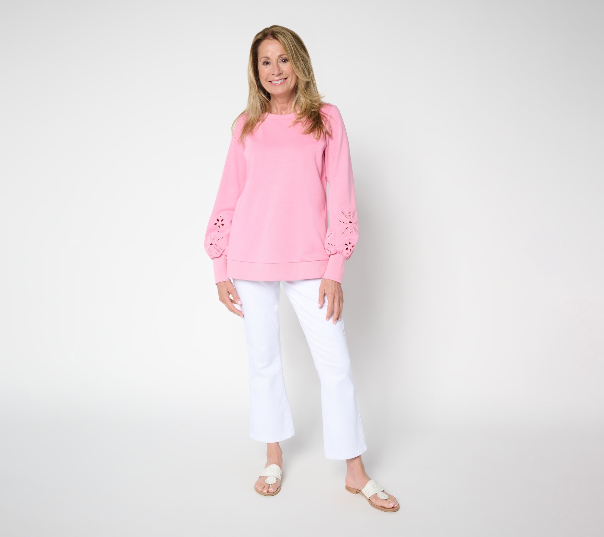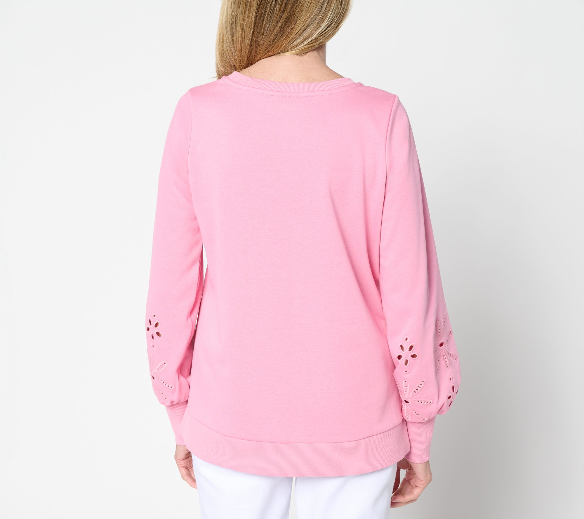 Sweeter sweats? Right this way! Floral eyelet cutouts above the cuffs infuse this crewneck sweatshirt with breezy charm, while blouson sleeves and soft knit fabric keep things feeling relaxed and stylish. Slip it on with jeans or joggers to easily brighten up your casual routine. From Belle by Kim Gravel.