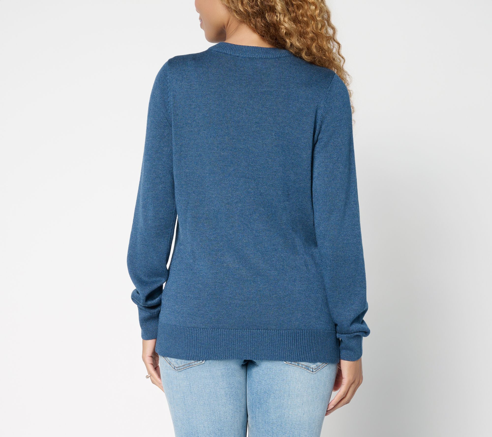 Features: long sleeves, crew neckline, rib cuffs and bottom band, straight hem with side slits