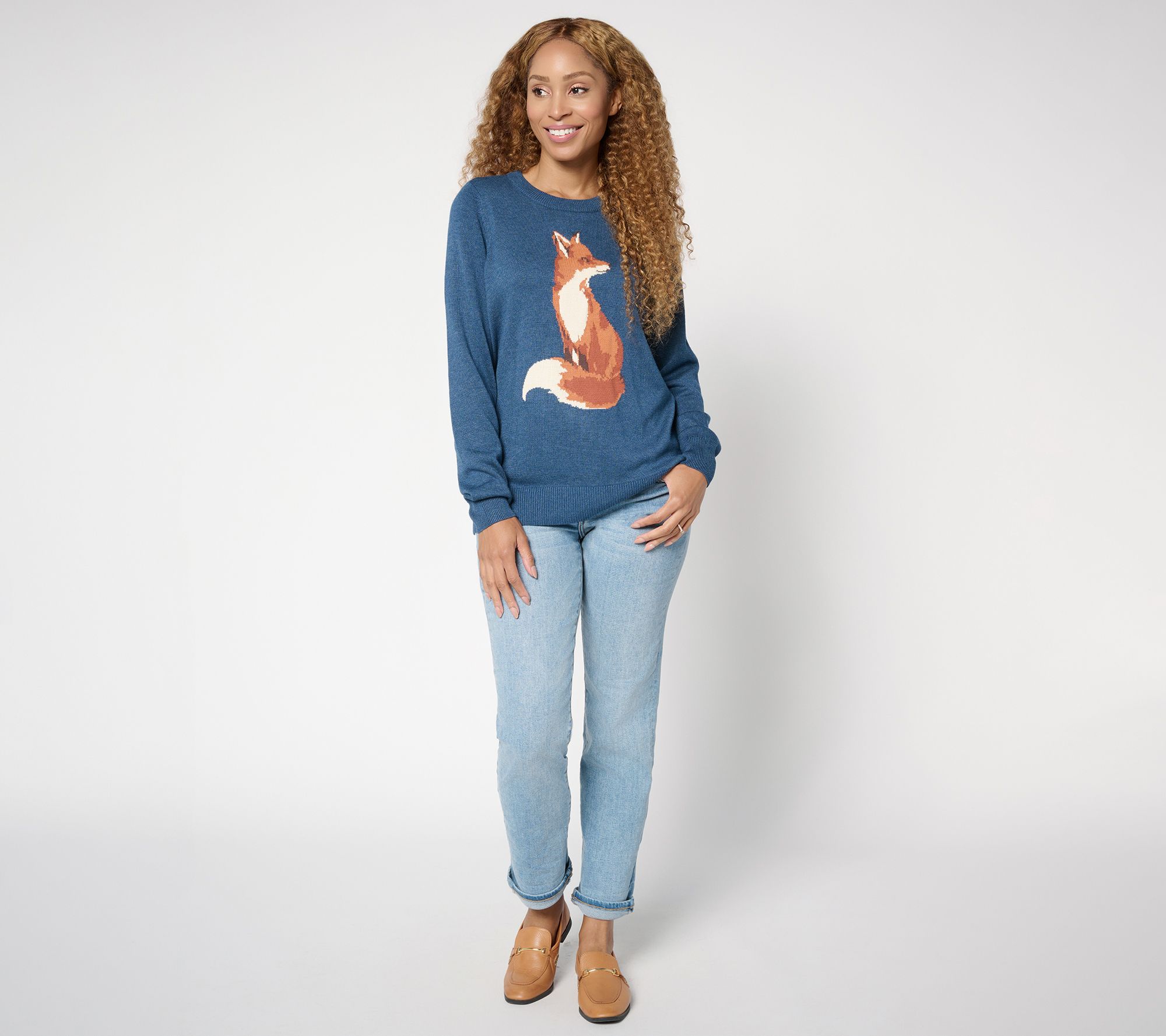 Soft ribbed finishes and a foxy focal point give this crewneck sweater a classic yet playful appeal. Wear it with your favorite jeans for fall festivities and layer it over a long-sleeve tee for winter warmth. Either way, its combination of cuteness and comfort make it an irresistible option when the weather turns cooler. From Belle by Kim Gravel.