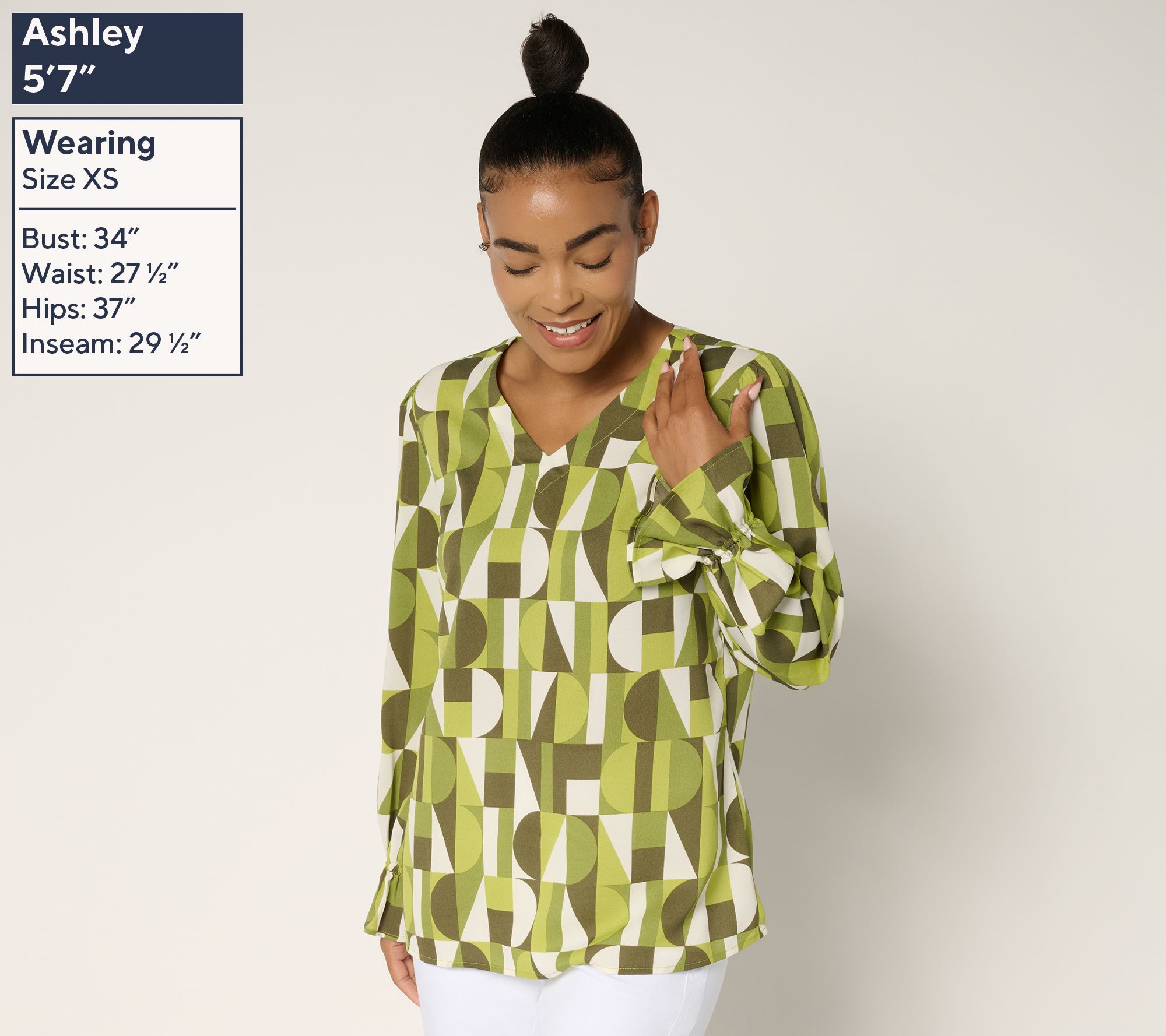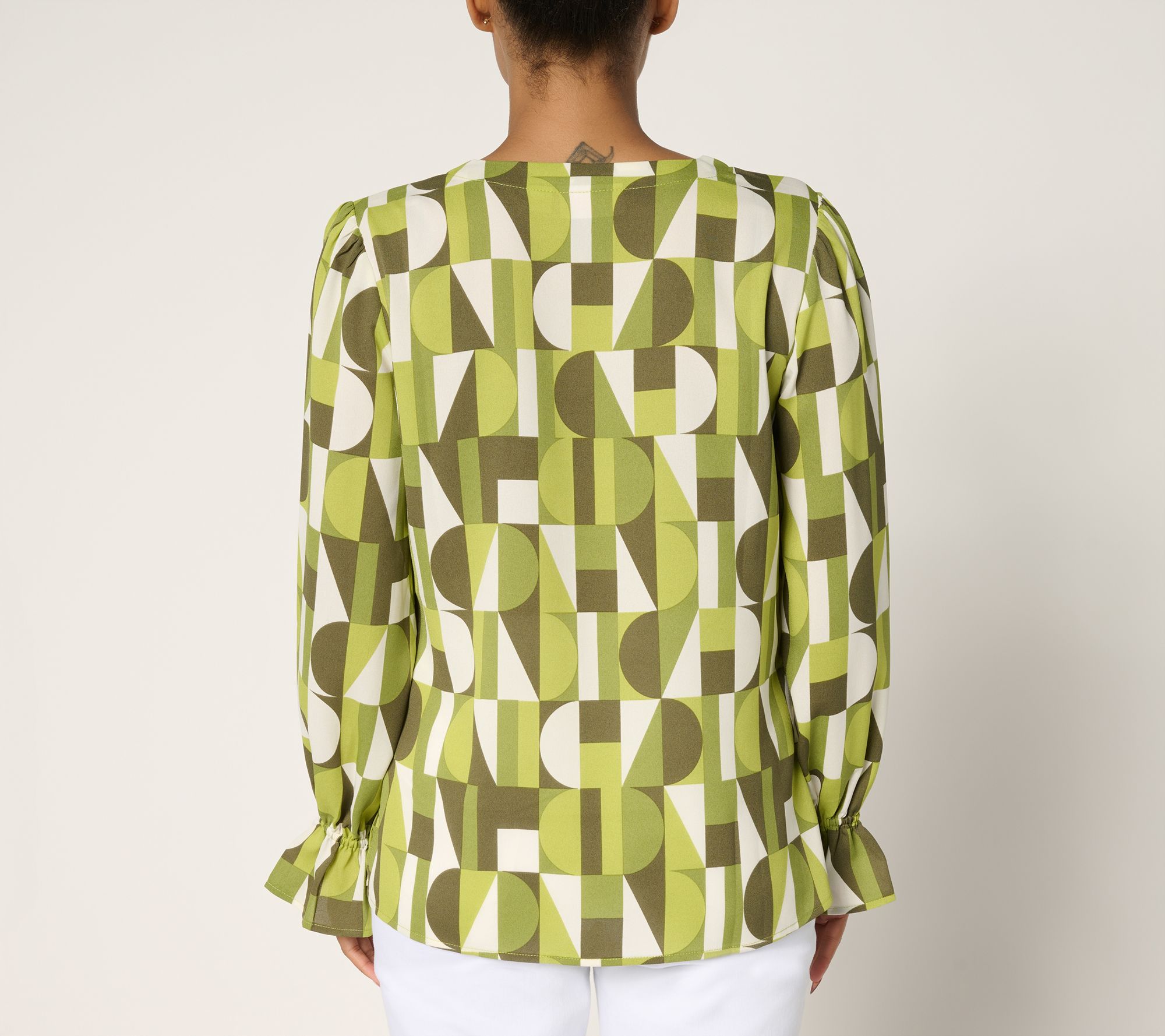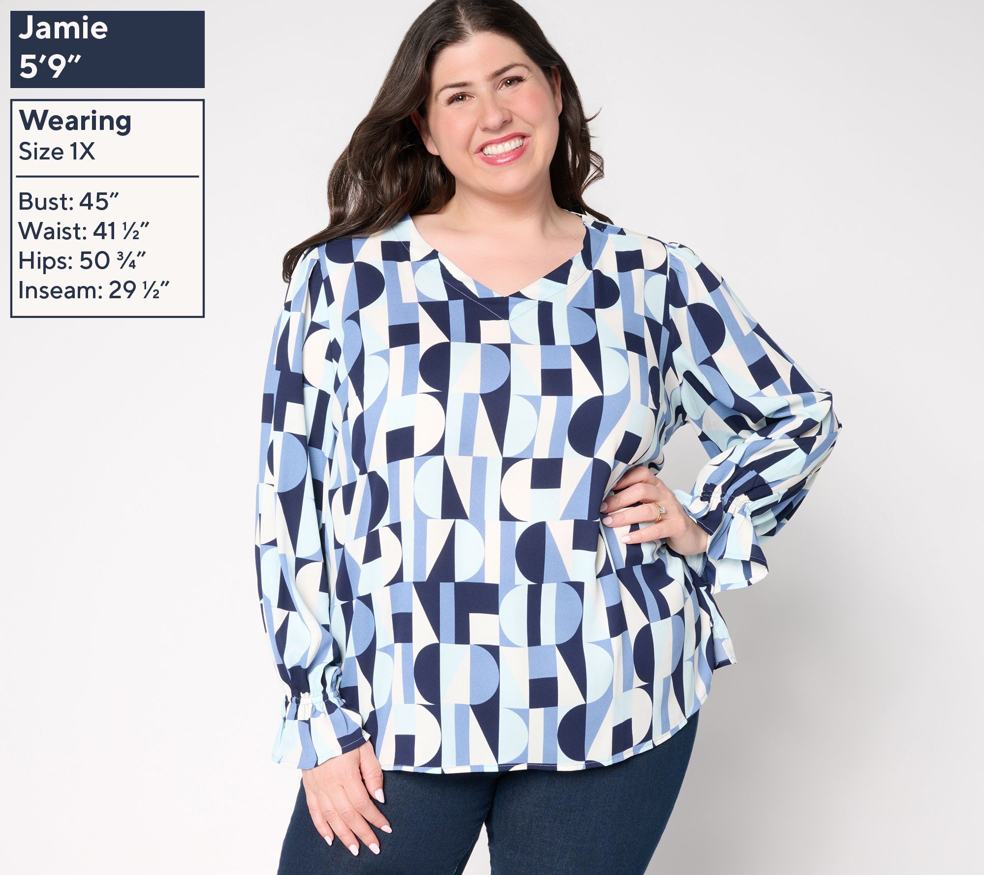 Want to feel fierce, fabulous, and feminine all at once? This V-neck blouse boasts standout style with a bold geo print that means business Monday through Friday. For Saturday nights and Sunday brunches, its ruffled cuffs provide a playful vibe that hints at your romantic side. From Belle by Kim Gravel.
