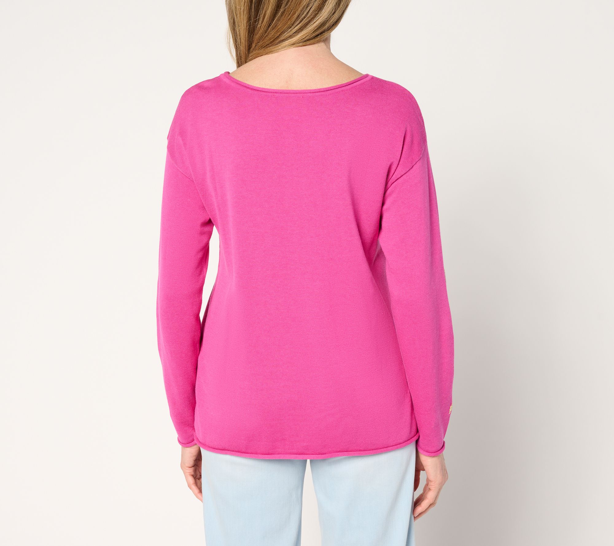 Features: round neck; long sleeves; rolled edge at neck, sleeve, and bottom openings