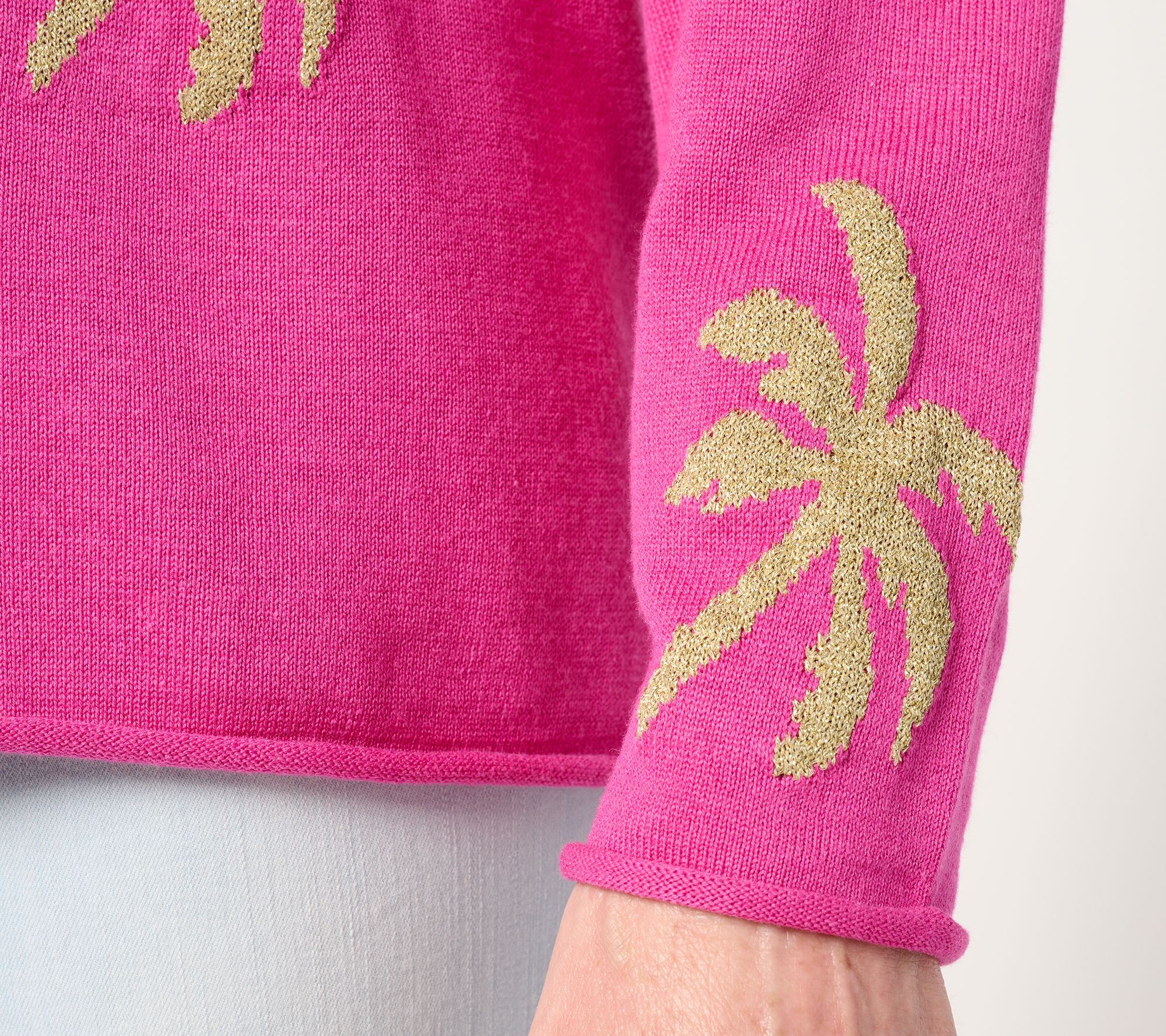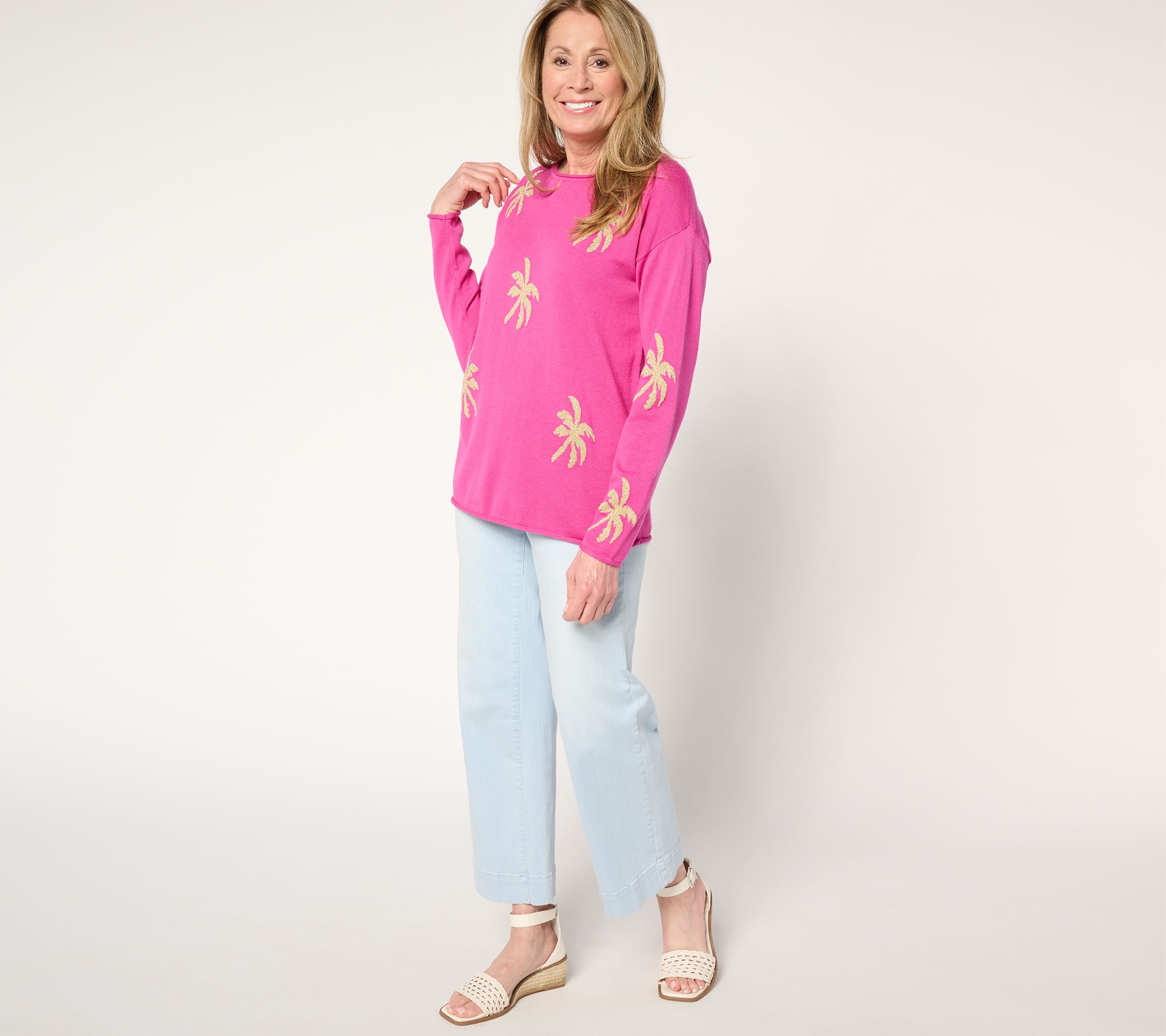 Embrace a vacation vibe anytime with this Golden Palms sweater. Even when you're landlocked, you'll always make a splash in the tropical -themed style, complete with rolled edges at the neck, sleeves, and bottom opening for a subtle finishing touch. From Belle by Kim Gravel.