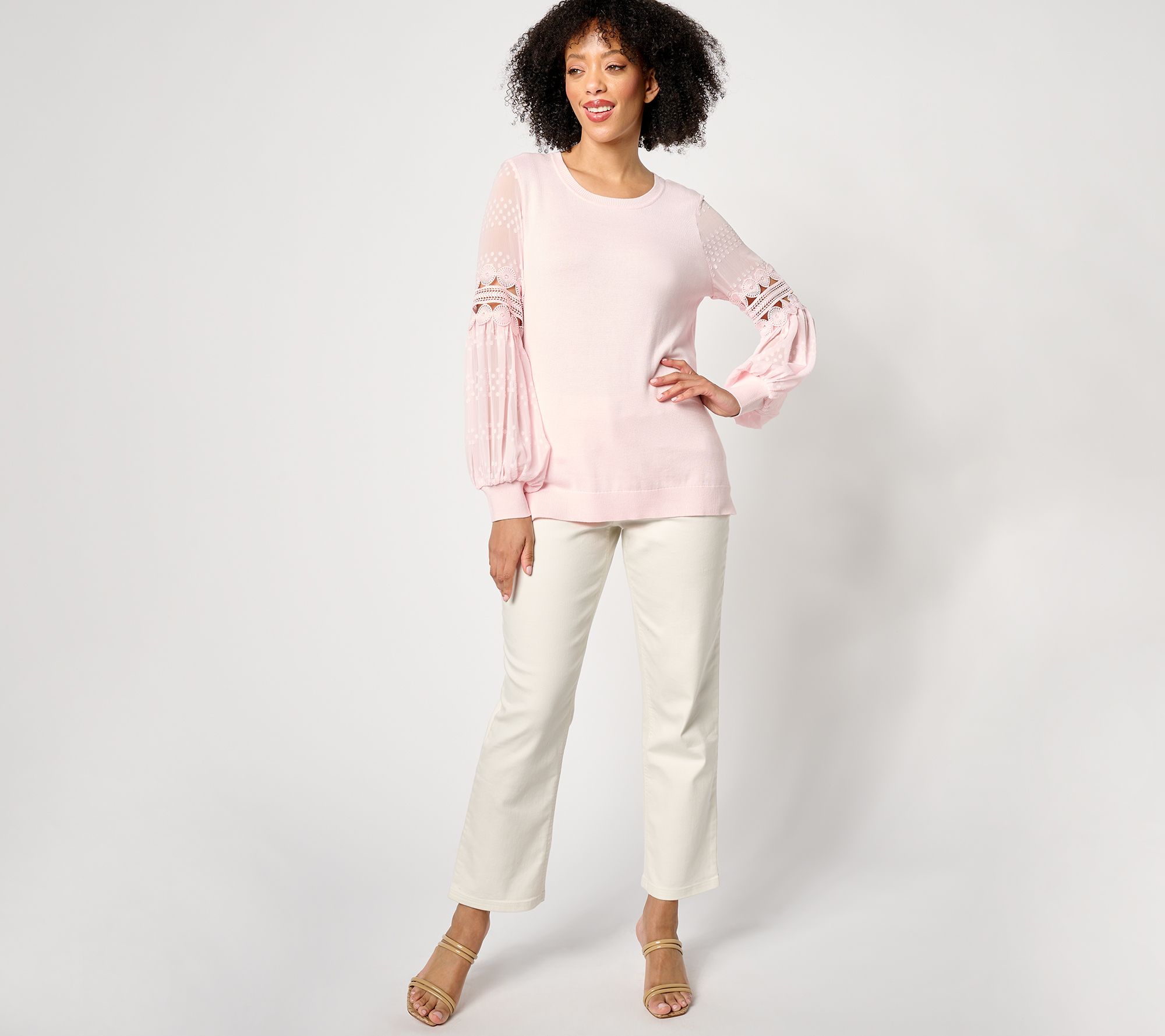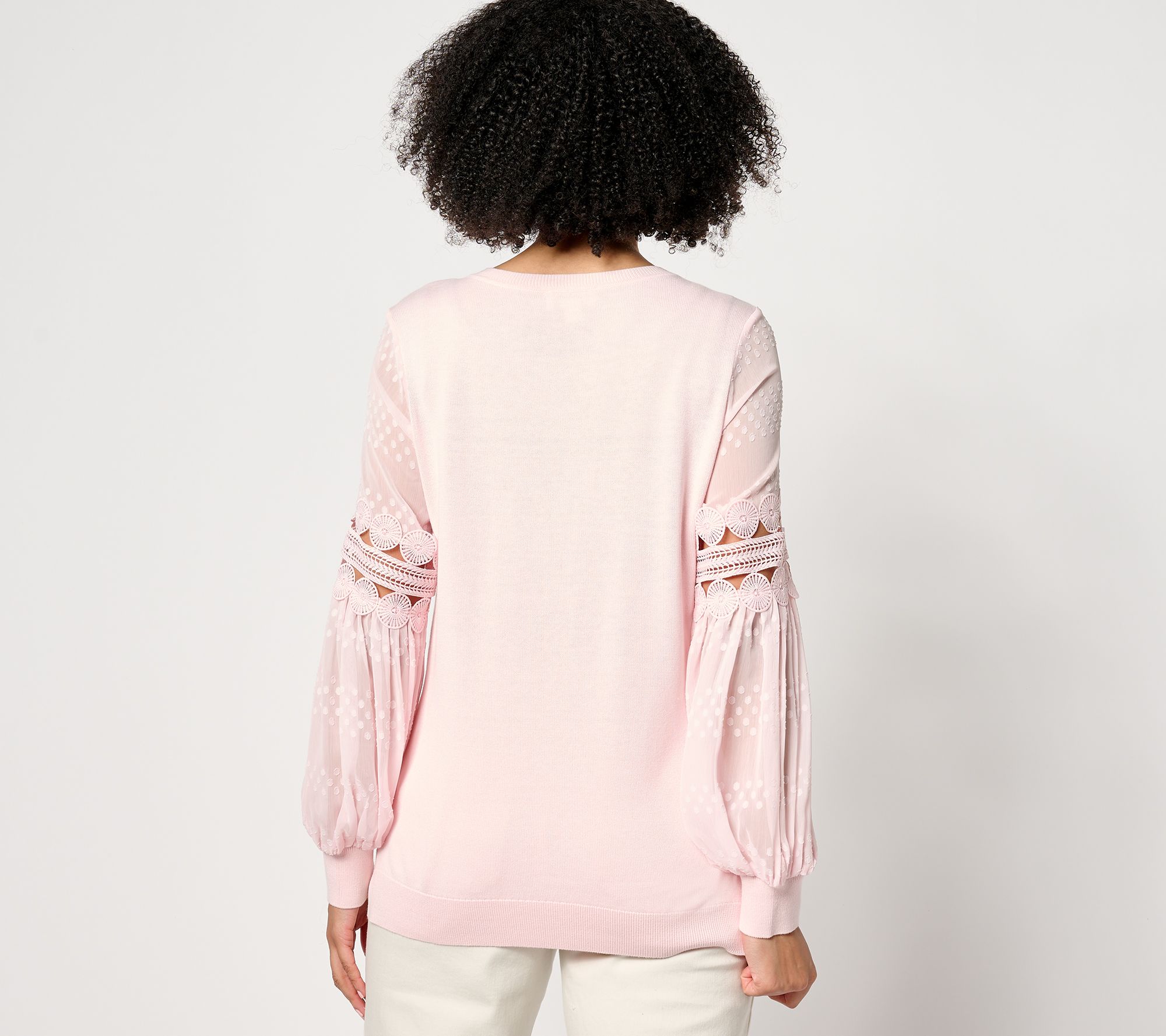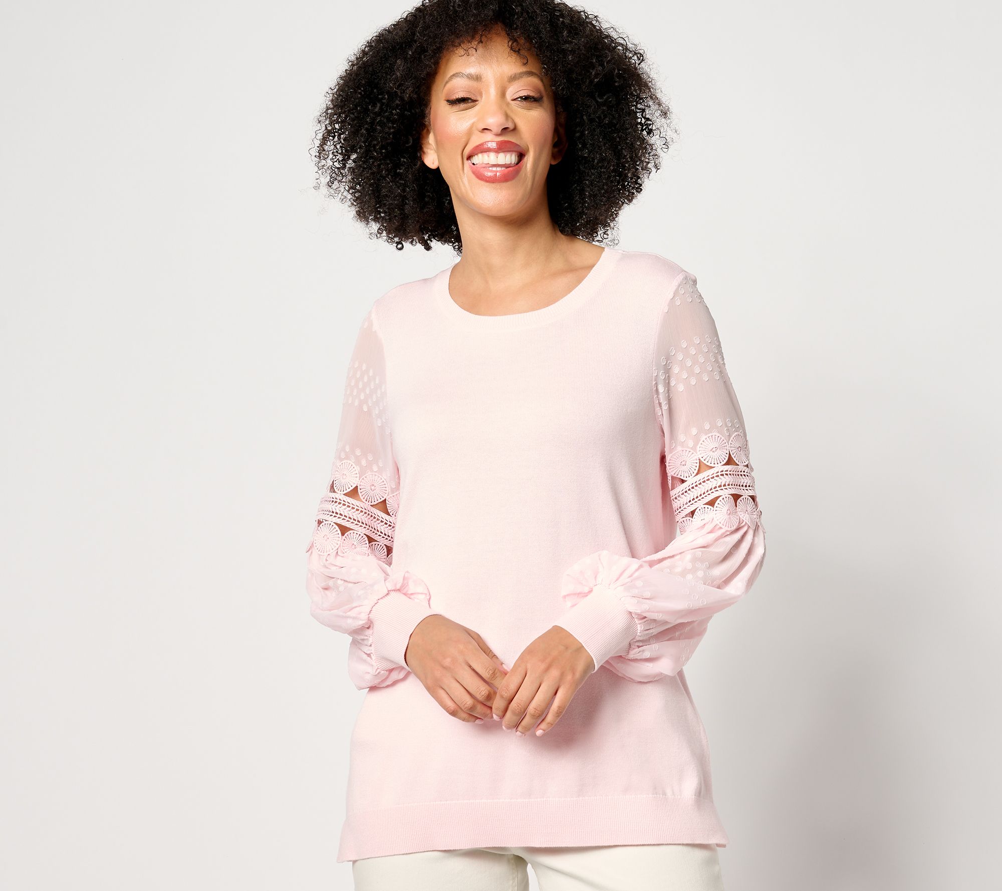 No occasion is too small to dress beautifully. This sweater shows you how, with a smooth sweater-knit body (that's comfy while hosting and toasting) and graceful lace sleeves that feel like a party unto themselves. From Belle by Kim Gravel.