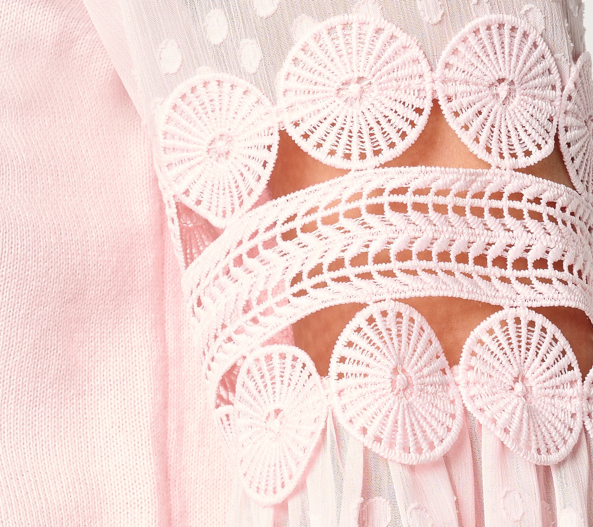 Fabrication: sweater knit body, woven lace-detail long sleeves
