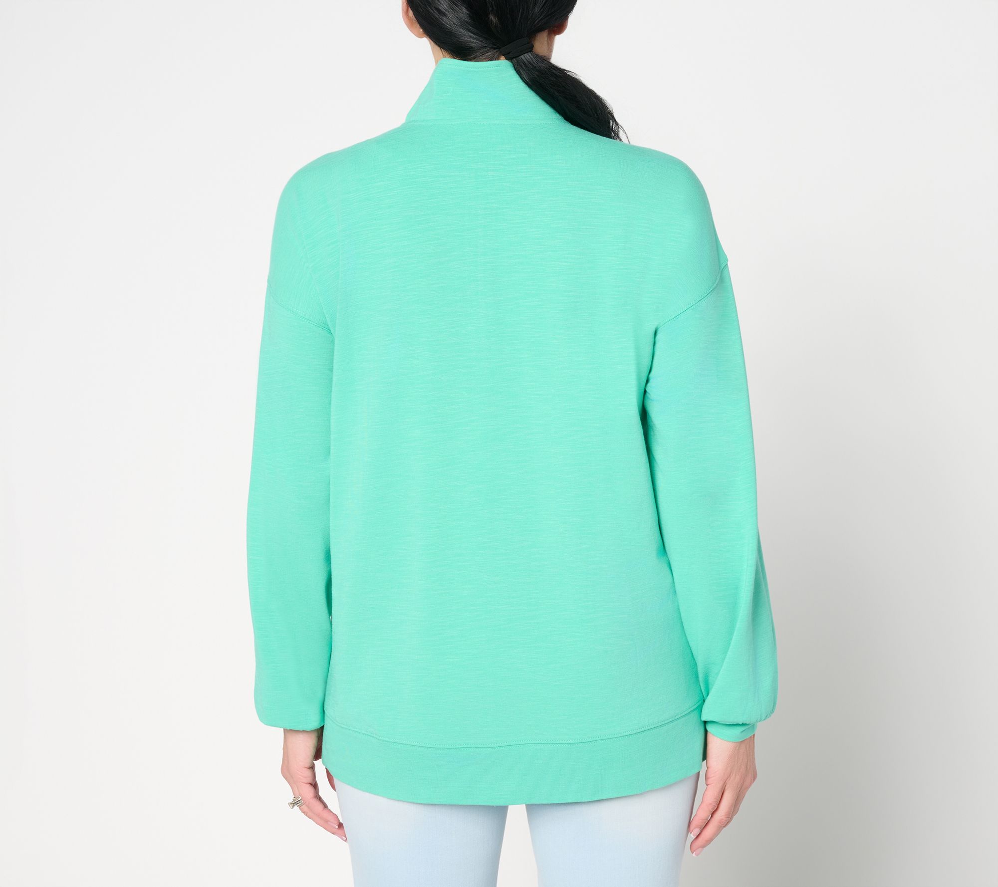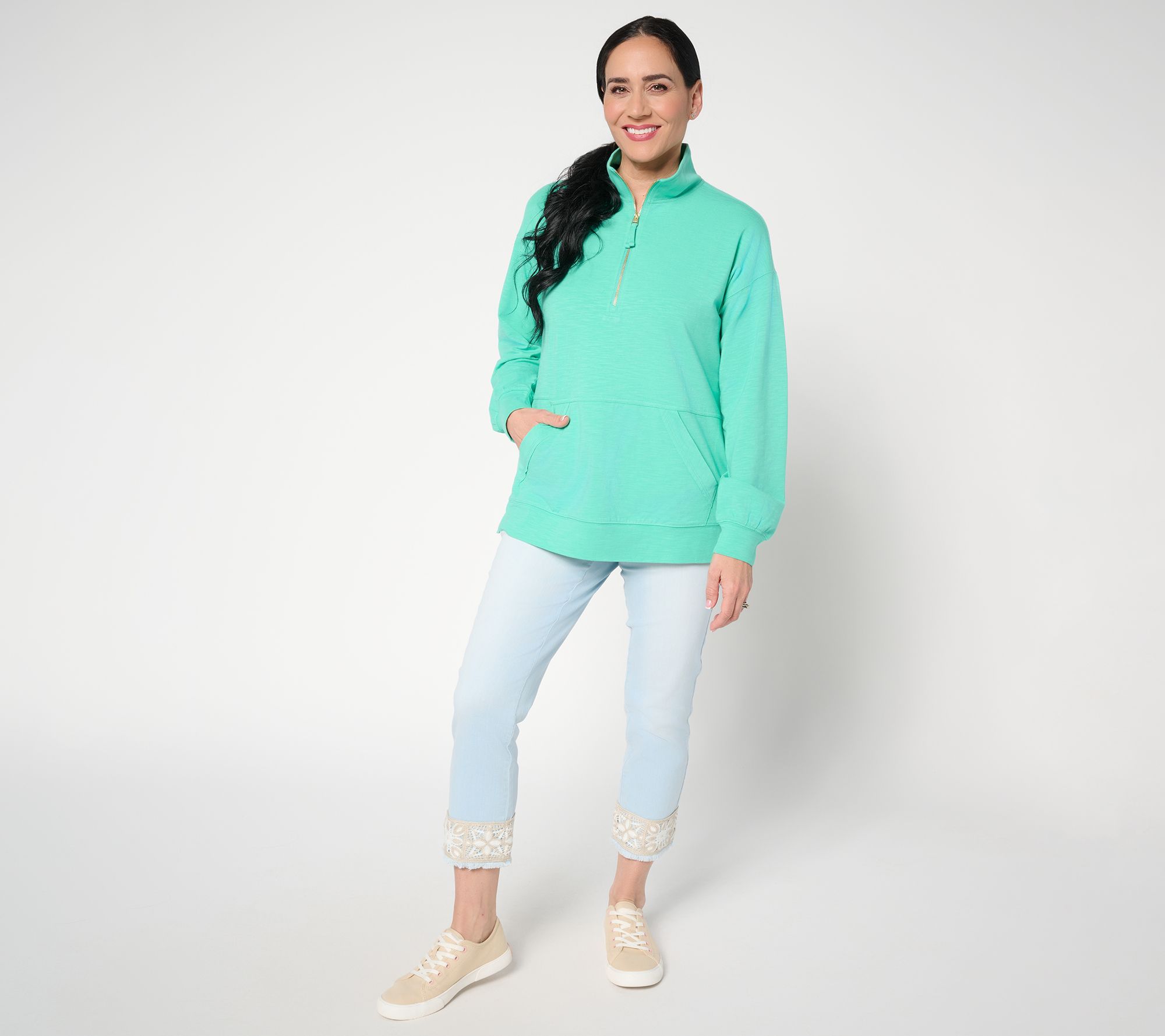 Your casual days deserve a touch of comfort and style, and this half-zip Kanga top delivers both. Whether you're lounging at home, running errands, or enjoying a laid-back weekend outing, the drop-shoulder design and spacious kangaroo pocket provide the perfect blend of functionality and fashion. Pair it with jeans or leggings for an effortless look. From Belle by Kim Gravel.