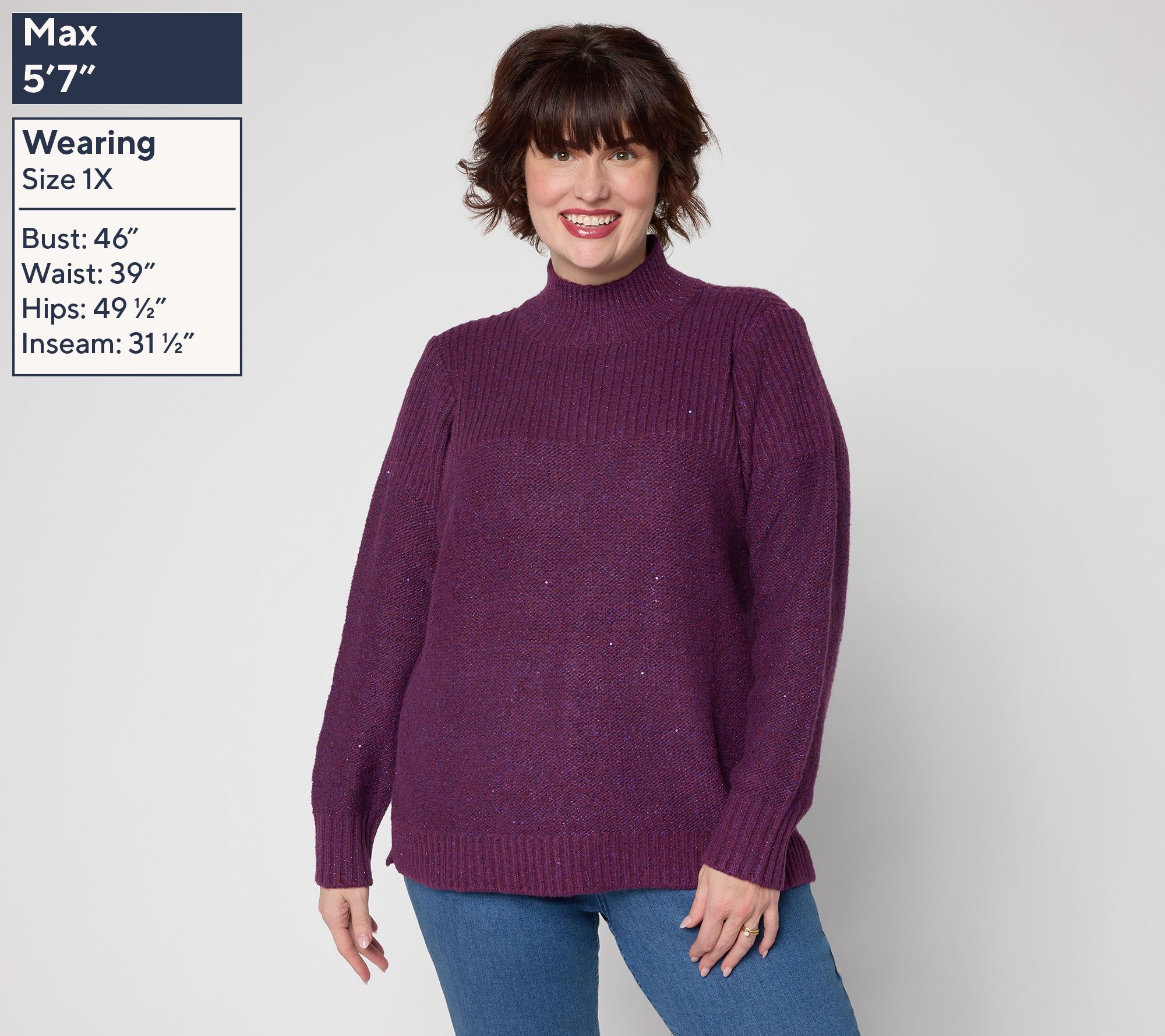Save the big bling for the big parties, Belles -- and let this shimmery mock neck sweater step in when you're heading to the office, a neighbor's house for coffee, or a cozy dinner with your nearest and dearest. Its soft-handed fabrication with just-enough sparkle is the equivalent of your favorite dewy moisturizer or subtle face highlighter. Instant glow up. From Belle by Kim Gravel.