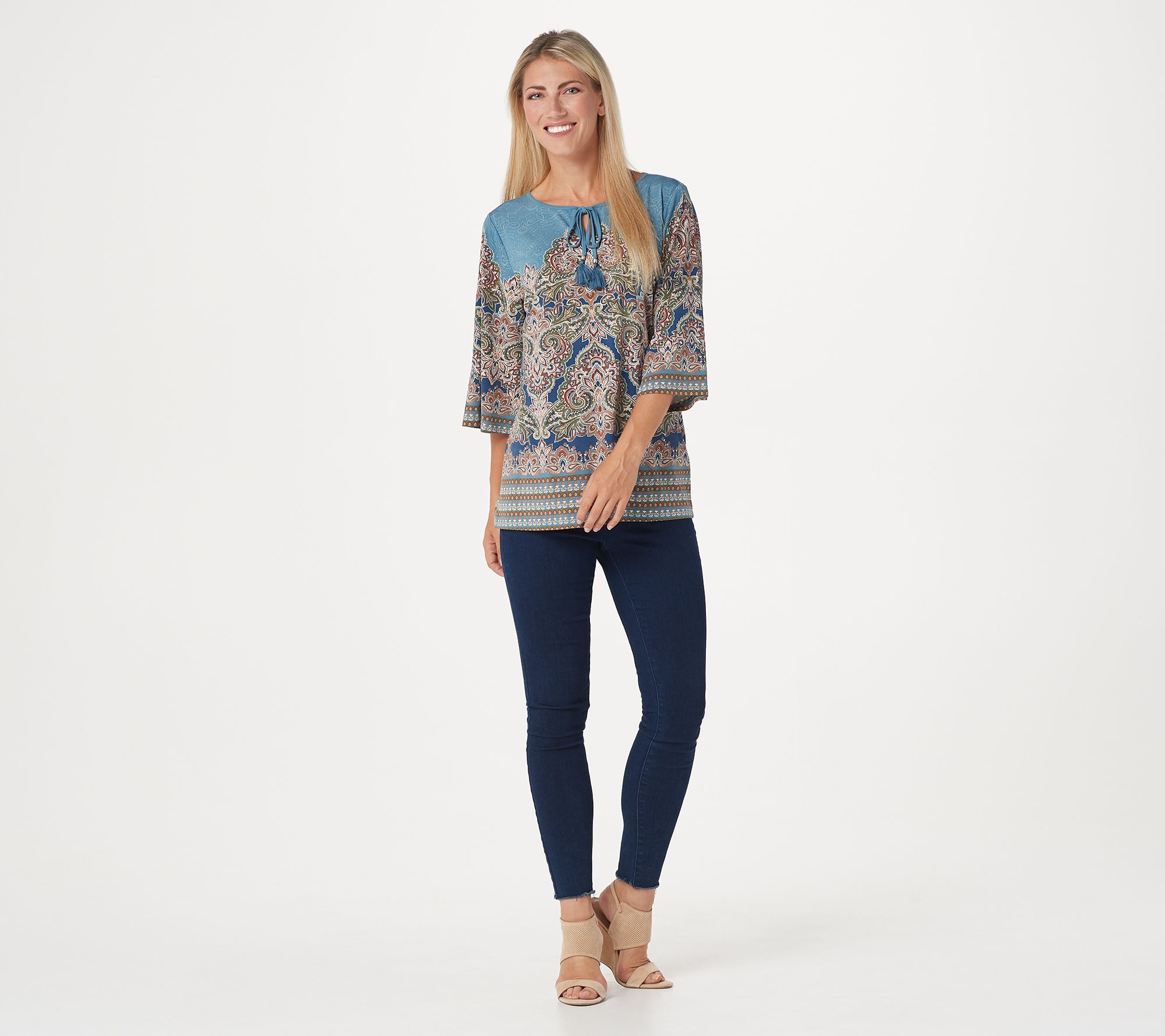 • Features: round neckline with keyhole detail, self-tie drawstring tassels with silvertone trim, 3/4-length sleeves, paisley placement print