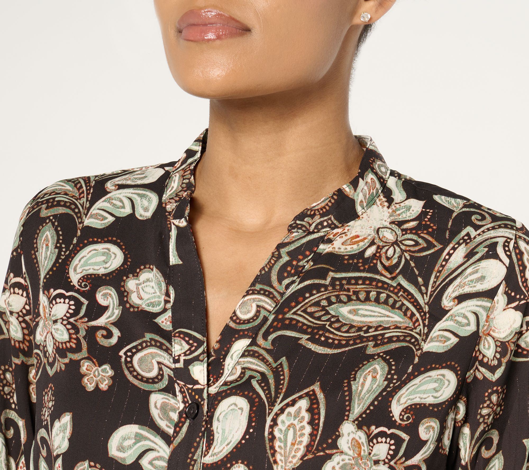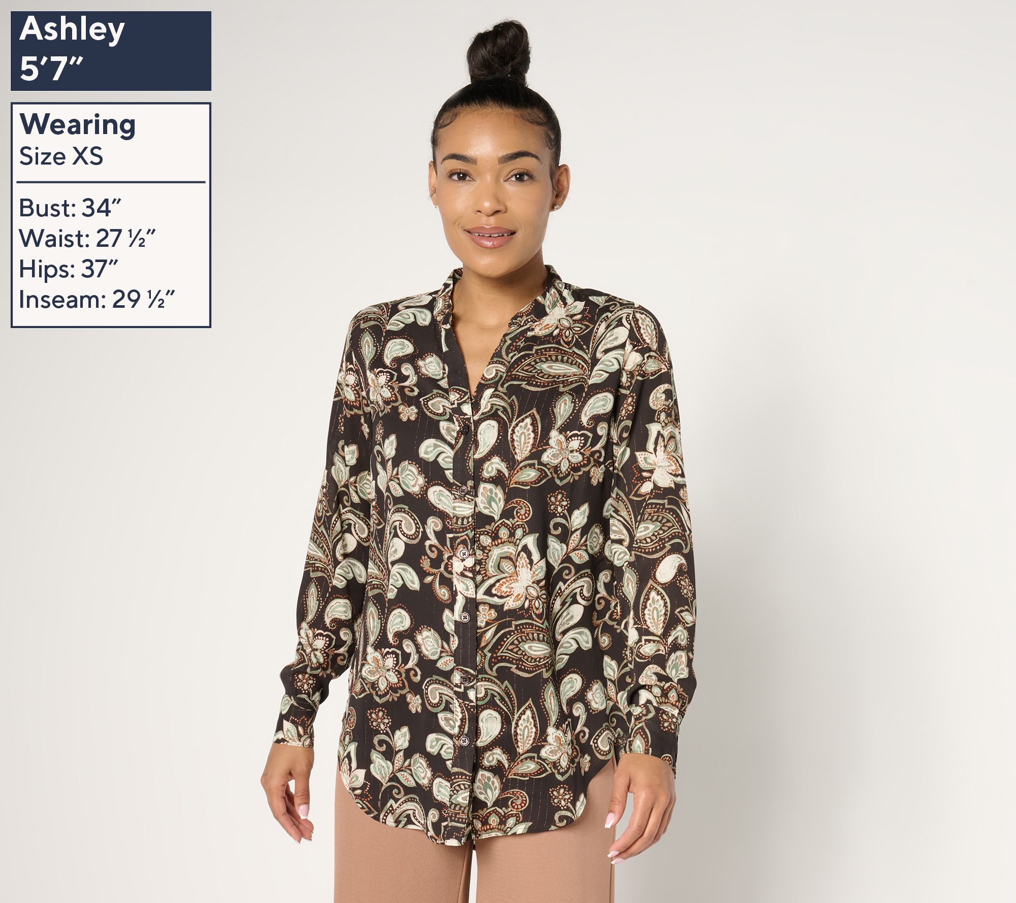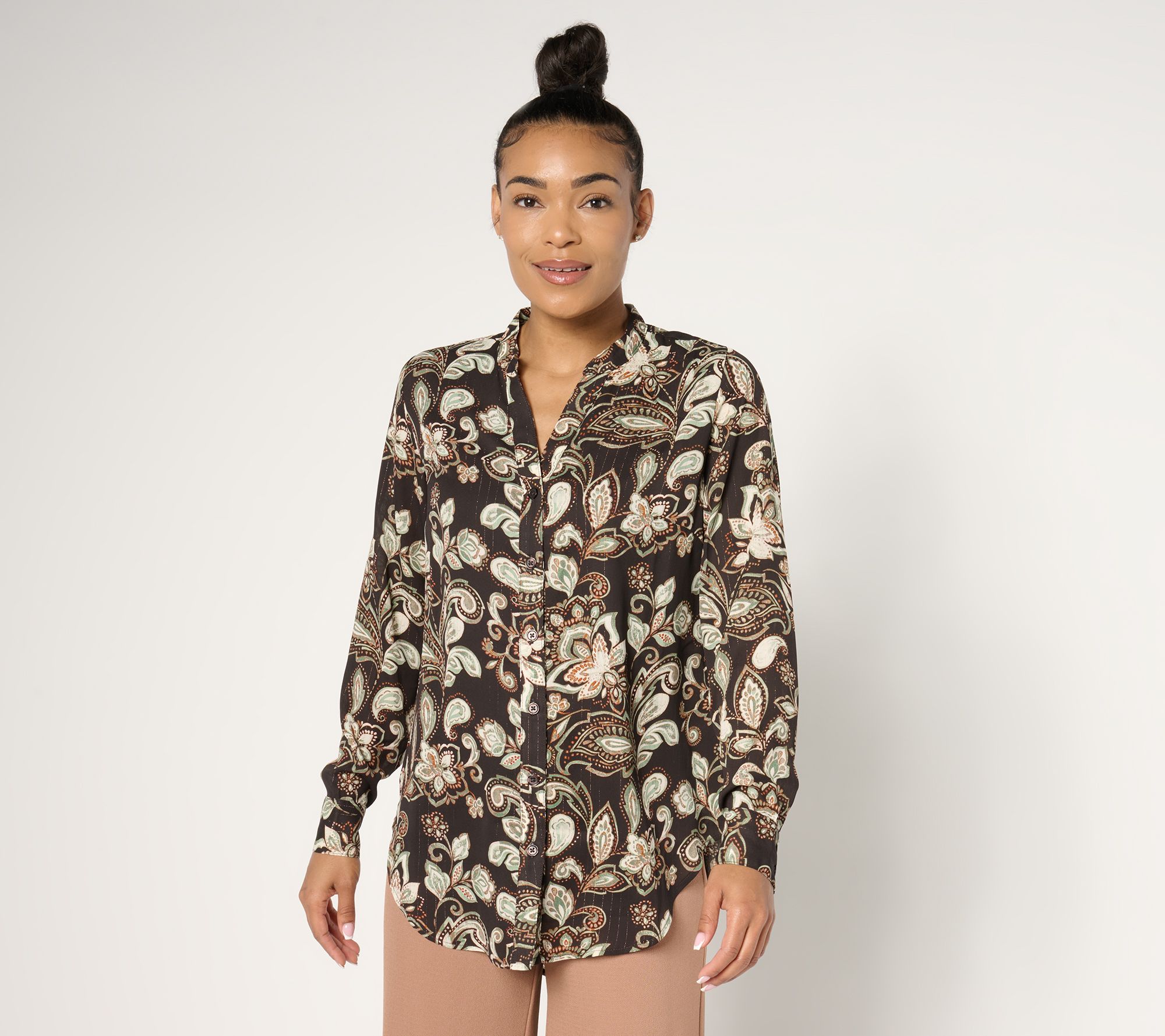 Every wardrobe needs that piece that says wow effortlessly and this tunic blouse does just that. After all, who doesn't love a pretty pattern and a flattering hi-low hem? Slip it on and let the good times scroll. From Belle by Kim Gravel.