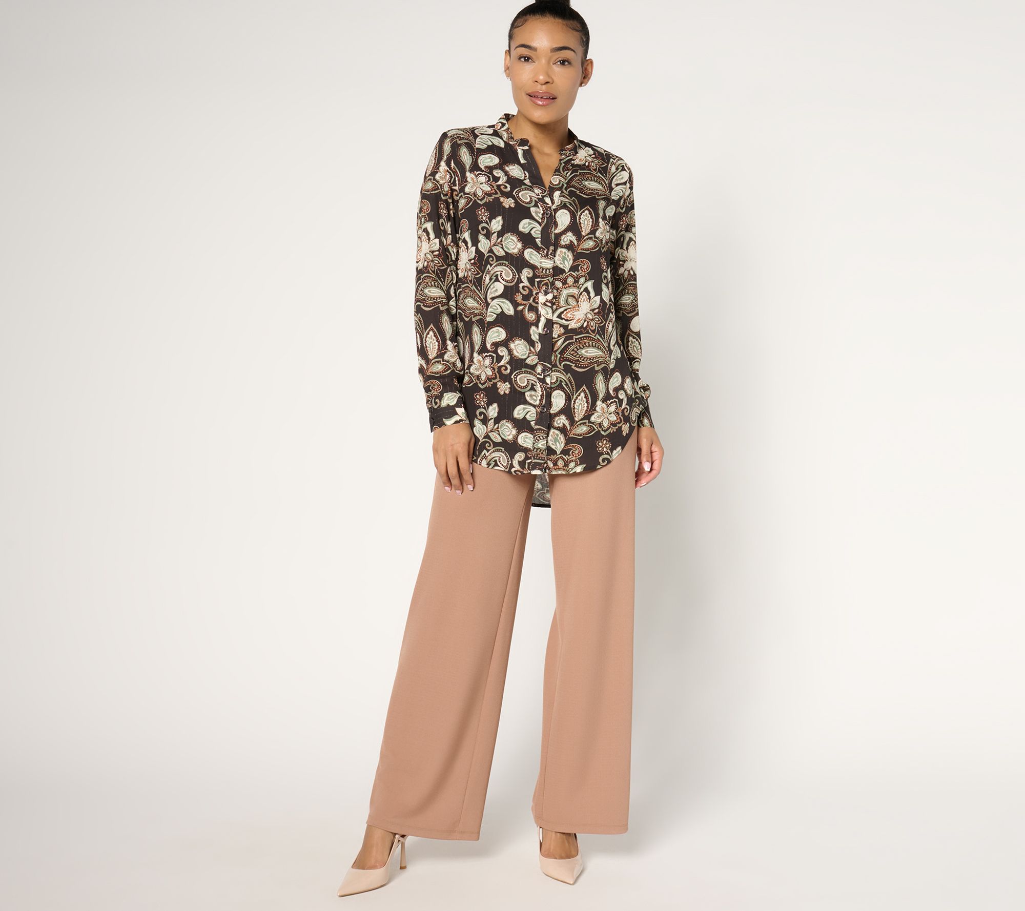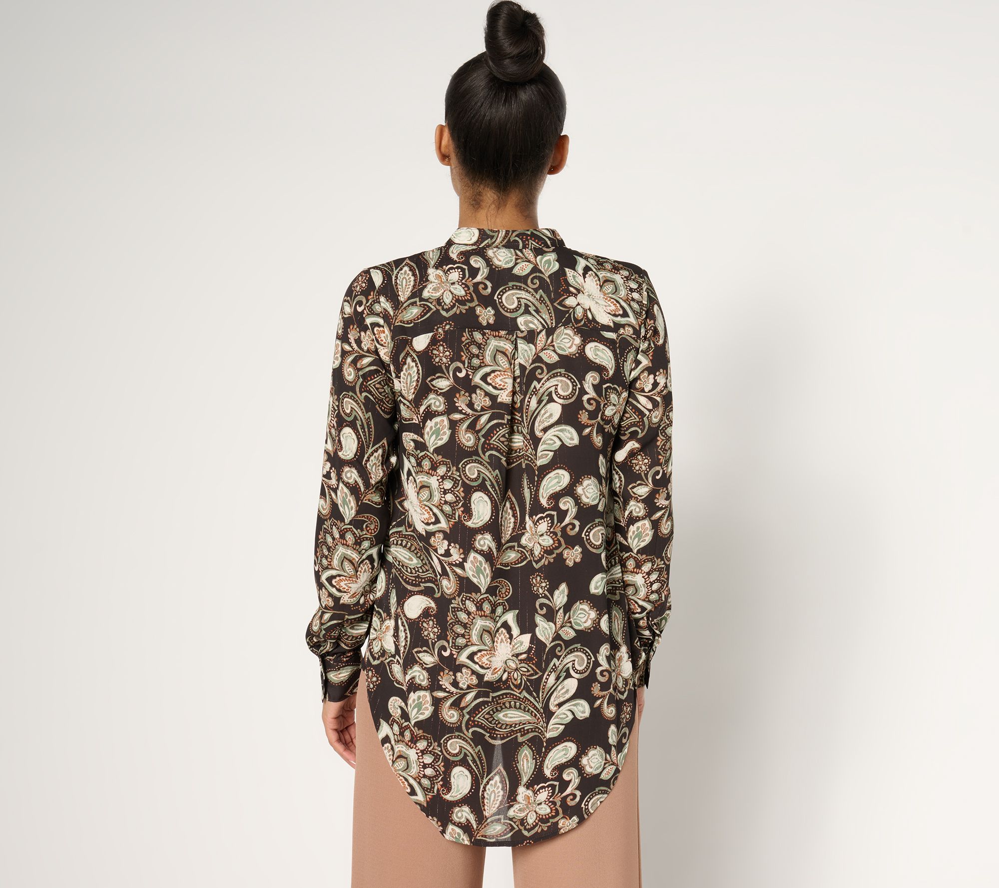 • Features: band collar, button front, long sleeves, hi-low hem, back yoke with inverted pleat