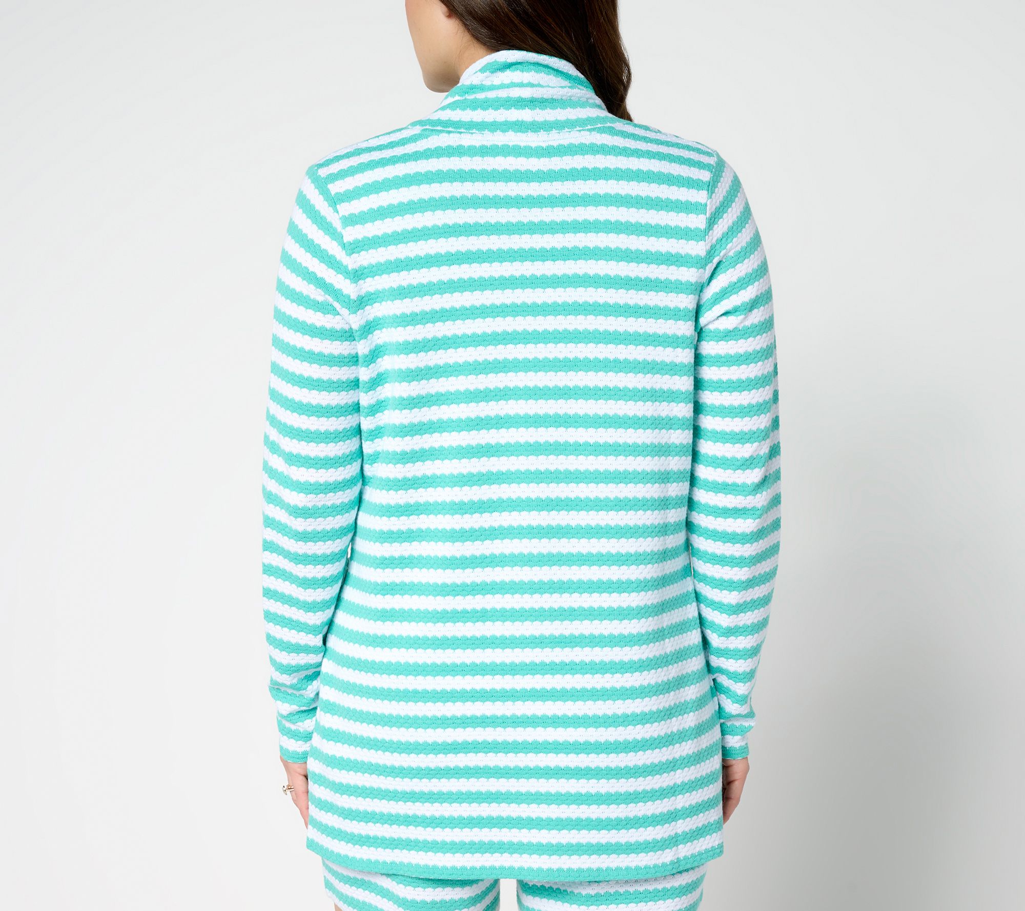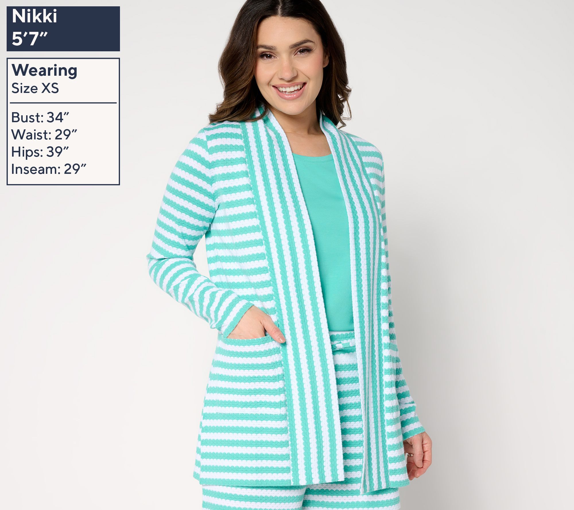 and nice. Cozy up in this splashy striped cardigan for a stroll by the shore or a trip to your favorite cafe. From Belle by Kim Gravel.