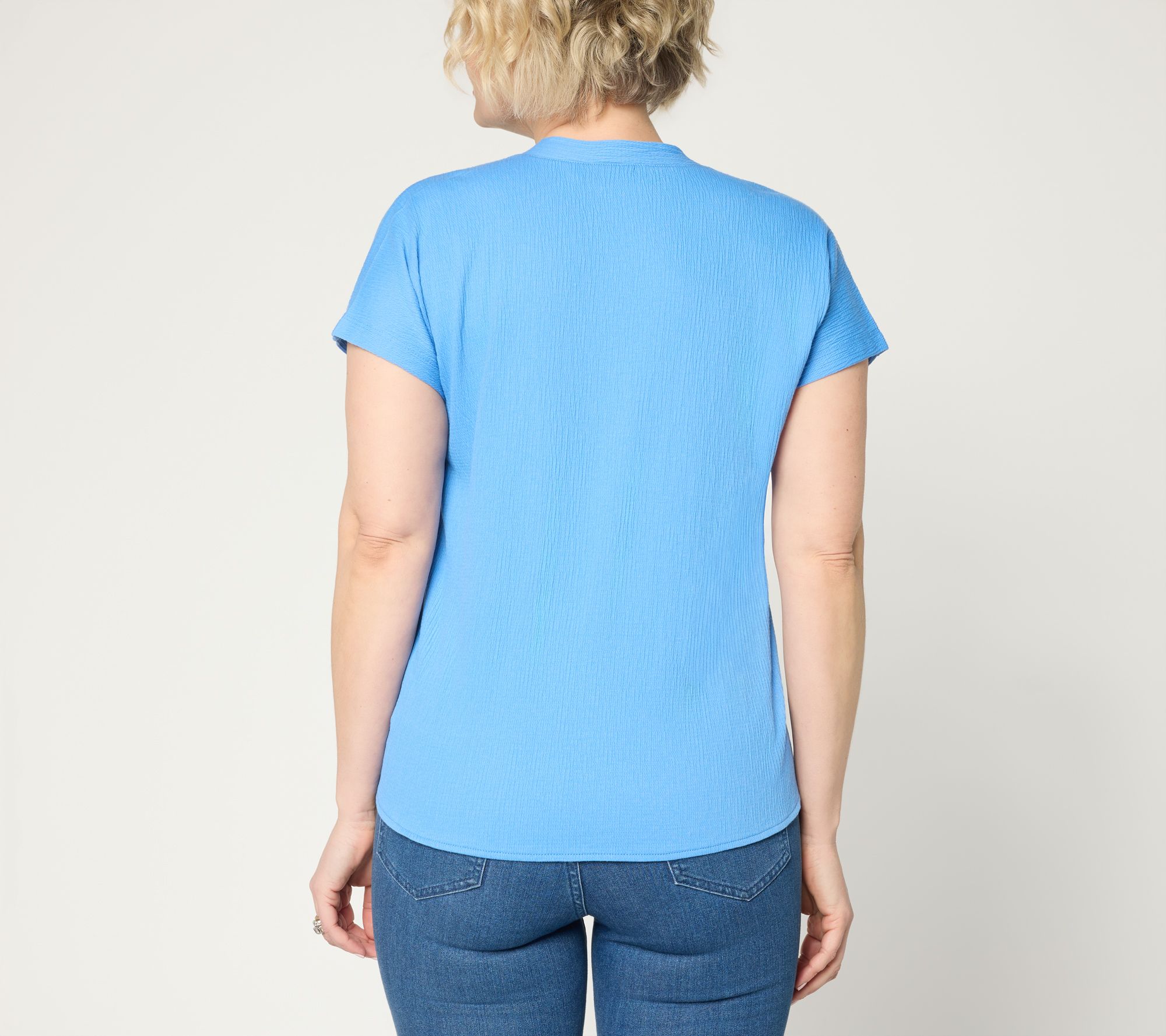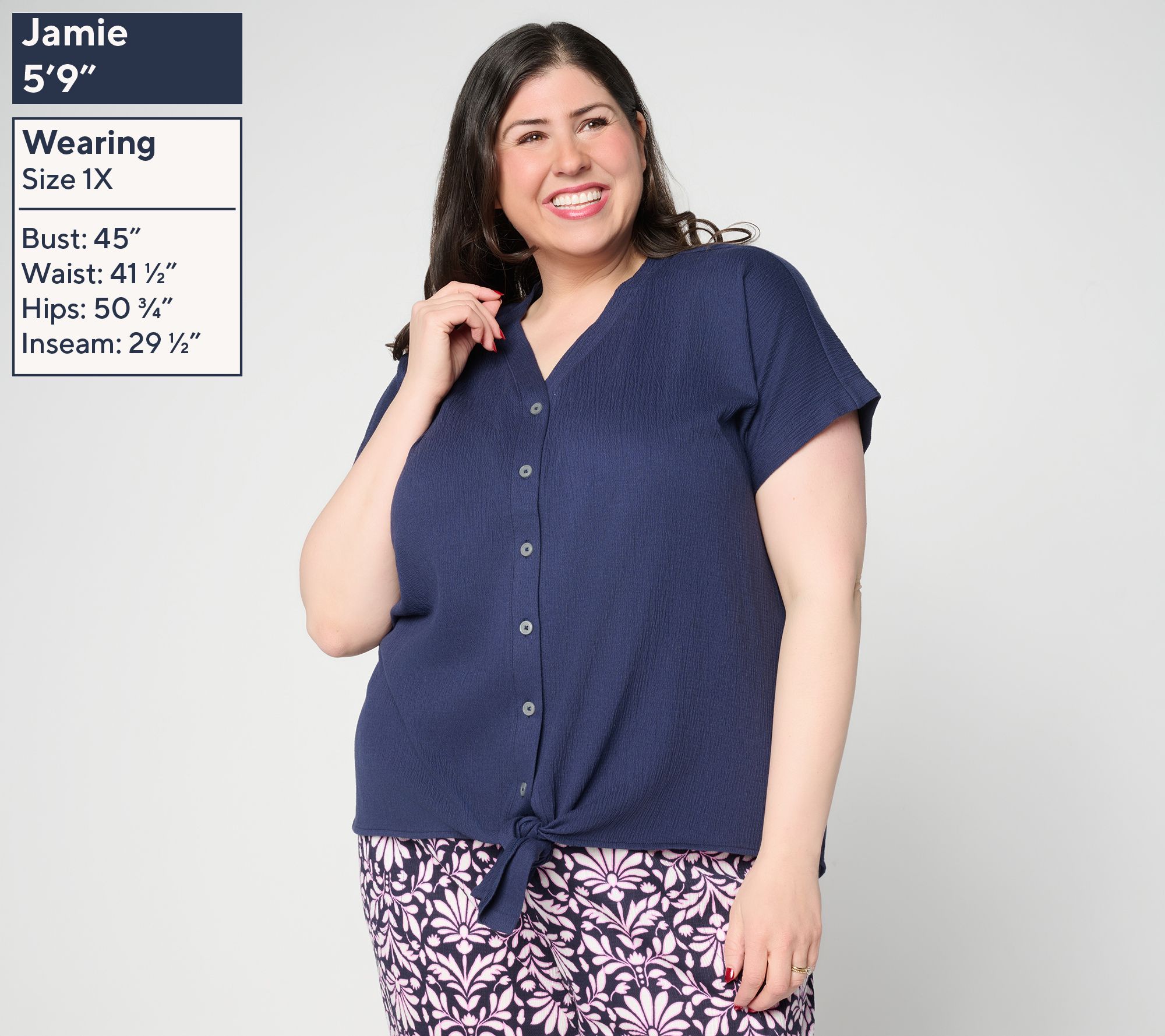 Heading out for weekend errands or pulling together a dinner outfit while traveling is easy with this button-front Packabelle knit top. A V-neckline and tie-front detail lend a fun touch, while the semi-fitted shape feels comfortable for all-day plans. From Belle by Kim Gravel.