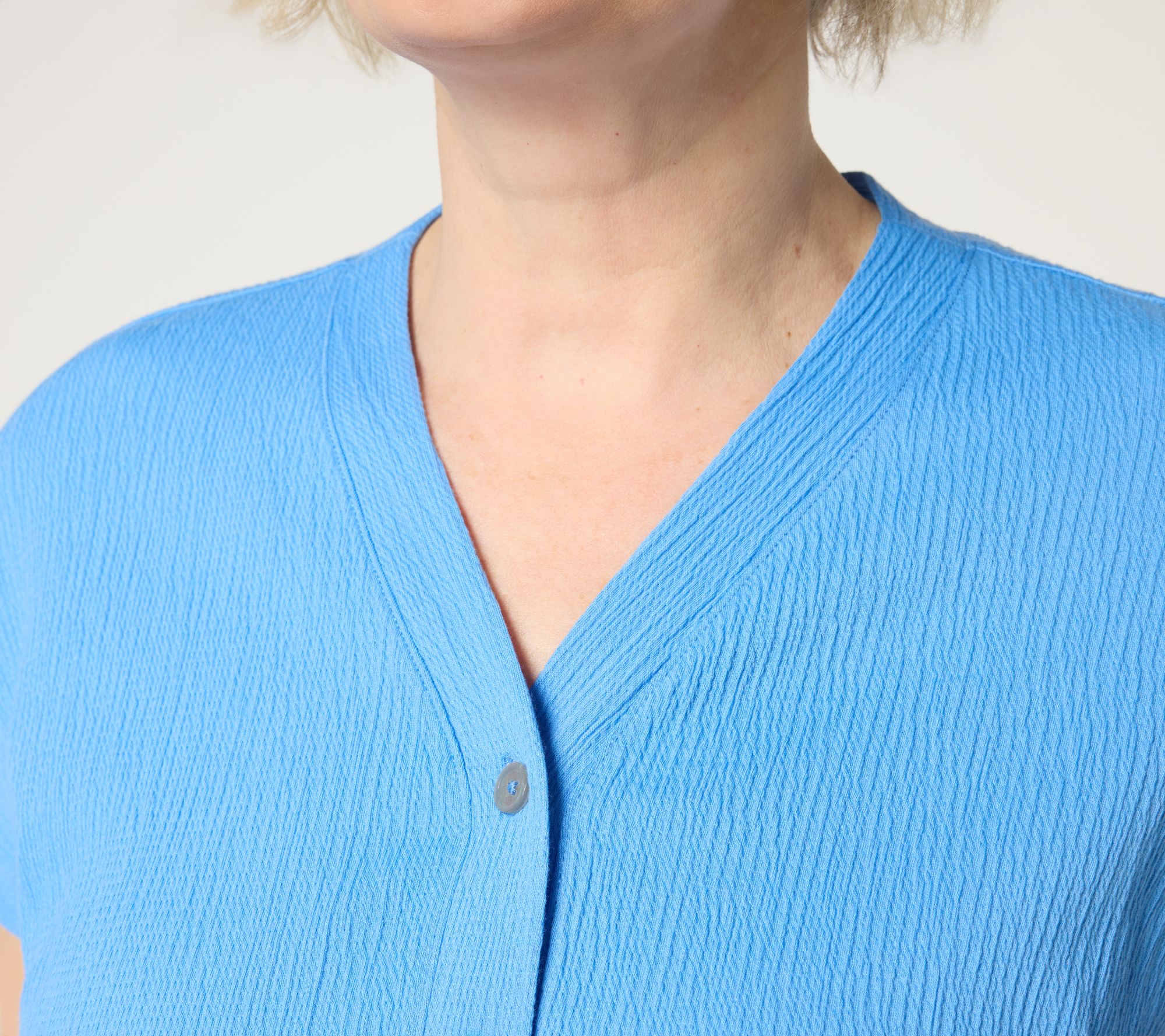 Features: short sleeves, V-neckline, button-front closure, tie-front detail, straight hem