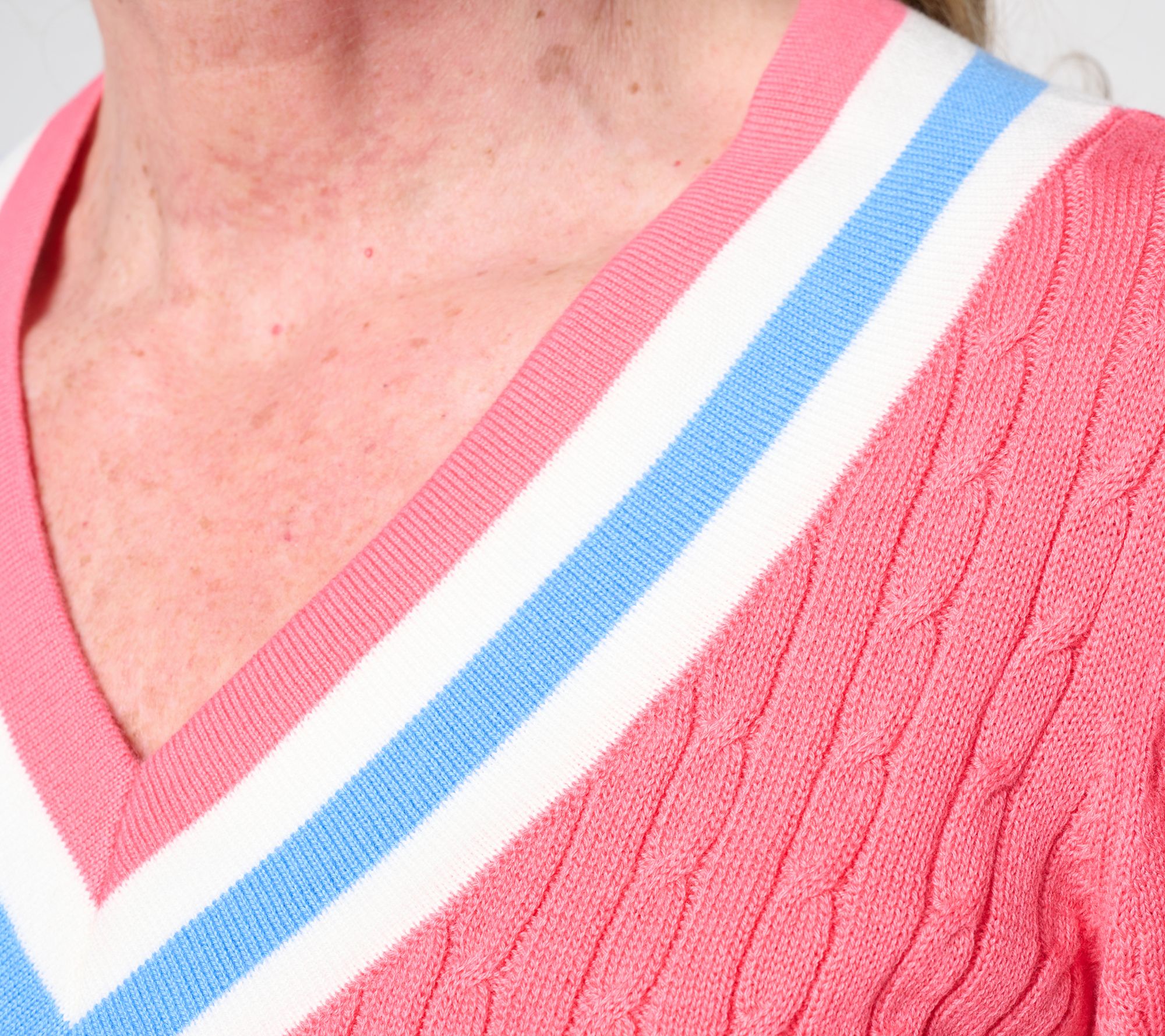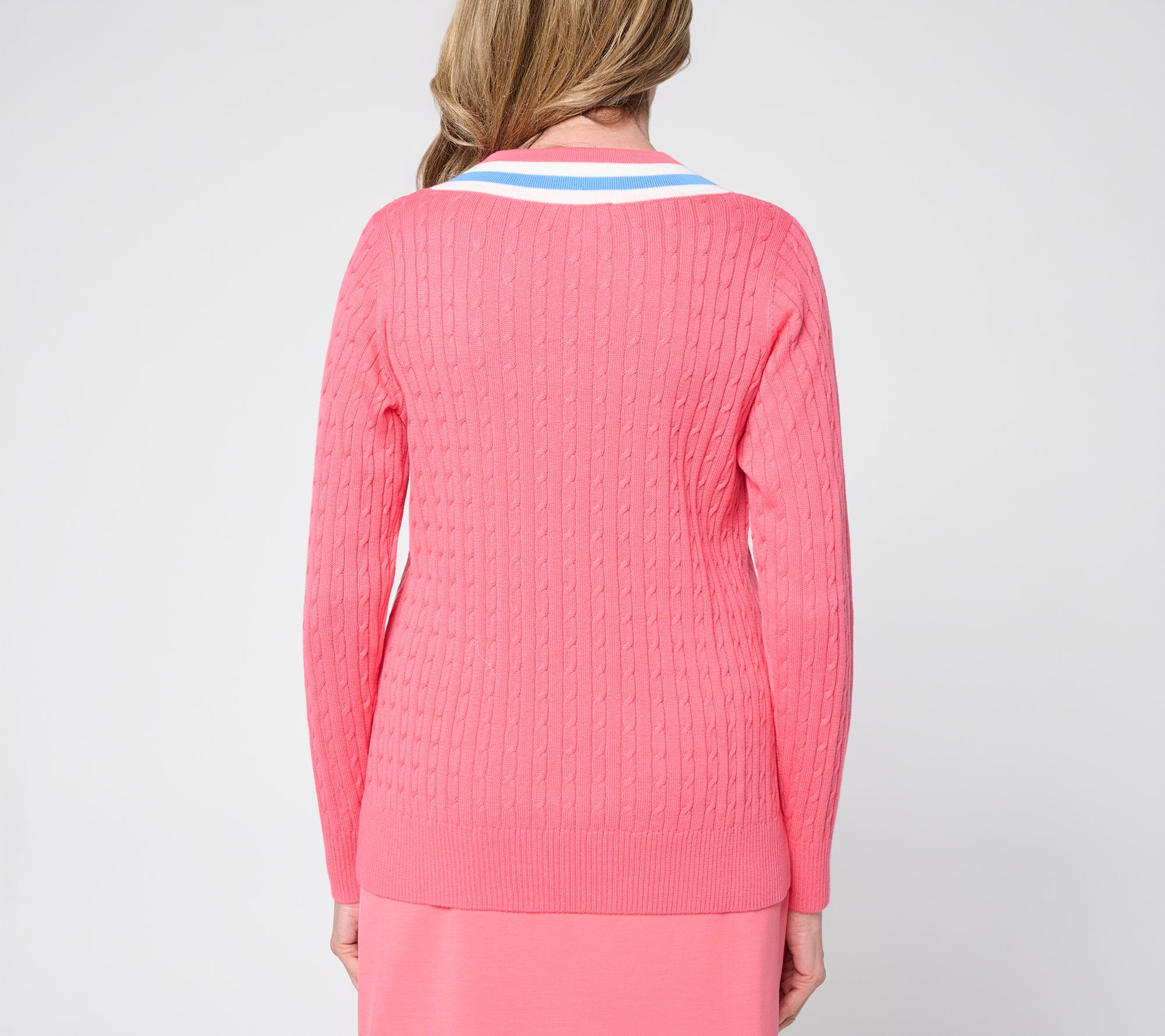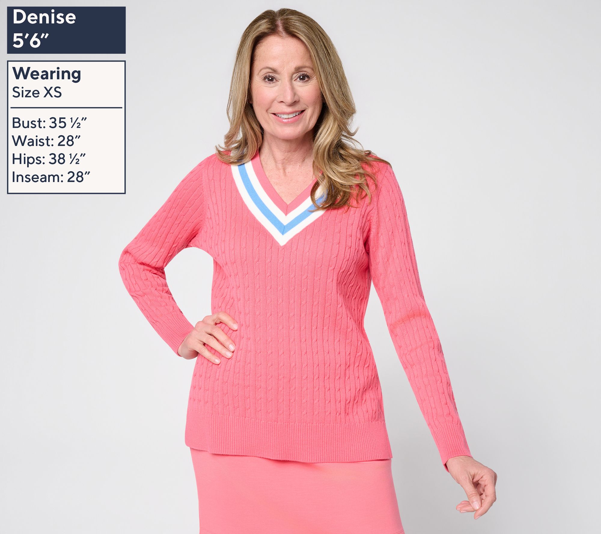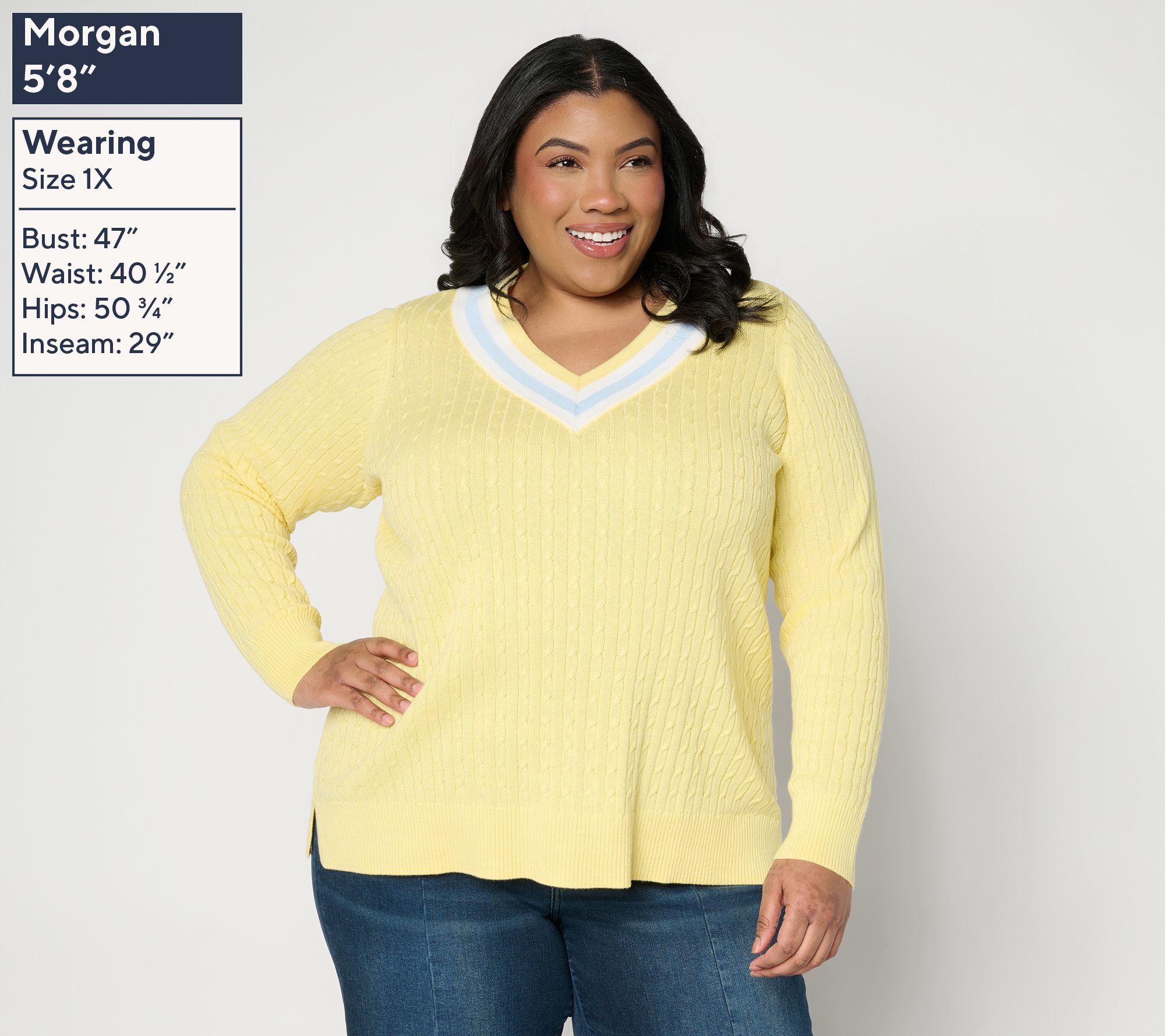 Chasing morning strolls or meeting up with friends feels effortless in this cable-knit sweater. The V-neck, straight hem, and side slits offer a classic yet modern twist, while long sleeves keep you cozy from season to season. From Belle by Kim Gravel.