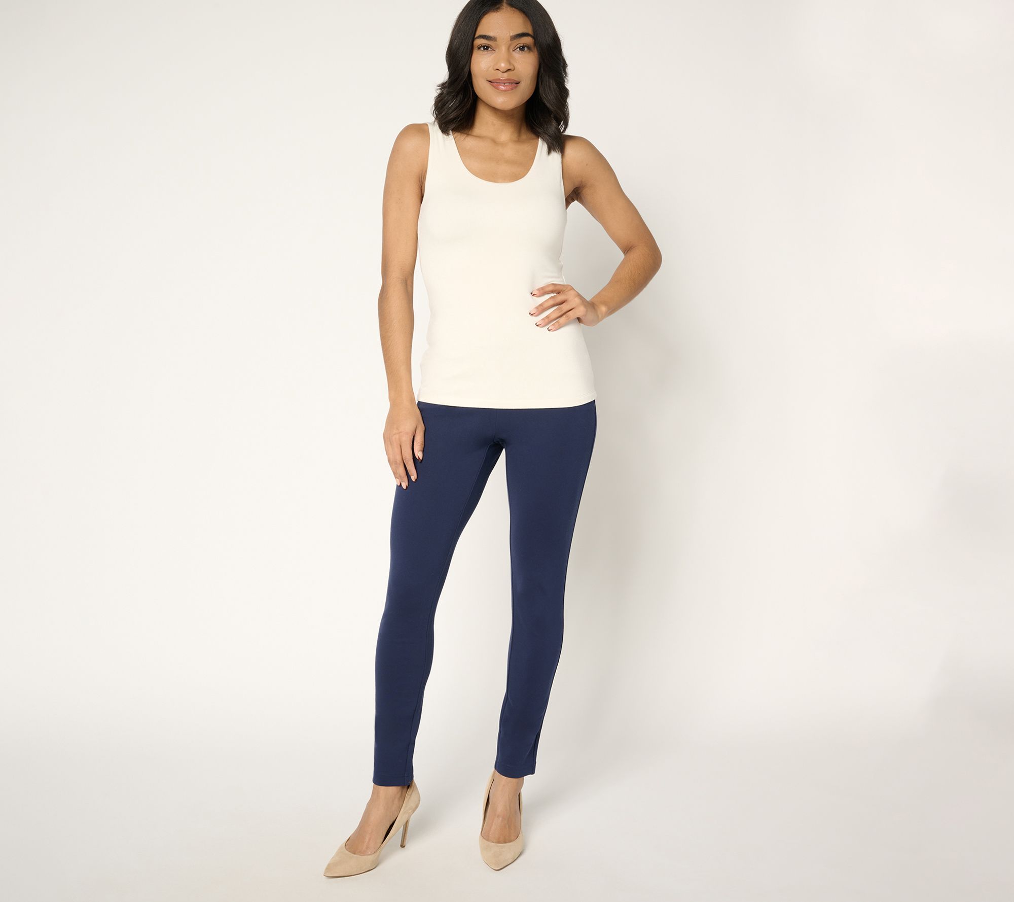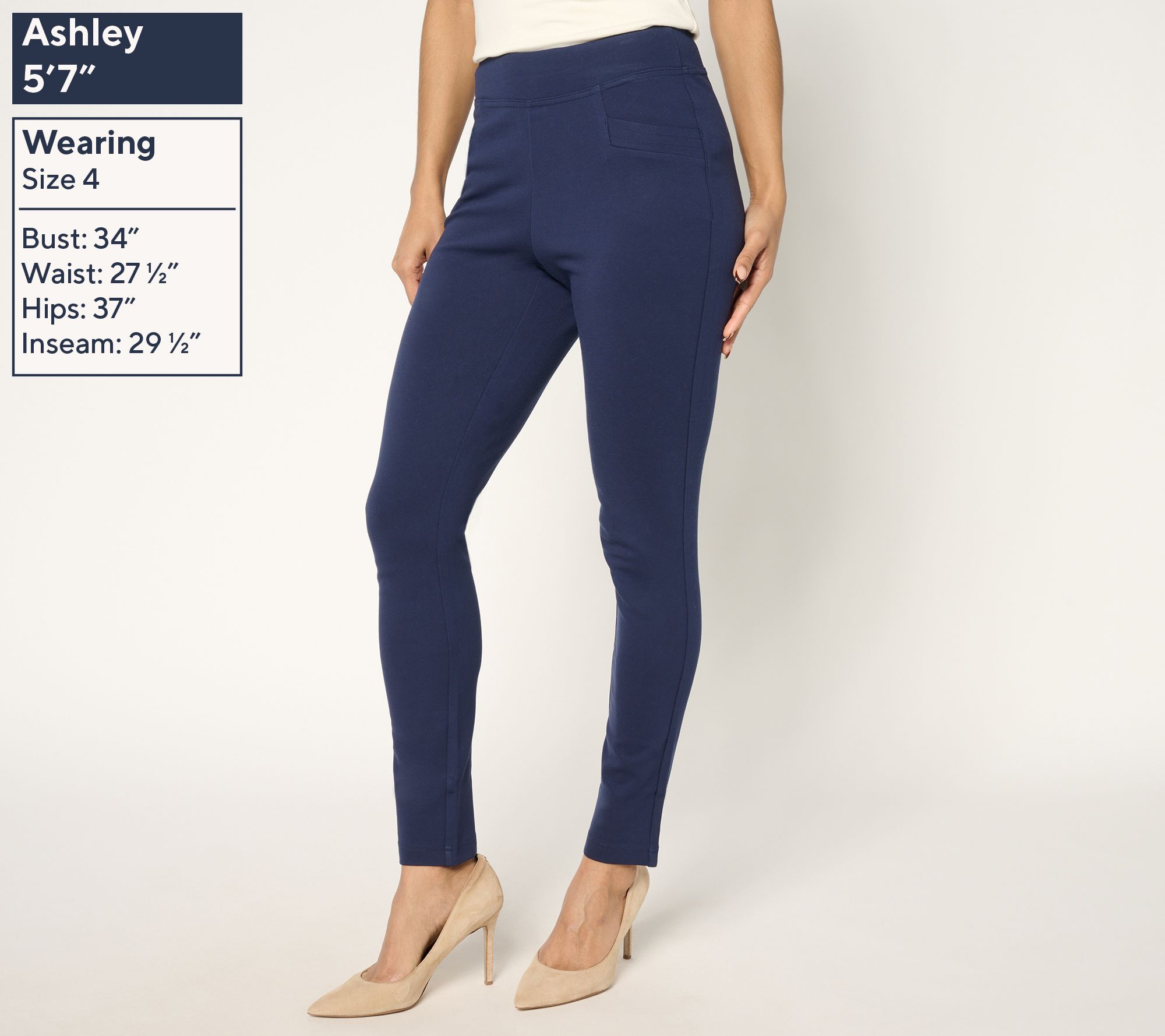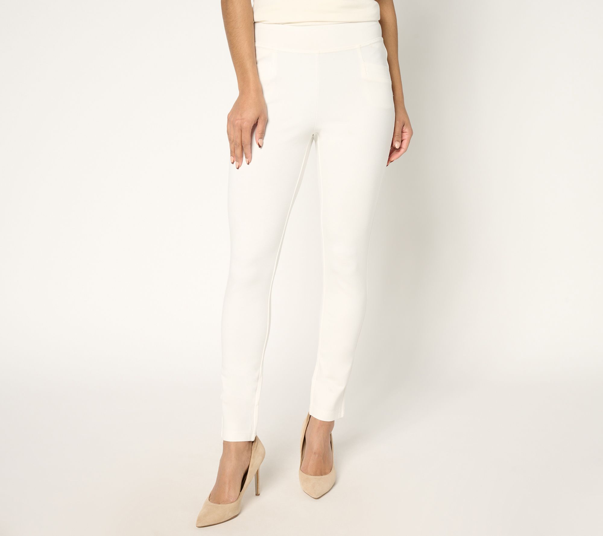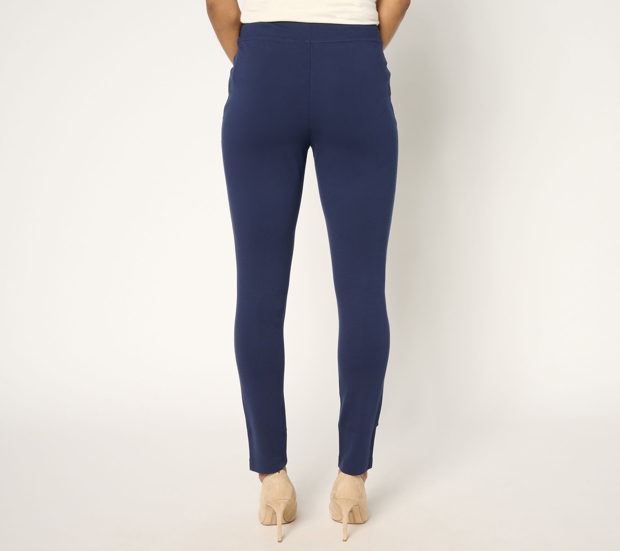Your wardrobe's MVP? These easy-pairing ponte leggings, ready and willing to go from casual errands to cozy couch time without a hitch. The triple topstitch details on the angled pockets add a stylish touch, while the comfortable knit fabrication stays in shape throughout the day. From Belle by Kim Gravel.