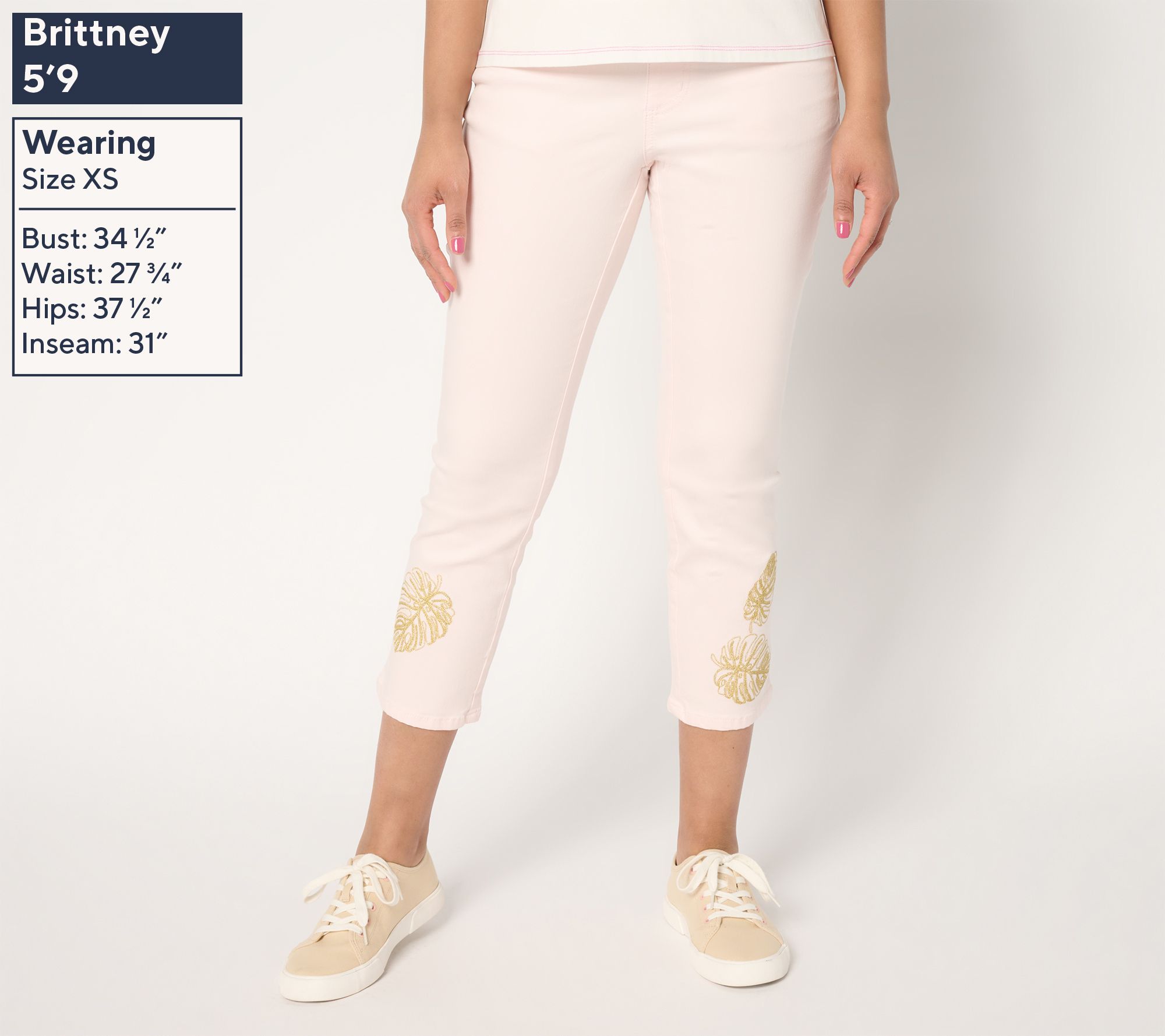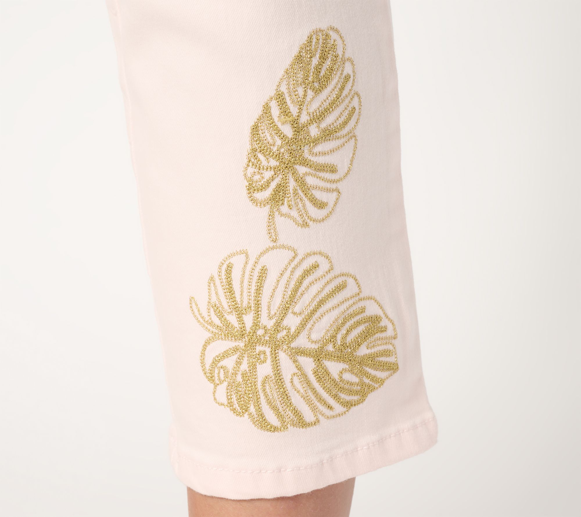 Elevate your casual days with these TripleLuxe Twill Gold Palm cropped jeans. Featuring chic embroidery at the leg opening, these pull-on jeans effortlessly blend comfort and style. From Belle by Kim Gravel.