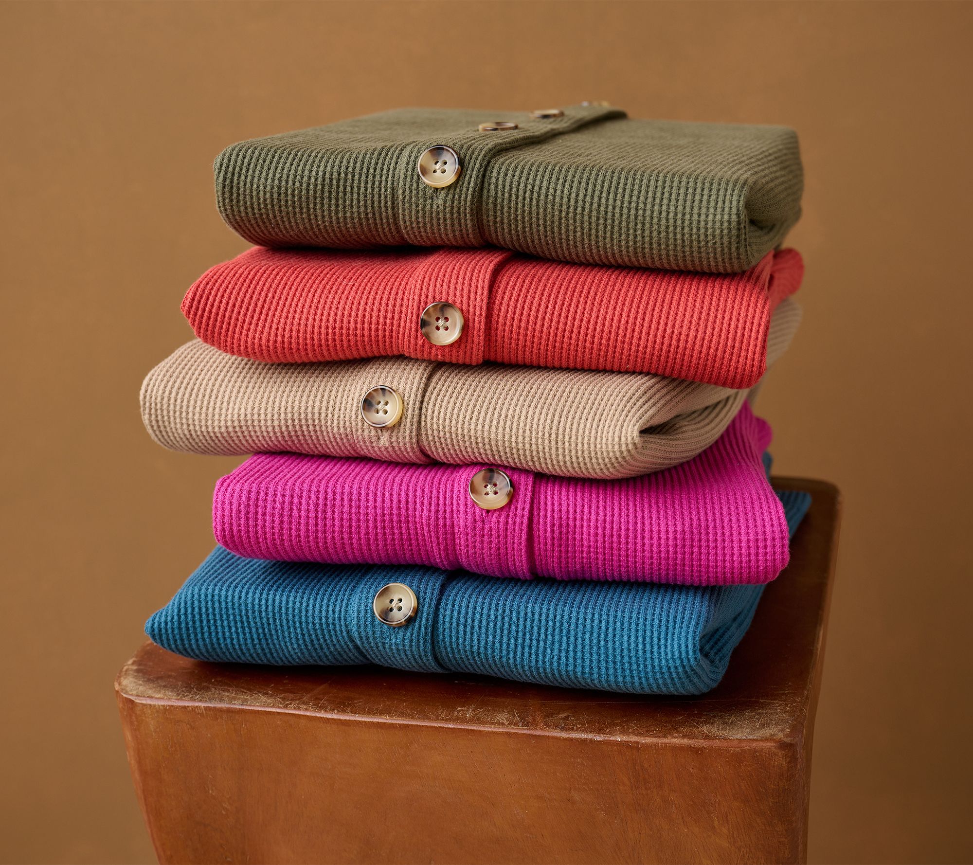 Features: waffle knit front and back yoke, jersey knit back, button-front closure, long sleeves, on-seam pockets, curved hem